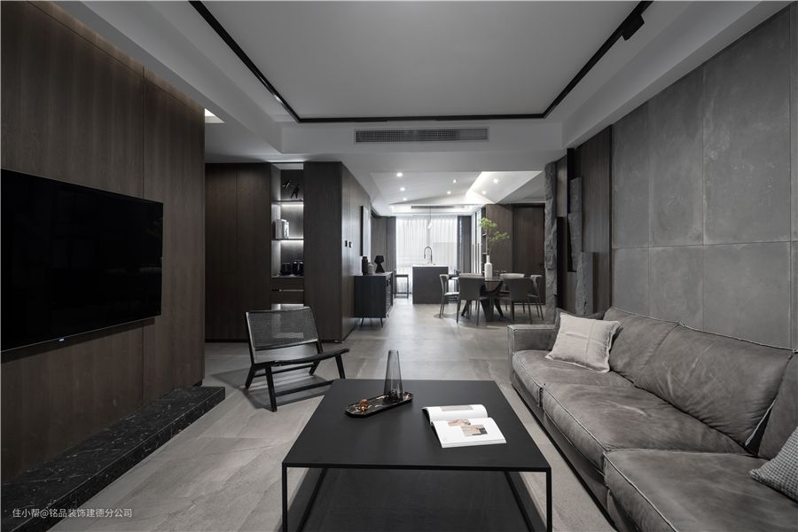客厅局部吊顶+无主灯谁,四周搭配黑色不锈钢金属片装饰,视觉上让空间显大了不少,也具备了一定层次感和格局。结合业主对家的期待,阳台利用大落地窗布局视野上会通透不少,也方便了室内光线提升。 电视背景墙整体以木饰面设计,细线框装饰增加了层次感,显得更干净利落。靠阳台位置利用小壁龛收纳设计,可以放些小摆件或者书籍,点缀空间,增加一些生活气息。