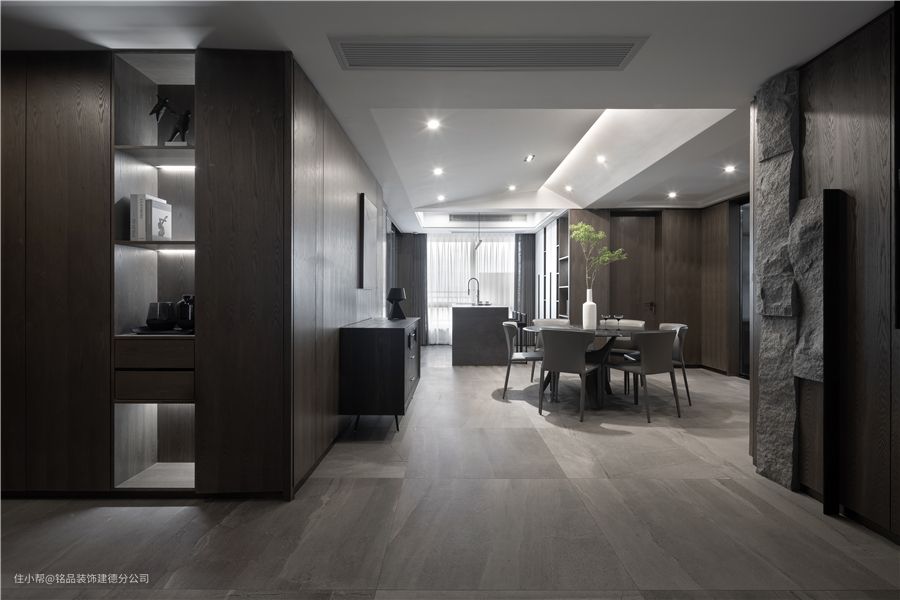 入户玄关区位于客餐之间,通过木饰面板材和灯光照明的运用,颜值与材质的舒适碰撞,营造出富有层次感,舒适柔和的空间环境。鞋柜无把手设计更简单利落,中间部分采用开放式陈列柜辅助灯带照明,美观又实用。