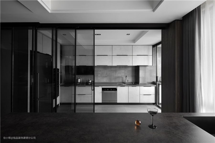 四联动玻璃推拉门,厨房门关上的时候就是一个独立空间,当打开的时候就又是全开放式格局了。这种风格在近几年来更受年轻人的欢迎。 厨房采用L型动线布局,增加了操作空间,并且厨房和阳台之间也采用玻璃推拉门隔断,视觉上也就显得更加宽敞了。