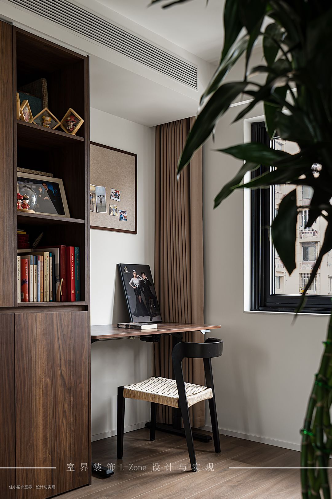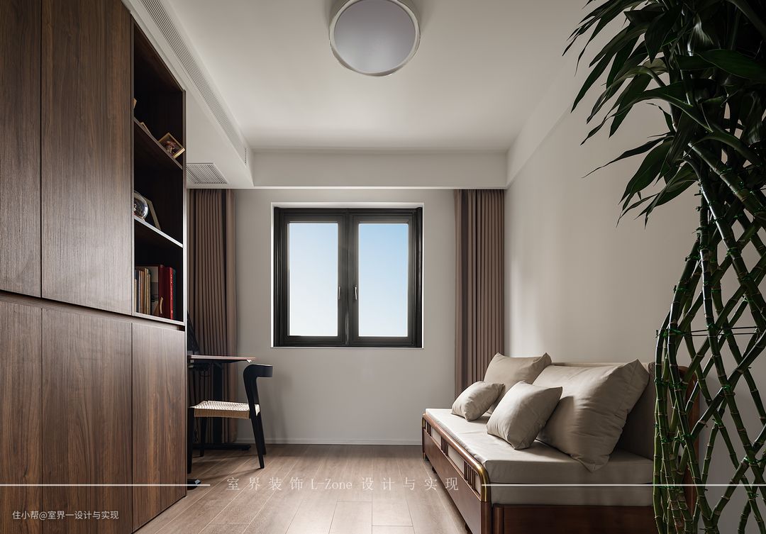 ☞室界装饰L-Zone设计与实现 ❶与客厅相邻的书房区域,我们将其作为一个多功能区使用,沿用客厅胡桃木柜子的设计,在这边打造了通体柜和书桌,一张沙发床也放置于此,它既可以是业主在家工作之余的休憩之处,也能作为偶有客人来访的客房使用。