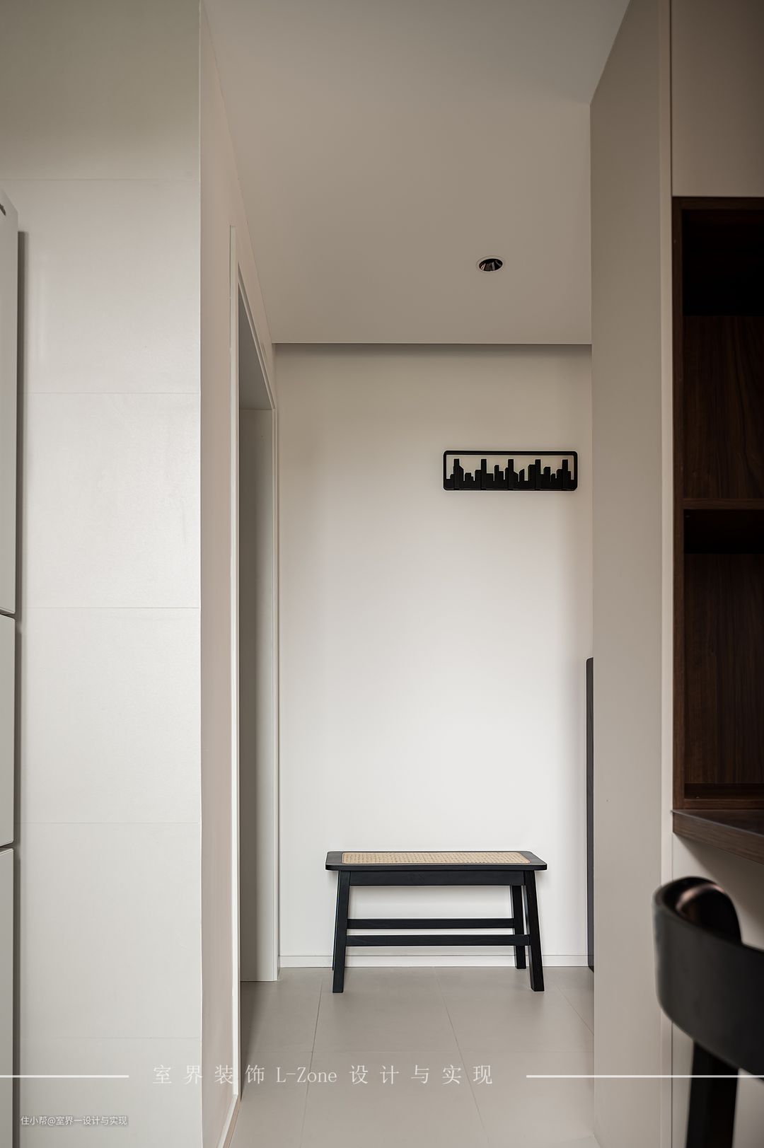 ☞室界装饰L-Zone设计与实现 ❶餐厅则与厨房岛台平行,也作为厨房与洗手台区之间的隔断。 ❷悬浮式的餐桌设计,即使运用大量的深色木材,也让视觉变得轻盈不厚重,餐桌一侧靠着卫生间墙体,另一侧则是做顶天柜体,来提供更多的餐边储物空间。 ❹甚至在餐椅的选用上也别出心裁,以藤编麻绳做成的餐椅,中央的部分镂空和其素雅的颜色让画面更为和谐。