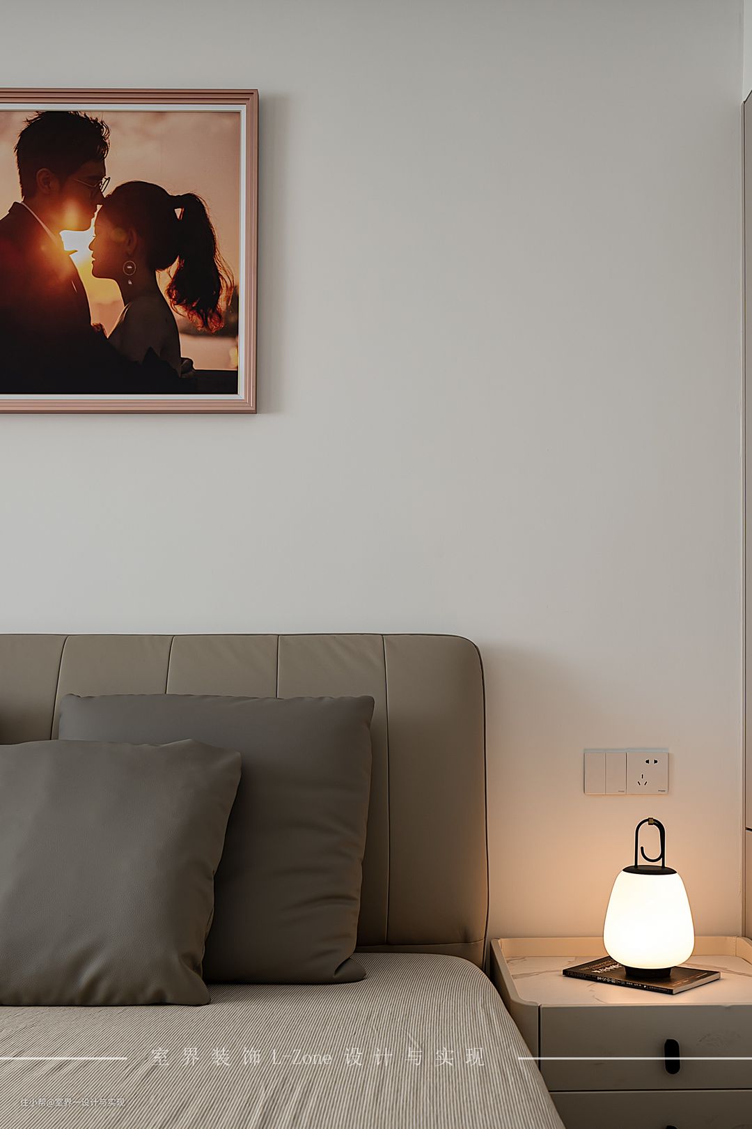 ☞室界装饰L-Zone设计与实现 ❶主卧拥有独立的阳台,做了深色窗帘隔断,来保护隐私。而阳台区域则是白色纱窗,来提供充足的光线。 ❷卧室内部做悬浮吊顶,四周都嵌入了氛围灯带,显得十分温馨,面向床铺的墙面作为投影幕布区使用,需要的时候瞬间就能成为家庭影院。 ❸地面沿用深色木地板铺设,作为空间的基础底色。家具便自然而然的以淡色系为主,平衡画面感。