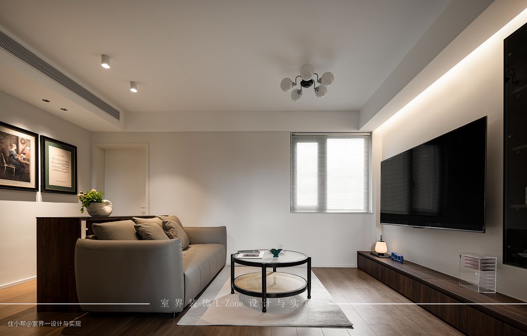 ☞室界装饰L-Zone设计与实现 ❶沙发后柜做了部分镂空设计,来让视觉更加通透,除了担任起储物及装饰的功能之外,也隐喻着通往卧室的动线。 ❷客厅的装饰很简约,在电视墙一处,抛去复杂的背景设计,以一个玻璃展示柜和胡桃木的电视桌构成整个功能区,胡桃木深沉的颜色和丰富的纹理让这个画面不再显得单调。并且在横梁后面还嵌入了照明灯,即使没有其他装饰的点缀,也能让其富有设计感。 ❸在家具方面,我们选择了一款灰色意式极简沙发,简约的造型搭配双层圆形玻璃茶几,顺着窗外的暖阳照入,在这待上一个下午,阳光甚好,安之若素。 ❹客厅与书房之间用推拉门隔开,平常在打开推拉门时,书房的区域也成为了客厅的一部分 ❺ 地面采用木地板通铺形式,使其成为一体,让客厅空间更为开阔,简单的推拉门设计便让空间可以更加灵活运用。