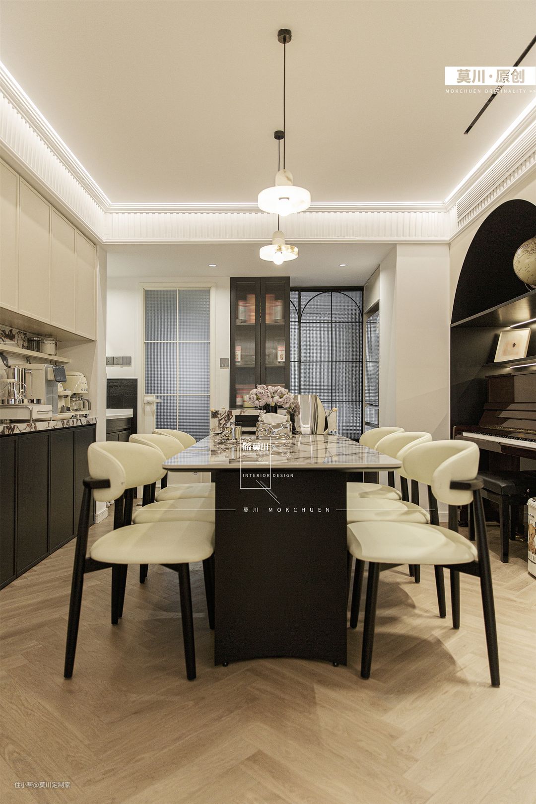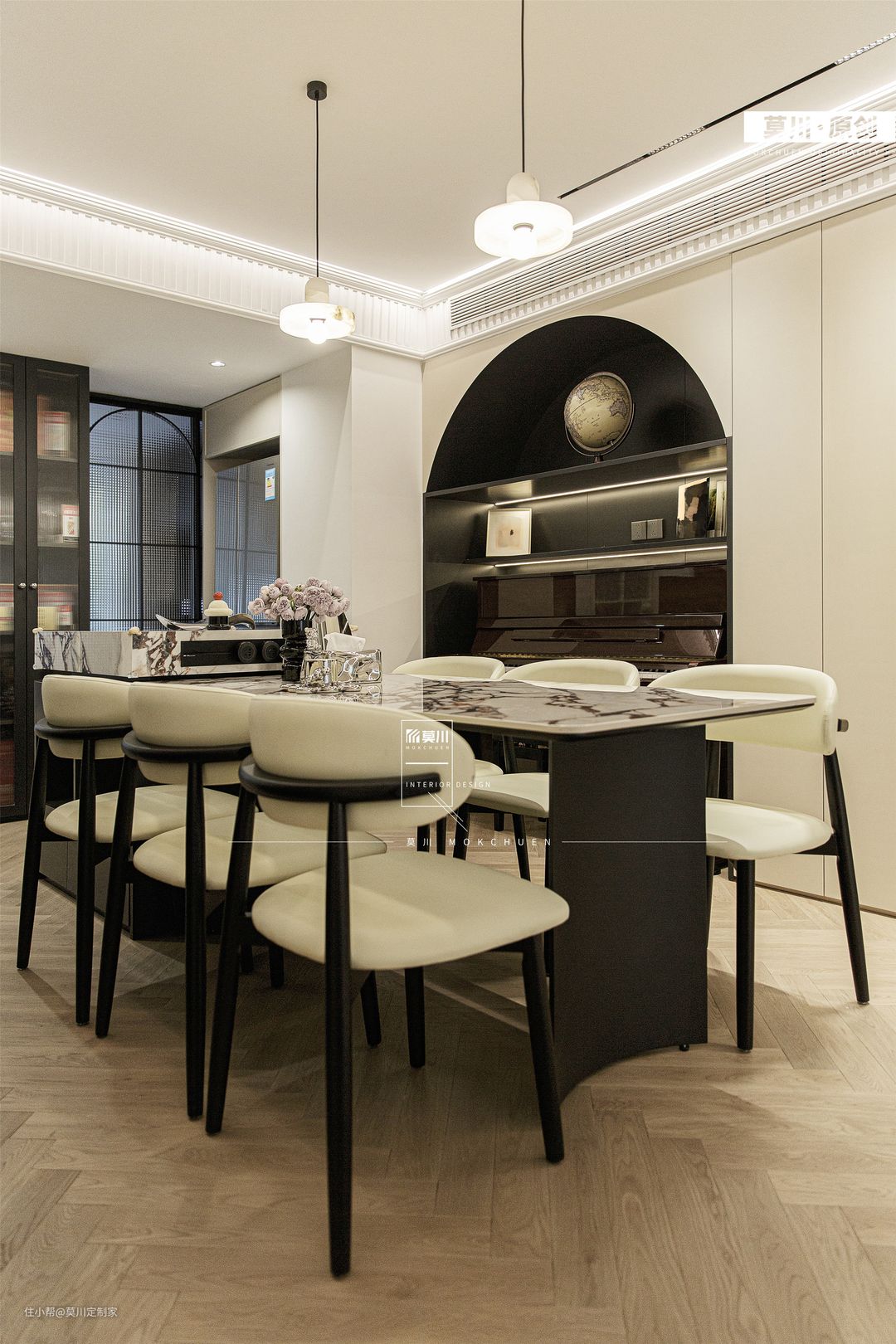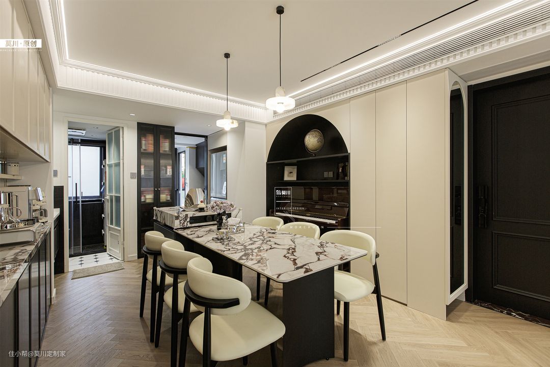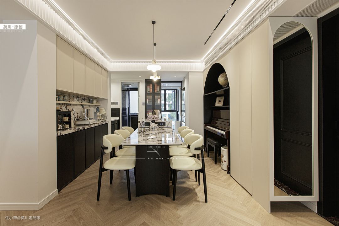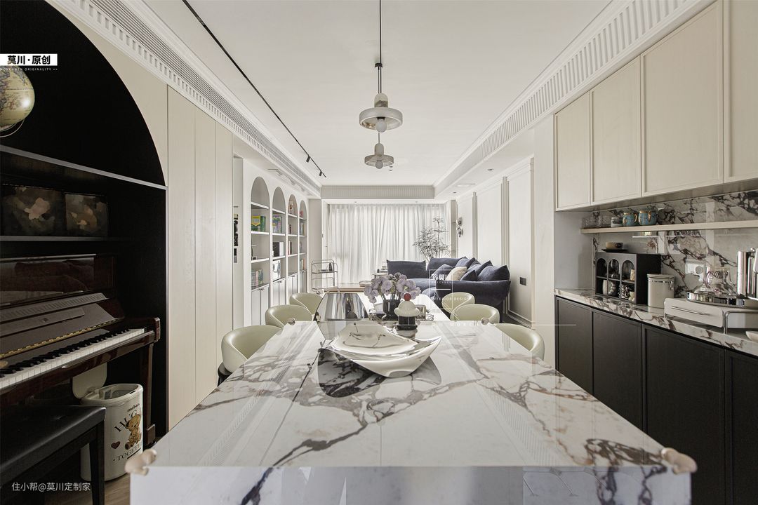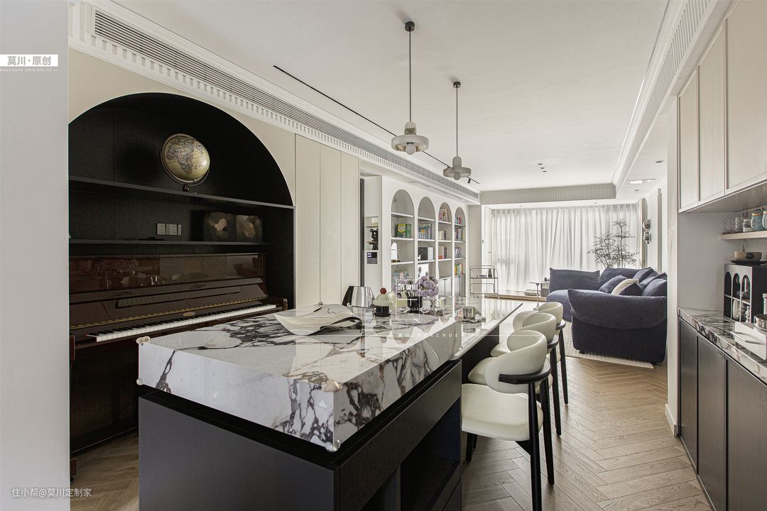 1.为解决餐厅采光不足的问题,设计师拆掉了立体墙面,从而增强了用餐空间的通风与采光; 2.岛台延伸至餐桌,包括水吧区,均用了宝格丽岩板,搭配黑白双色餐边柜,材质与灯光的配合,氛围感十足; 3.餐厅一角,钢琴落座于拱门之间,分毫不差的嵌入,这里便是男女主人的音乐舞台。