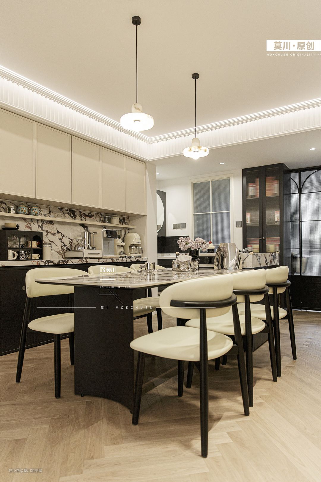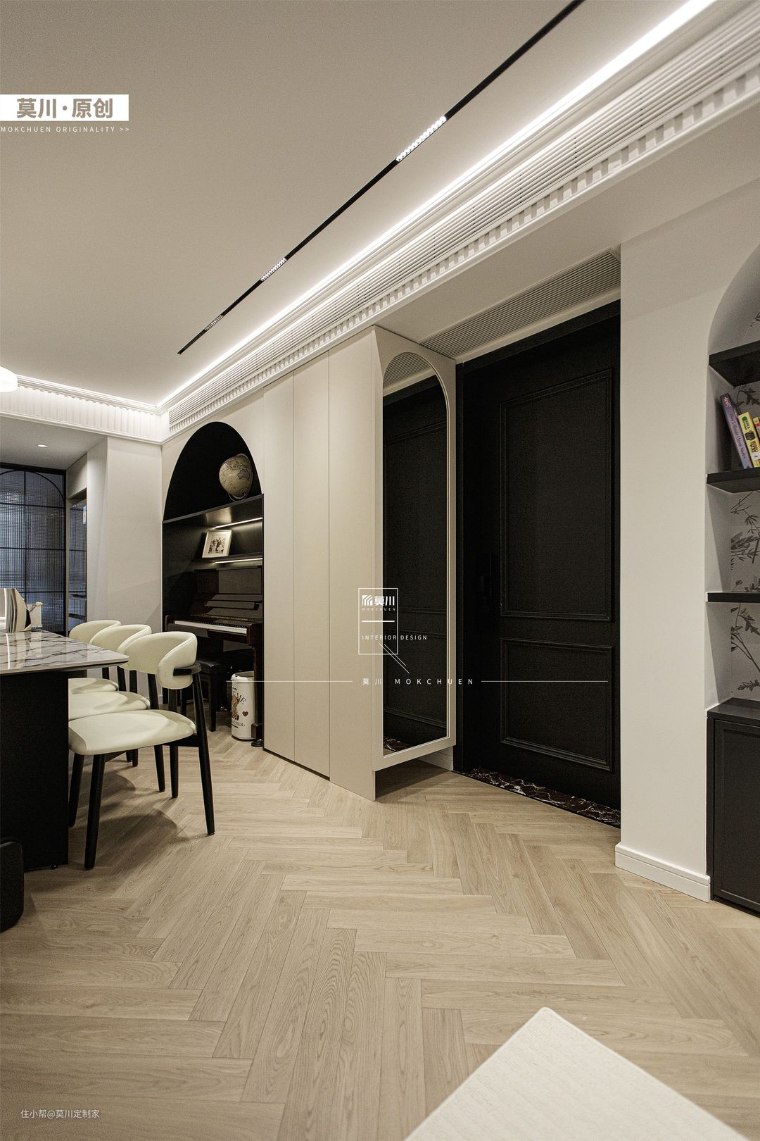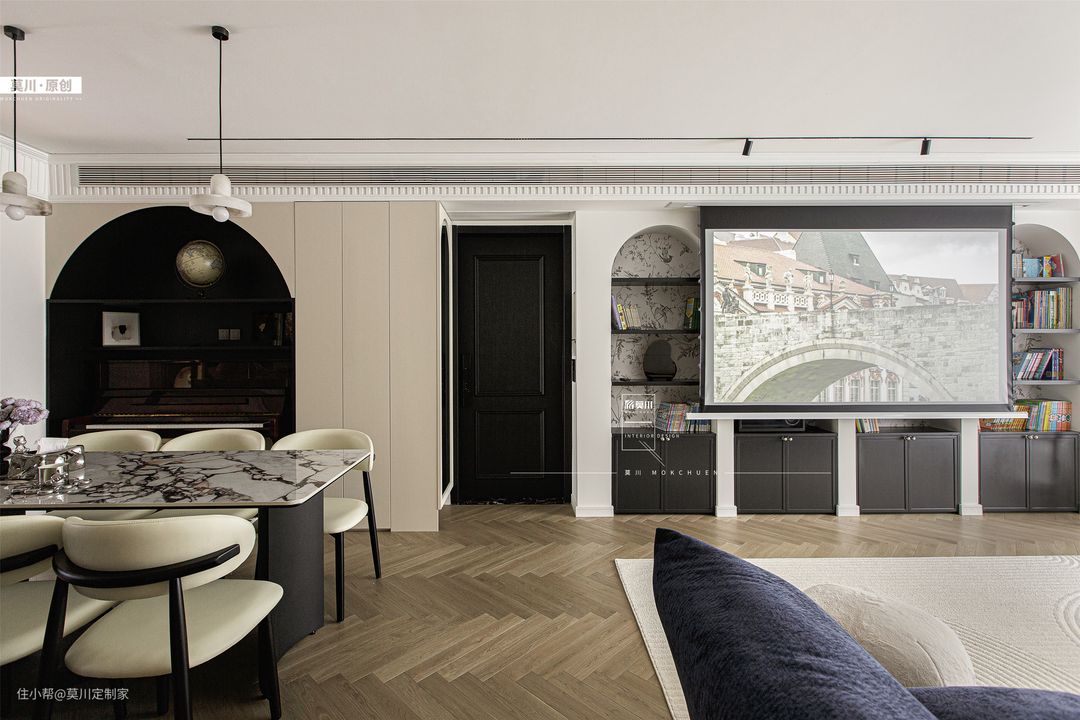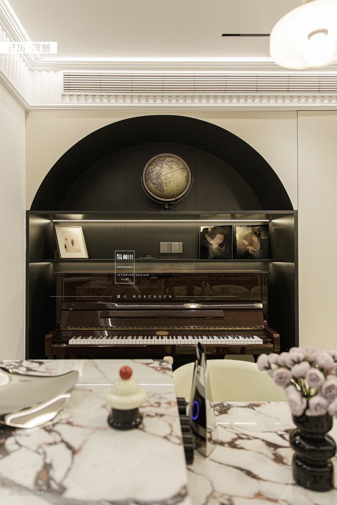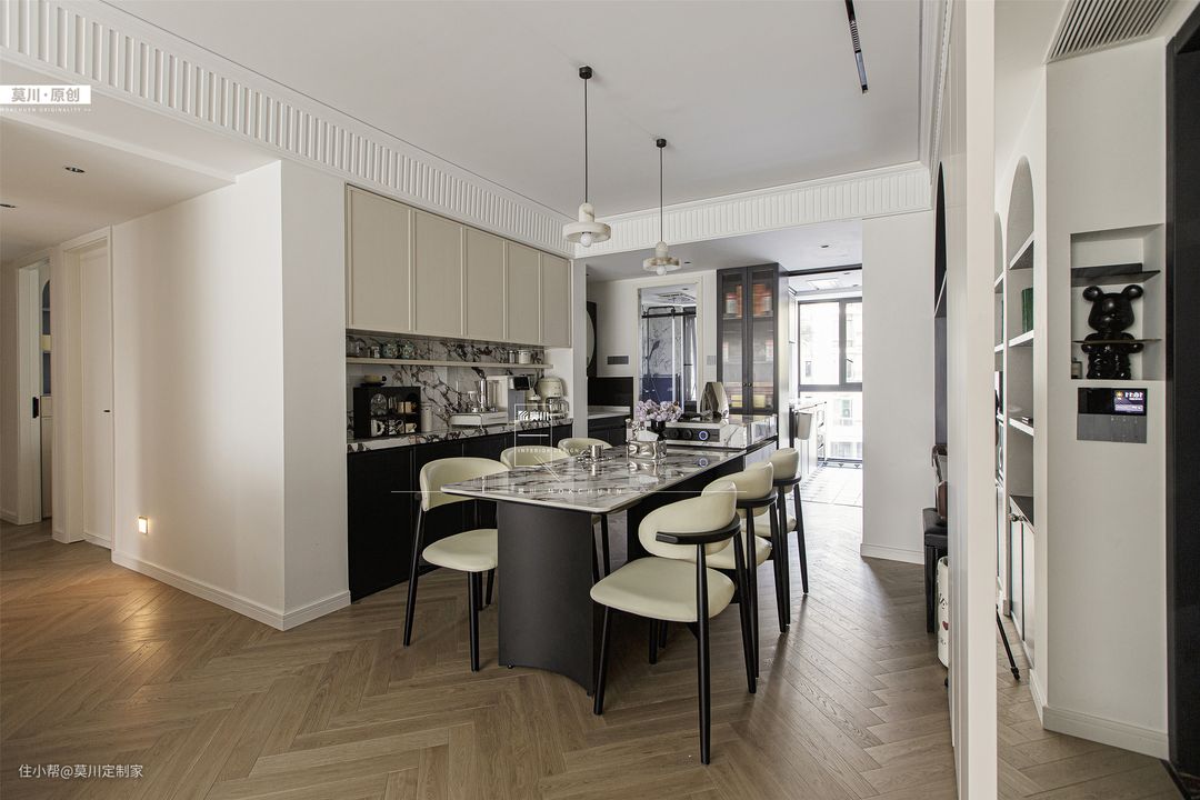 1.为解决餐厅采光不足的问题,设计师拆掉了立体墙面,从而增强了用餐空间的通风与采光; 2.岛台延伸至餐桌,包括水吧区,均用了宝格丽岩板,搭配黑白双色餐边柜,材质与灯光的配合,氛围感十足; 3.餐厅一角,钢琴落座于拱门之间,分毫不差的嵌入,这里便是男女主人的音乐舞台。