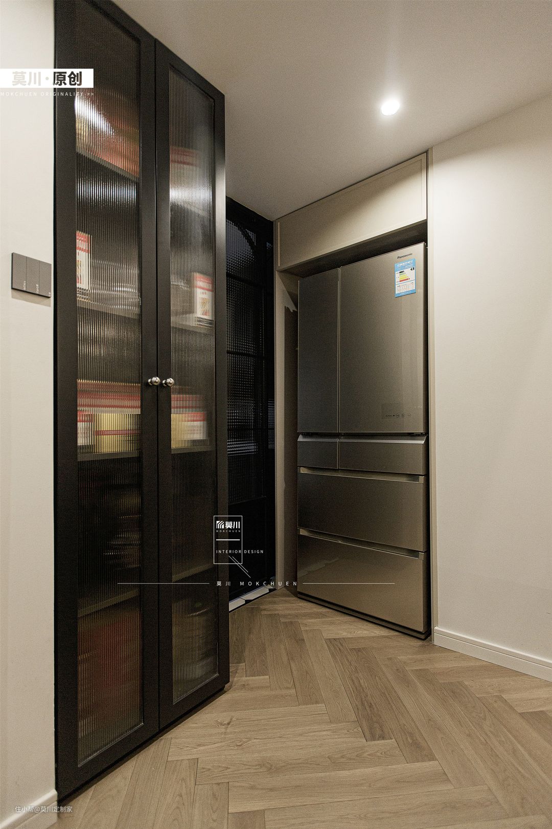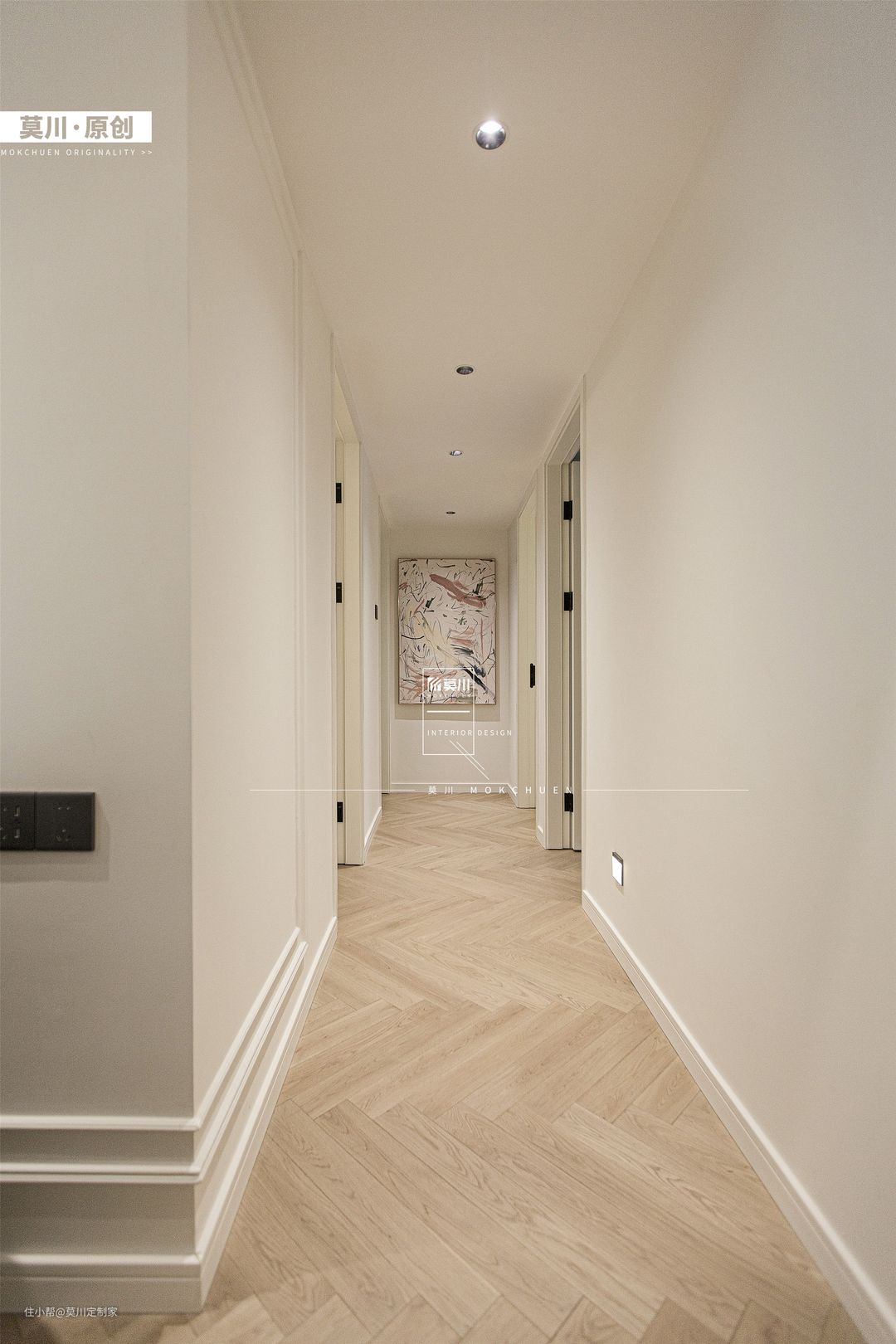 1.走廊承担起了连接各个空间的桥梁,使得开放性的格局,生活与休闲两不误,功能分区明显但是又不影响互动性; 2.素净的墙面,筒灯提供照明的同时,又营造了氛围感,搭配鱼骨拼接木地板,起到温润而不失质感的效果。