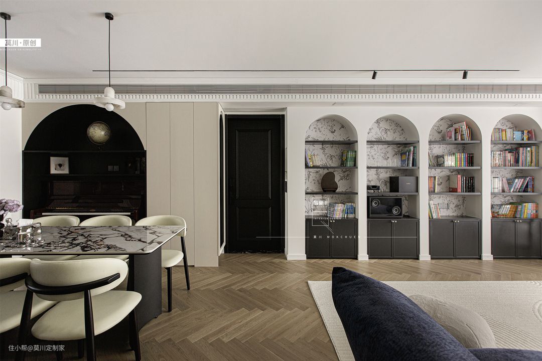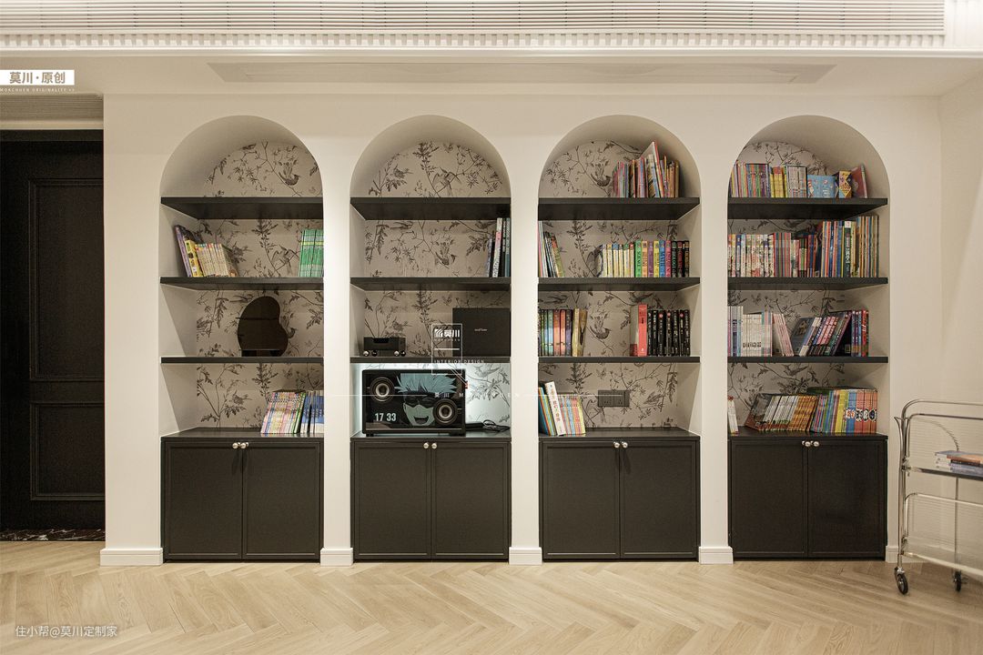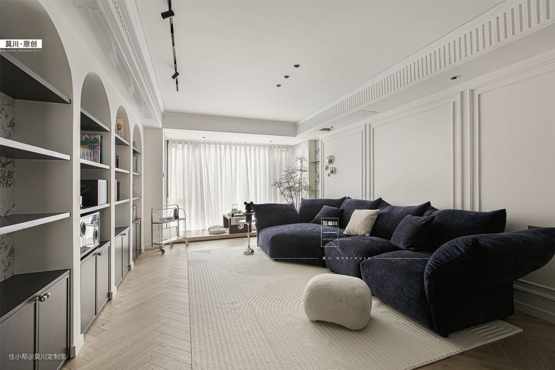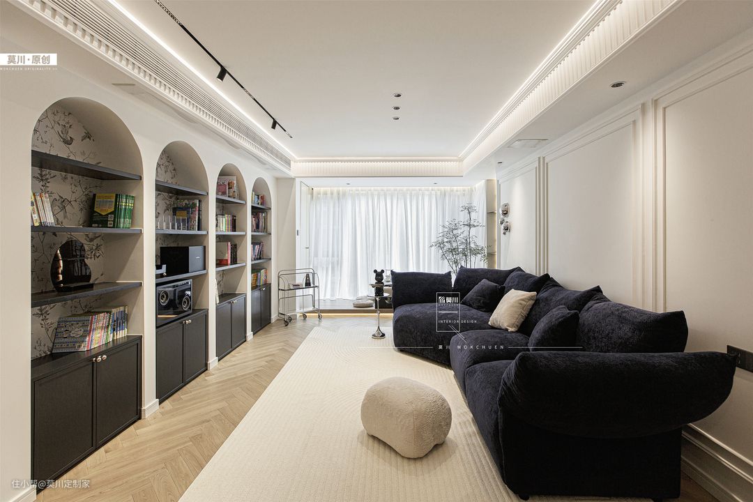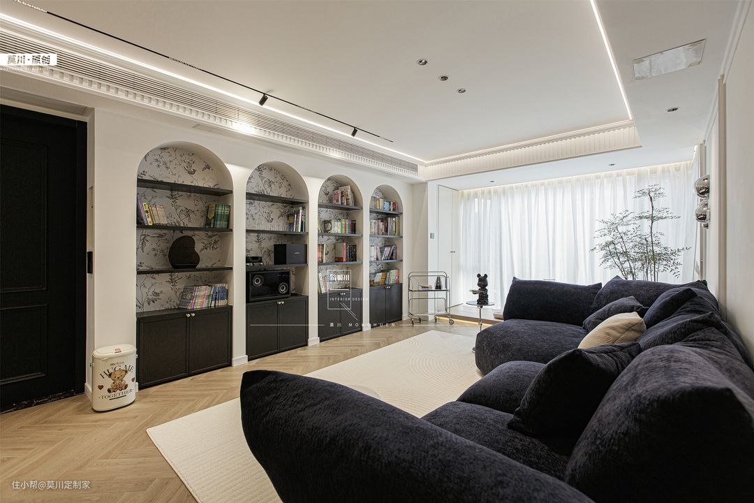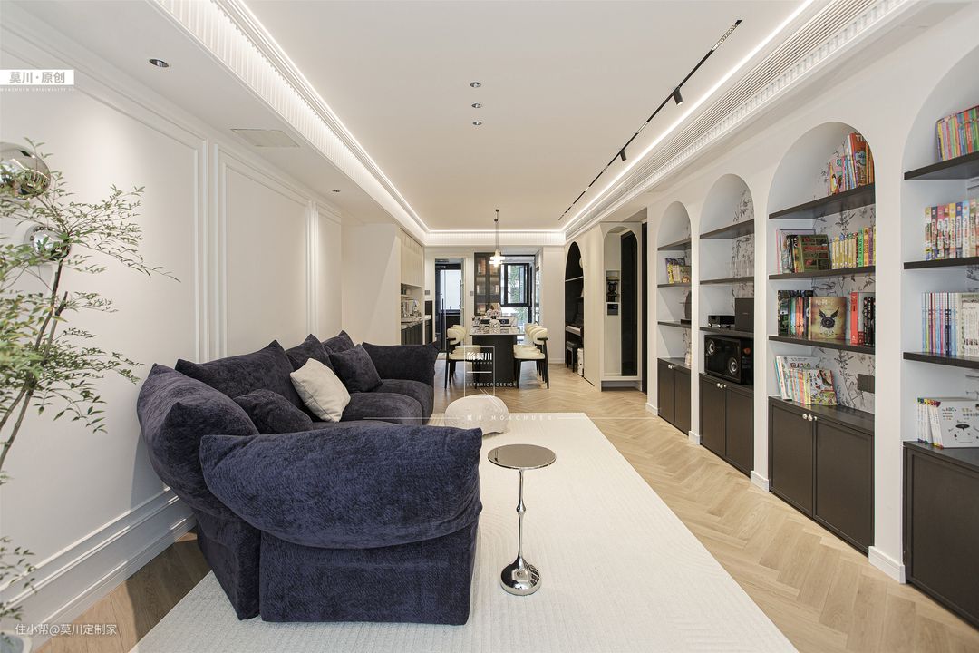 1.通透明亮的客厅,融入书墙概念,利于培养家中的2位小朋友,阅读习惯从娃娃时期抓起; 2.嵌入式的储物柜,满足书籍和玩具的收纳,背景是充满了法式韵味的墙纸,丰富了储物空间; 3.另一侧的沙发空间,背景以石膏线条随沙发铺开,纳入宝格丽岩板的材质,同时具备立体感与艺术感; 4.天花吊顶同样以石膏线环绕包裹,搭配鱼骨拼接形式三层木地板,将法式氛围渗透进整个客厅。