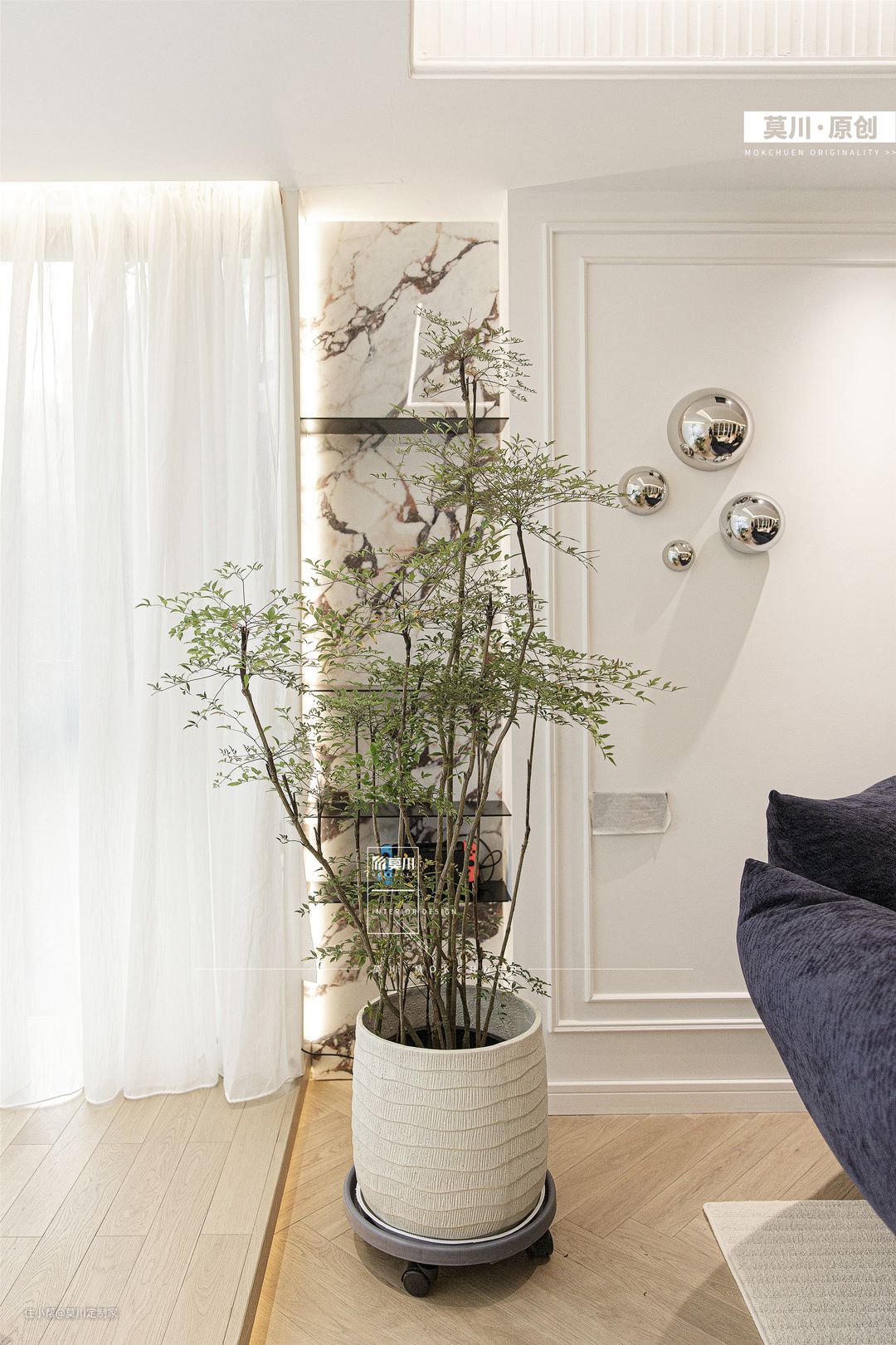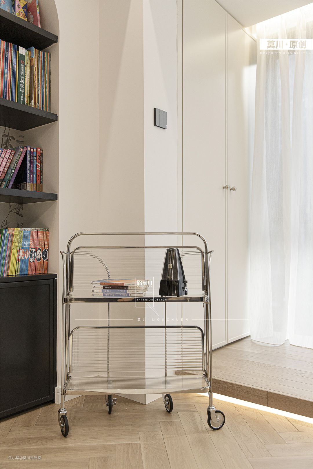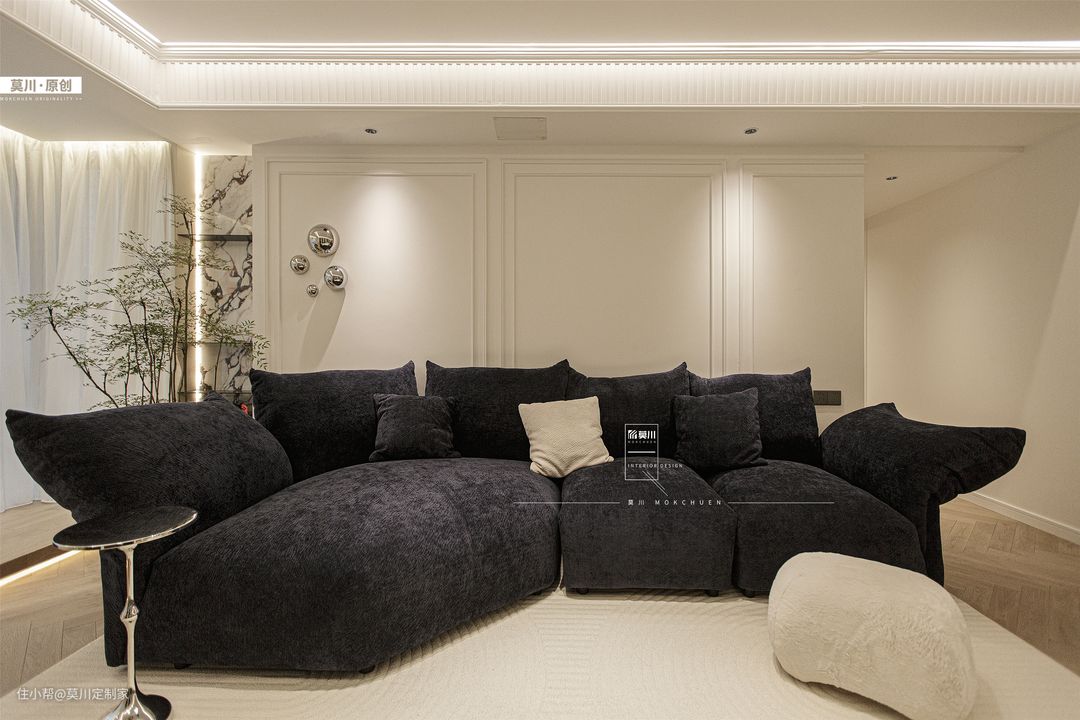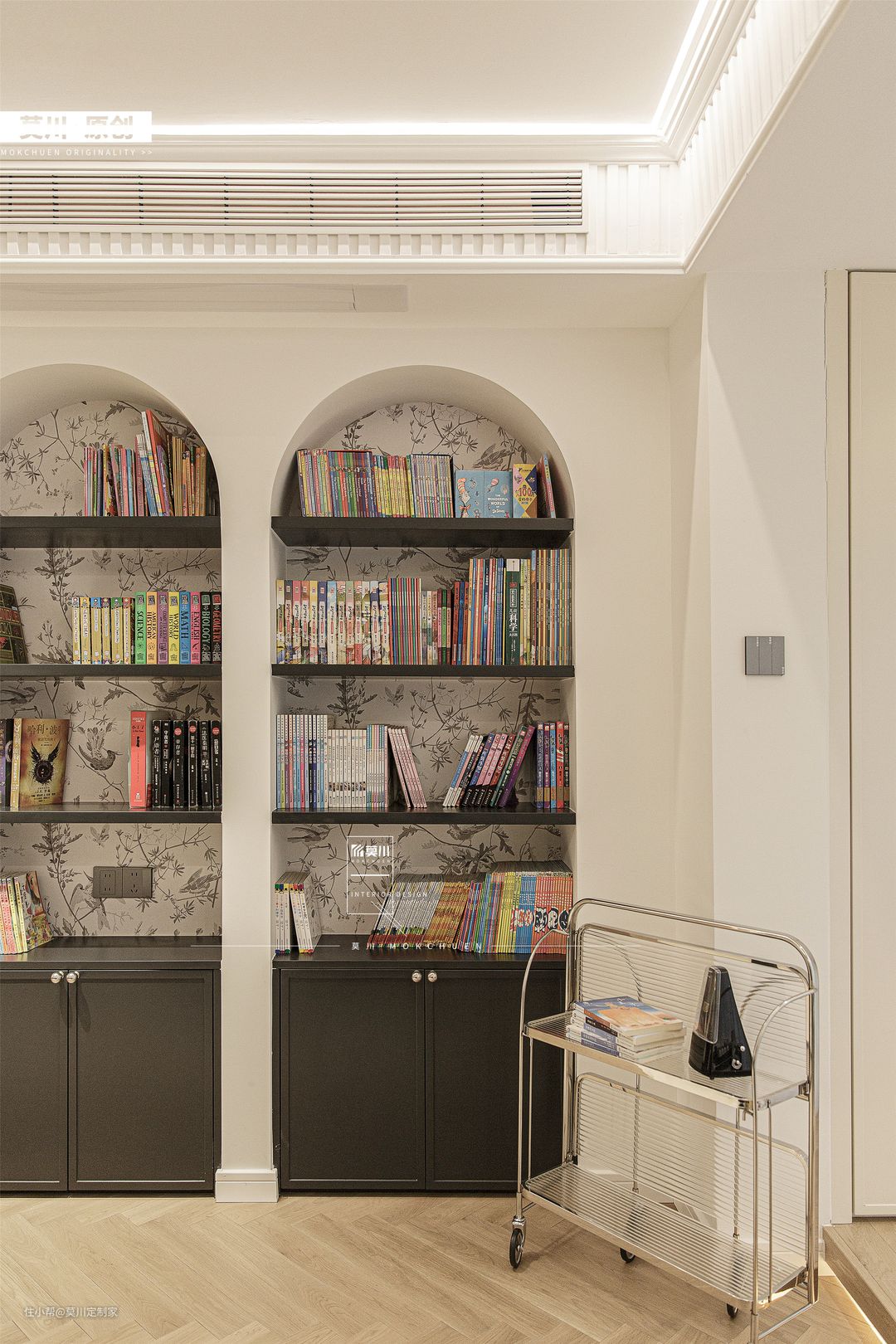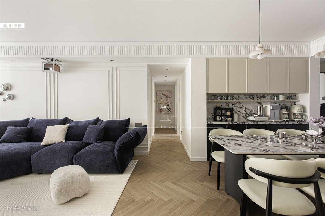 1.通透明亮的客厅,融入书墙概念,利于培养家中的2位小朋友,阅读习惯从娃娃时期抓起; 2.嵌入式的储物柜,满足书籍和玩具的收纳,背景是充满了法式韵味的墙纸,丰富了储物空间; 3.另一侧的沙发空间,背景以石膏线条随沙发铺开,纳入宝格丽岩板的材质,同时具备立体感与艺术感; 4.天花吊顶同样以石膏线环绕包裹,搭配鱼骨拼接形式三层木地板,将法式氛围渗透进整个客厅。