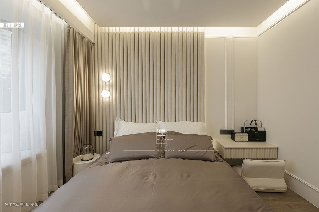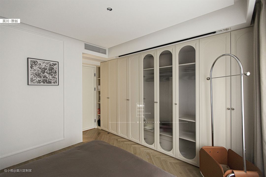 1.主卧设计地台床,地面抬高15公分,然后将地台与床融为一体,降低居室重心,更贴近地面,安全感十足,利于提高业主的睡眠品质; 2.床头背景,由软包与石膏线横竖相连构成,搭配低饱和度的鱼骨拼木地板、形态不一的线条感边几,绿植点缀,营造一个灵动又治愈的居家环境; 3.一整面顶天立地的衣柜,做了几何椭圆形烤漆设计,搭配几扇小灯芯玻璃门,通透又温柔,衣柜上黄铜材质球形小拉手,点缀白色的柜门,勾勒出法式精致美。