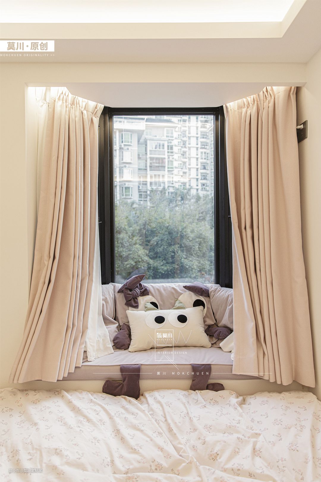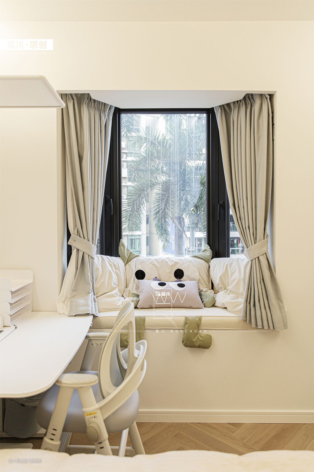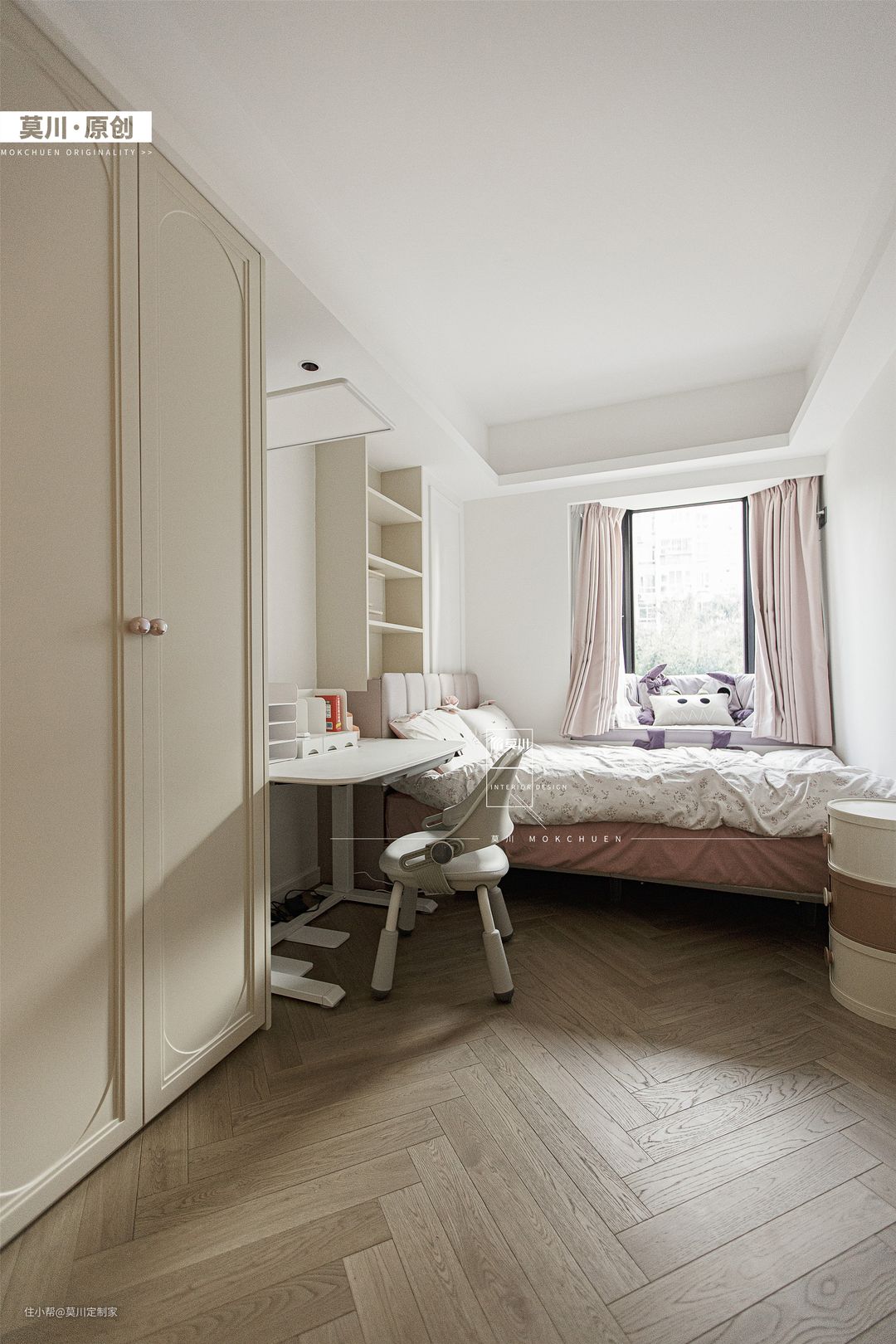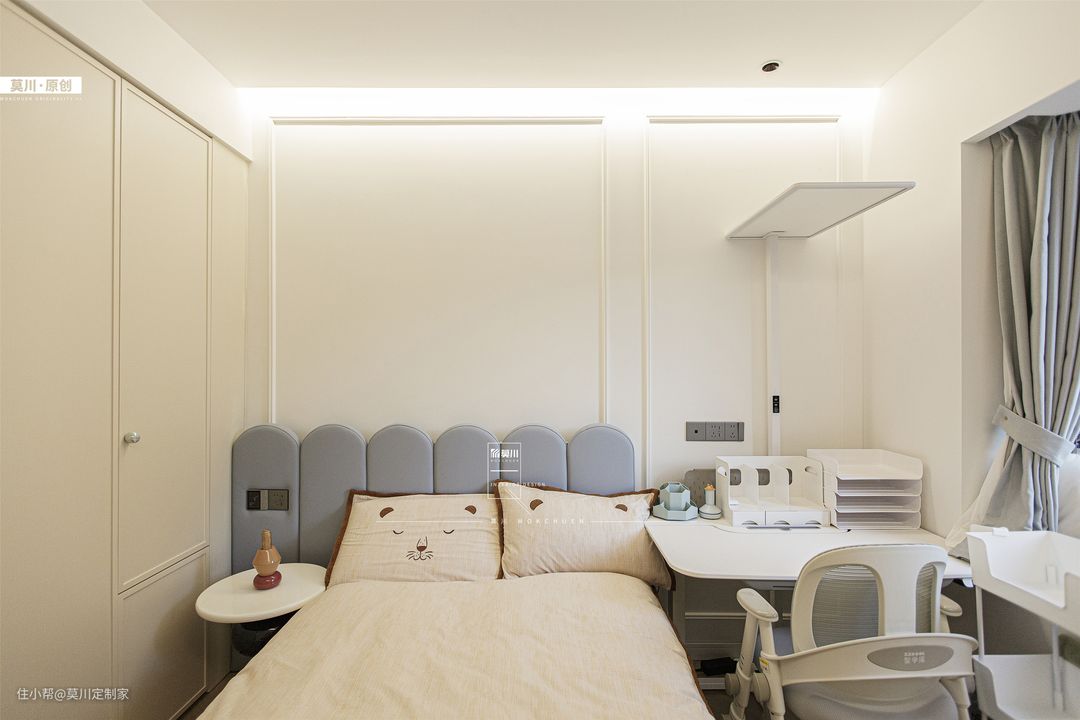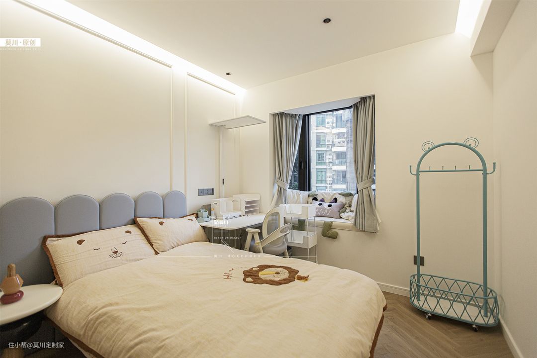 1.女孩房用浅粉作色彩铺垫,纳入弧形元素,占据衣柜、书桌、床头背景,软包形式搭配可爱兔子造型置于床头,在灯带的照耀下,少女心十足; 2.进门两侧用收纳方式代替白墙,固定的衣橱叠加可移动的衣帽架,梳妆打扮一步到位,给女孩提供了更大的便利性。