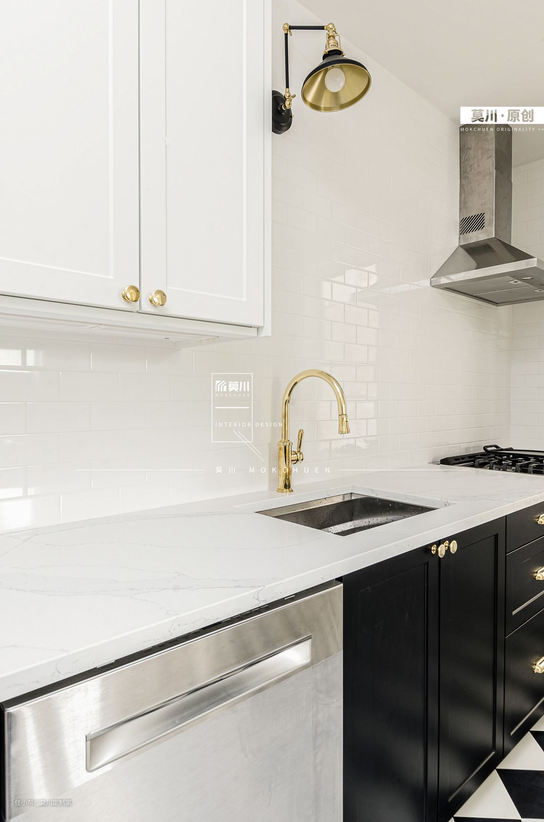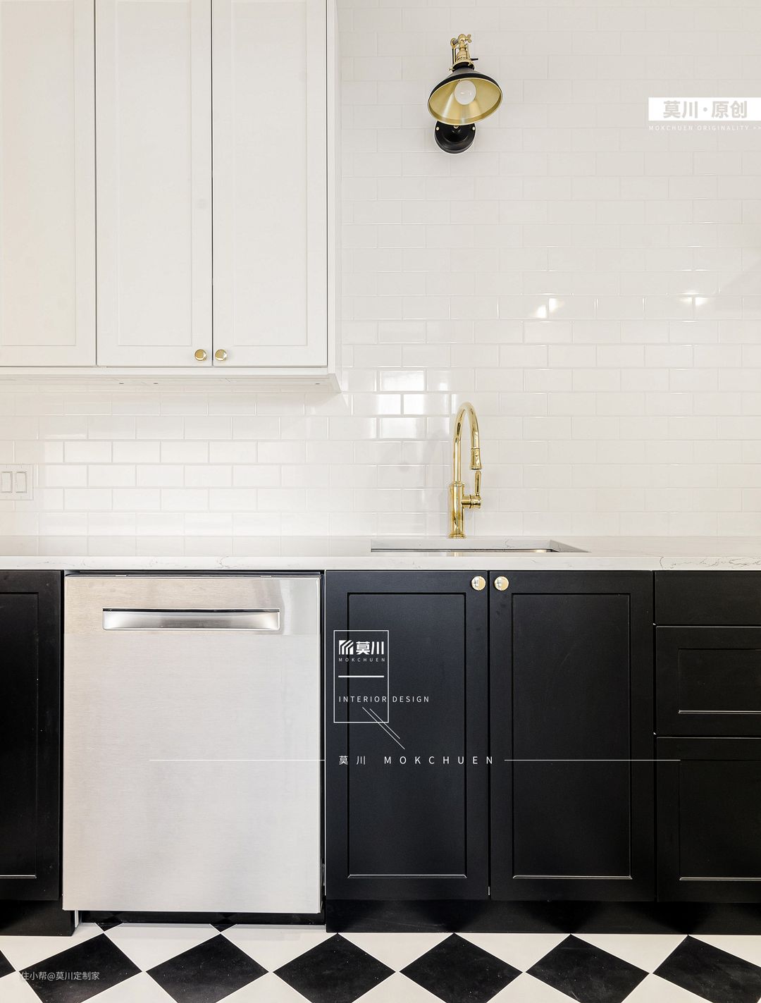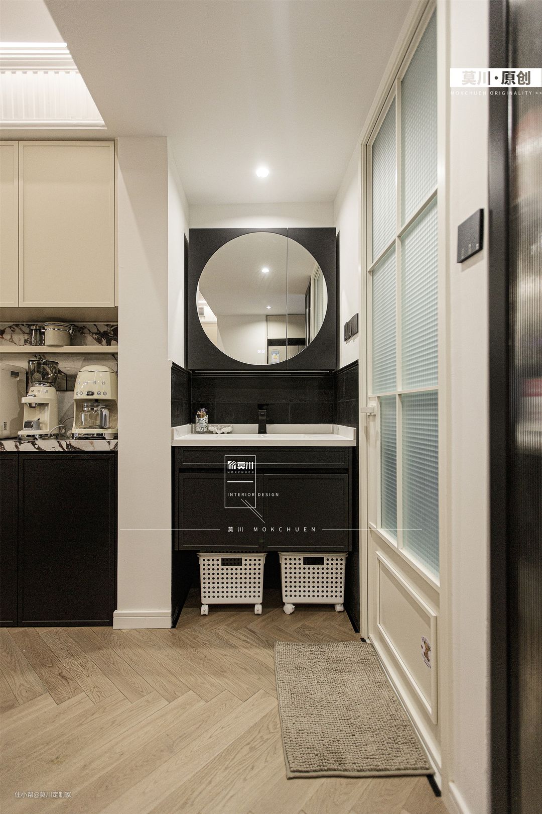 1.原户型厨房空间局促,将生活阳台纳入厨房,再将保姆房置最内里,使得家政动线更加分明,减少了使用厨房时的窘迫感; 2.空间上以黑白色调为主,使用白色方块小砖拼接分隔凹凸造型的烤漆的柜体,过道由黑白相间马赛克瓷砖通铺,色彩的对比、层次的构造,充满了法式韵味。