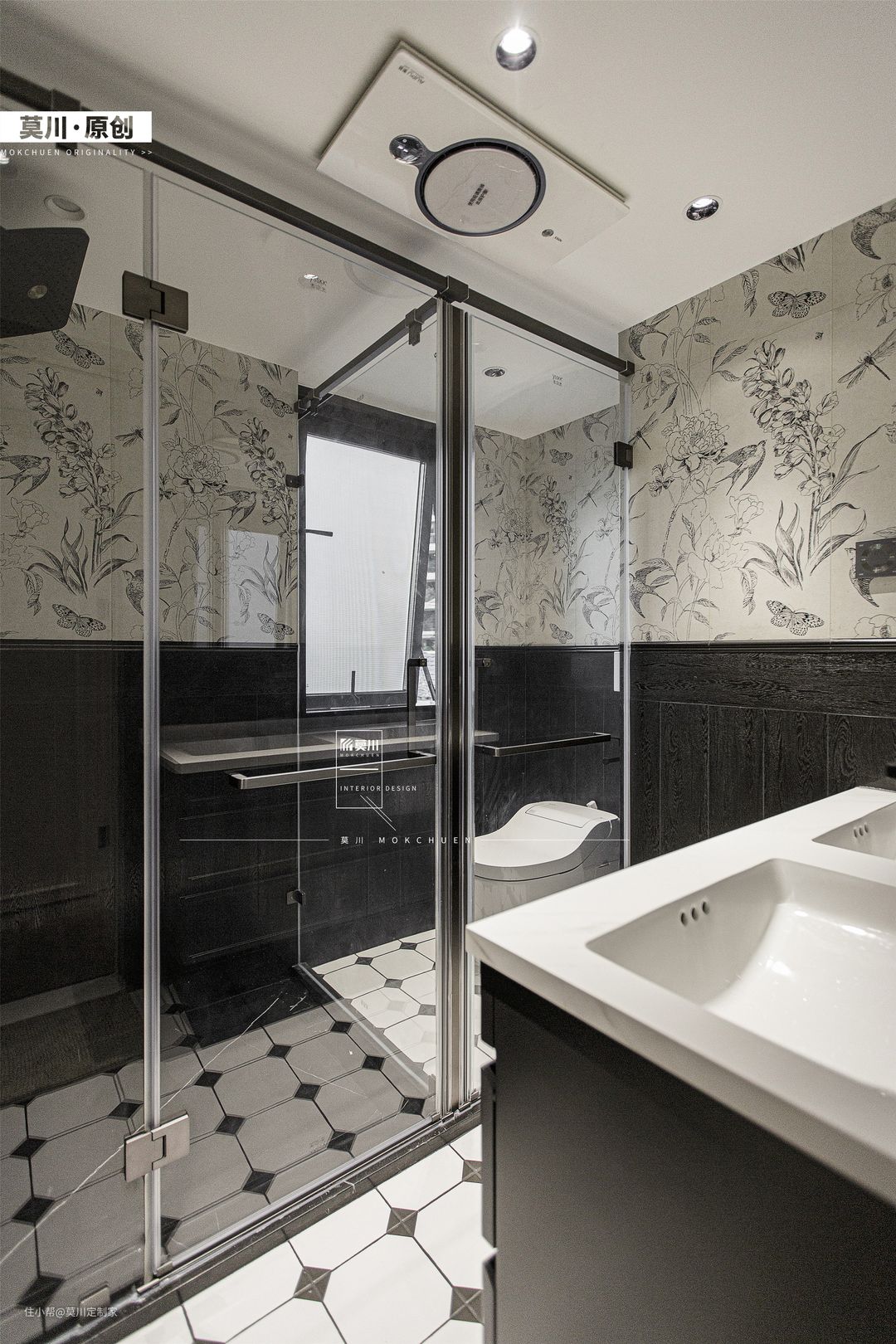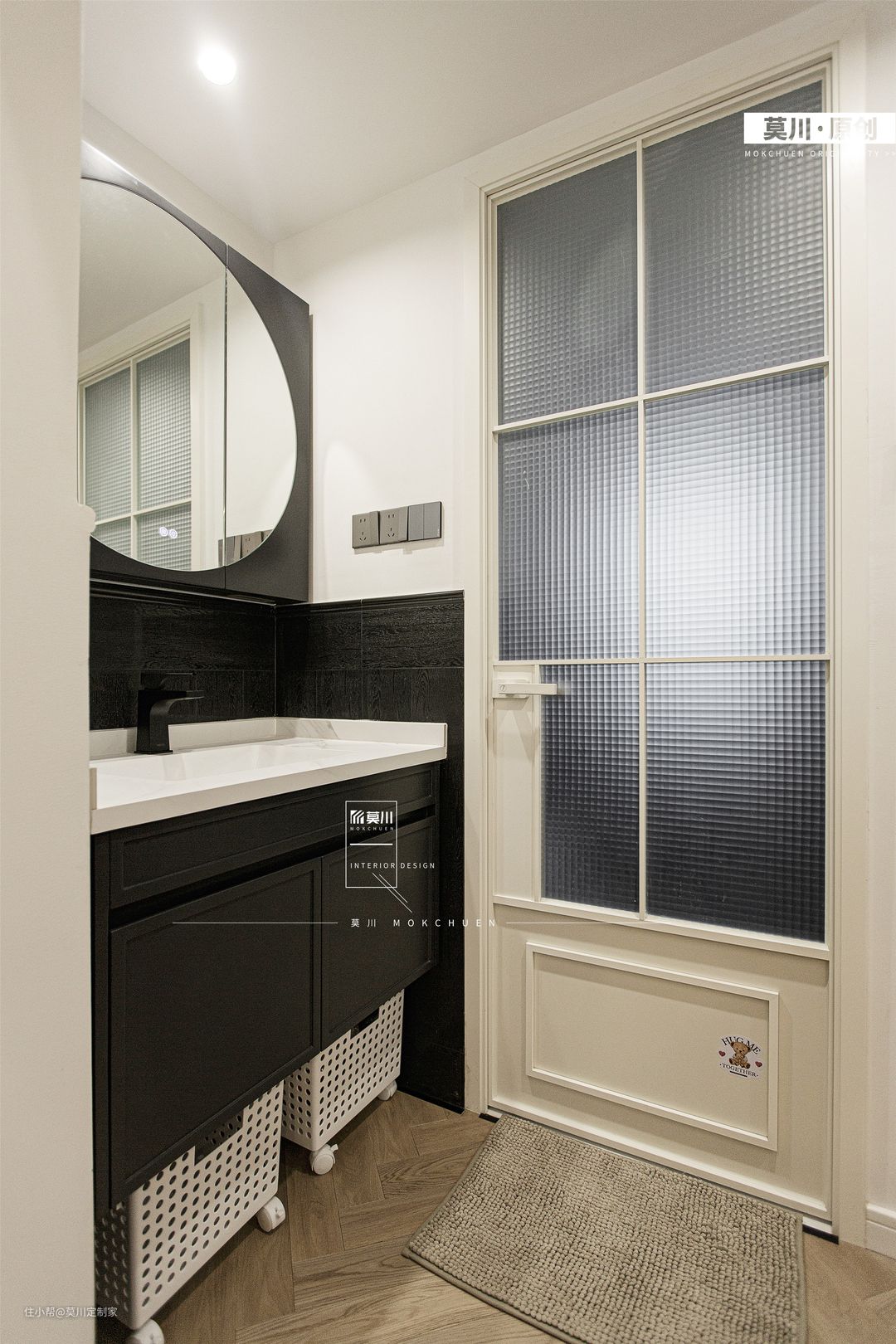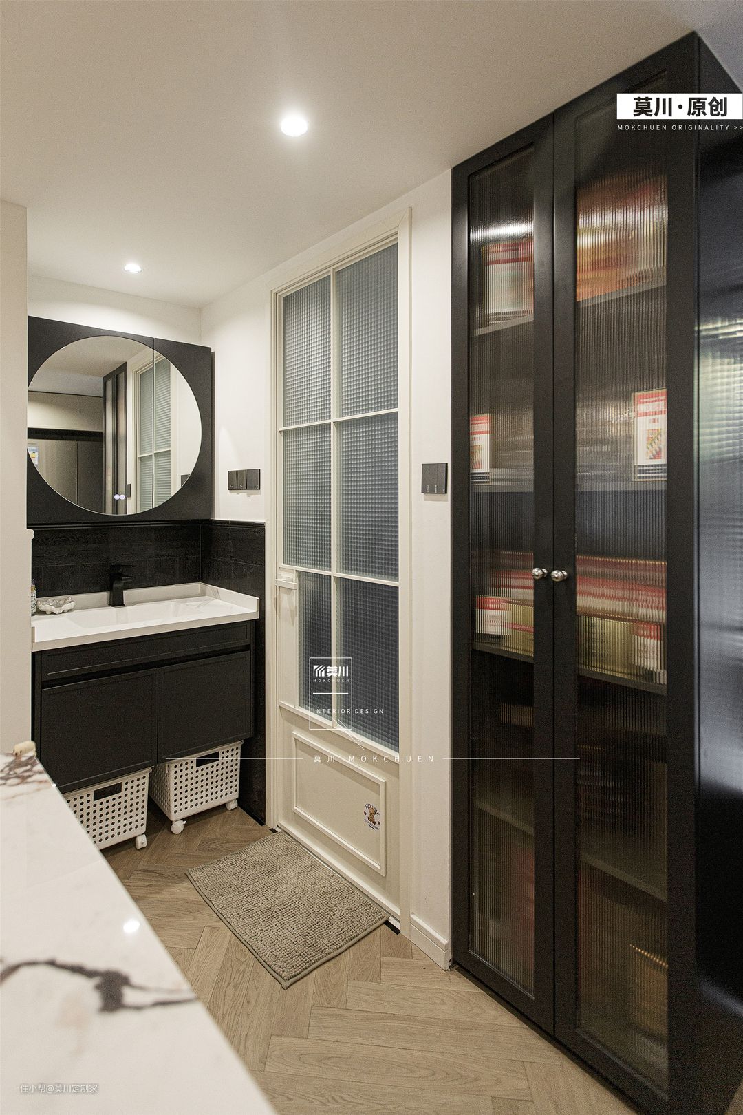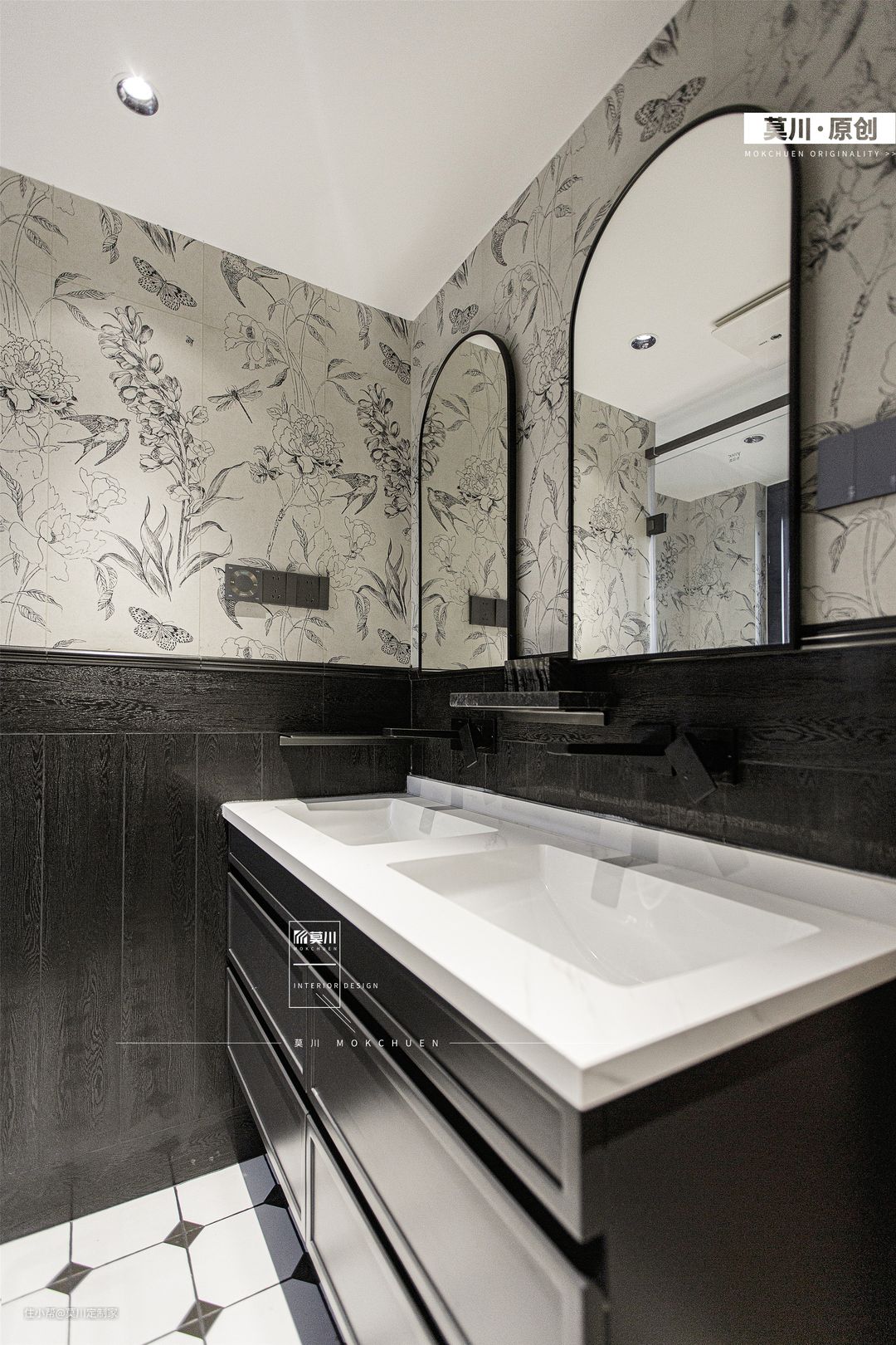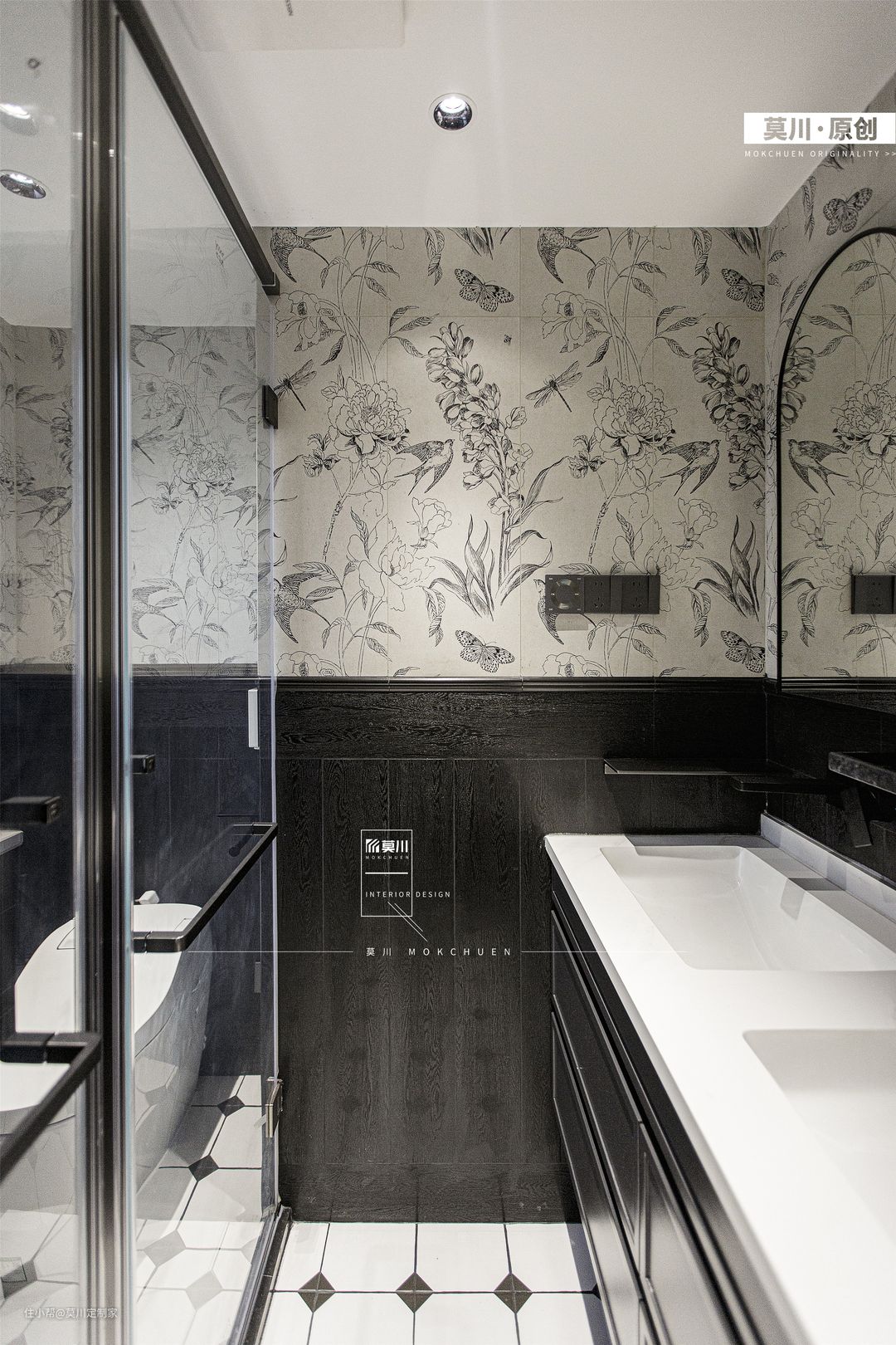 1.公卫做三分离设计,地面用木地板、马赛克砖、与防滑大理石交替通铺; 2.燕子花砖上墙,下侧腰线铺贴黑色格子砖,几种色彩拼贴仿佛回到18世纪的法国,让人一见倾心。