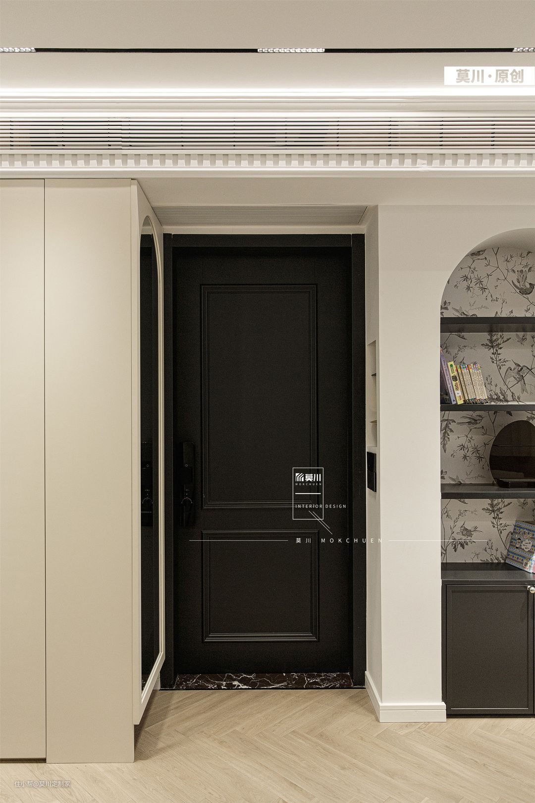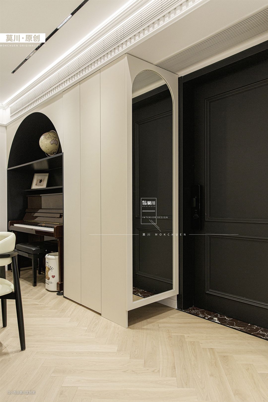 入户右边是弧形全身镜,业主进出门时可以整理仪容仪表,保持一整天的好心情。左边是嵌入式的玄关柜,业主进出门时可放置钥匙、包包等,精致的空间功能性十足。