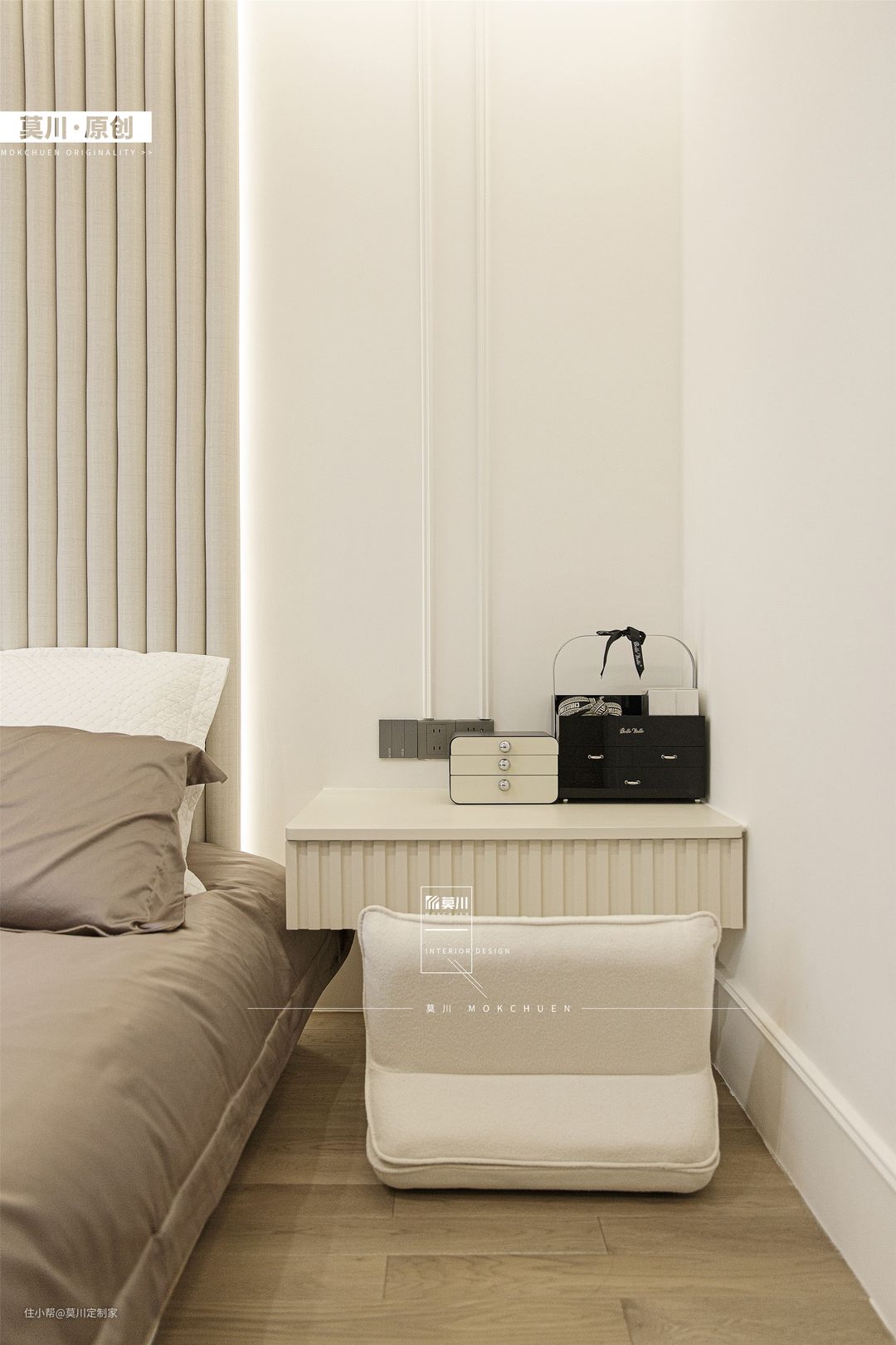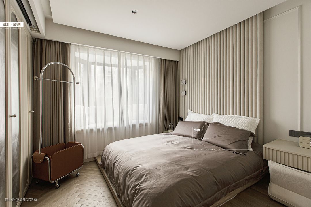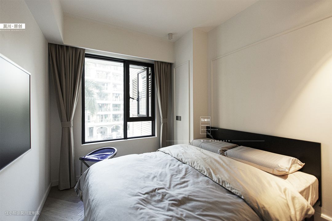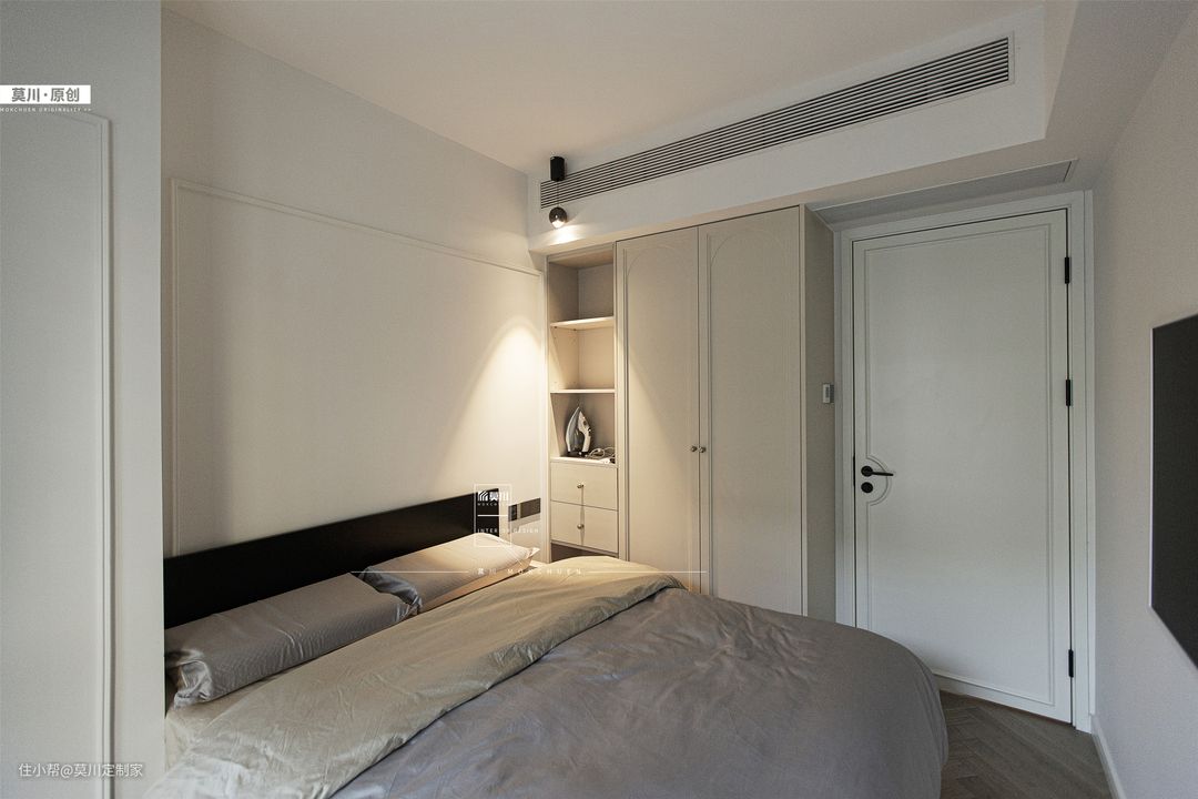 1.次卧主要预留给偶尔过来居住的2位老人,综合老人的喜爱,以简约大气的设计手法进行设计; 2.素净的墙面由石膏线条框起,天花保留原始顶不做装饰,进门右侧沿墙造柜,对向窗边摆放可移动的小型书桌,墙上安装小巧实用的隔板置物架,满足日常储物需求,强调了睡眠空间的舒适性。
