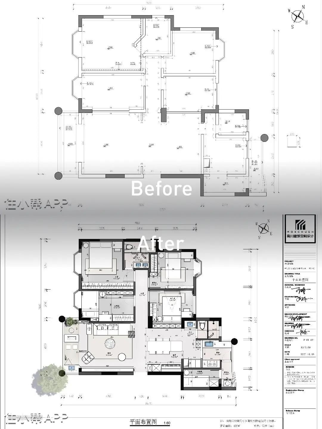 平面布置&问题改造: 1.厨房朝生活阳台,合理布局,充分利用空间; 2.将原厨房与餐厅打通,光线互通,弥补餐厅采光的不足; 3.主卧空间重组利用,功能性整合,增设衣帽储物空间; 4.分双阳台使用,生活与休闲分开,互不干扰。