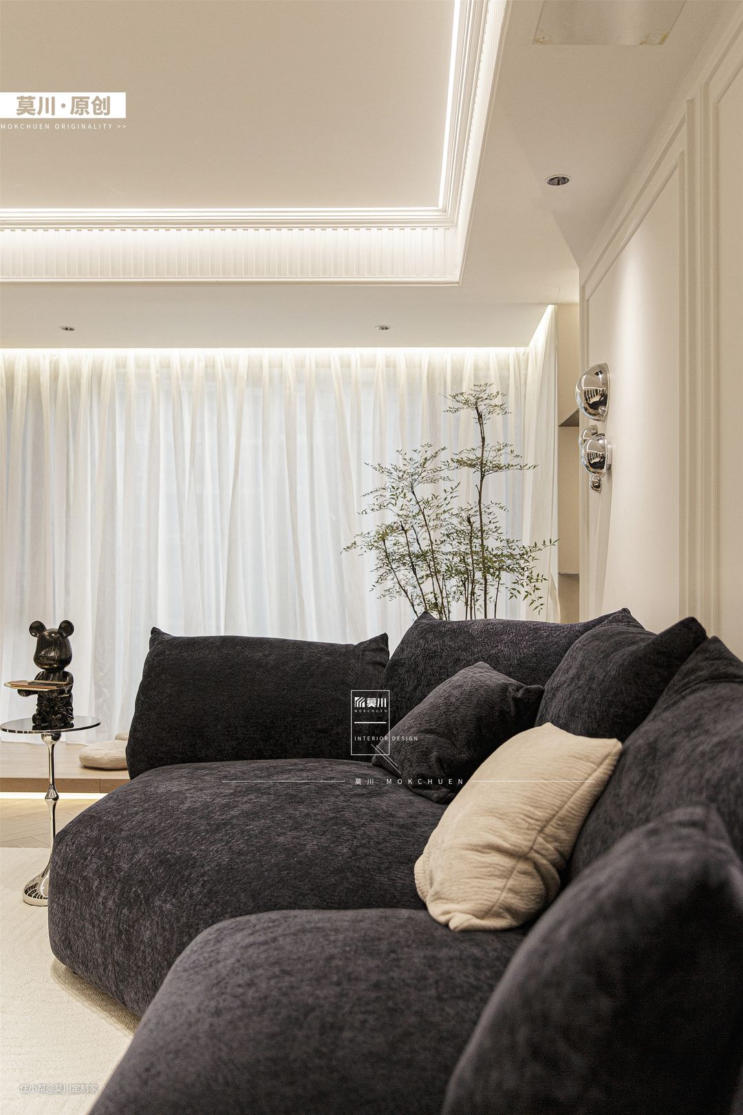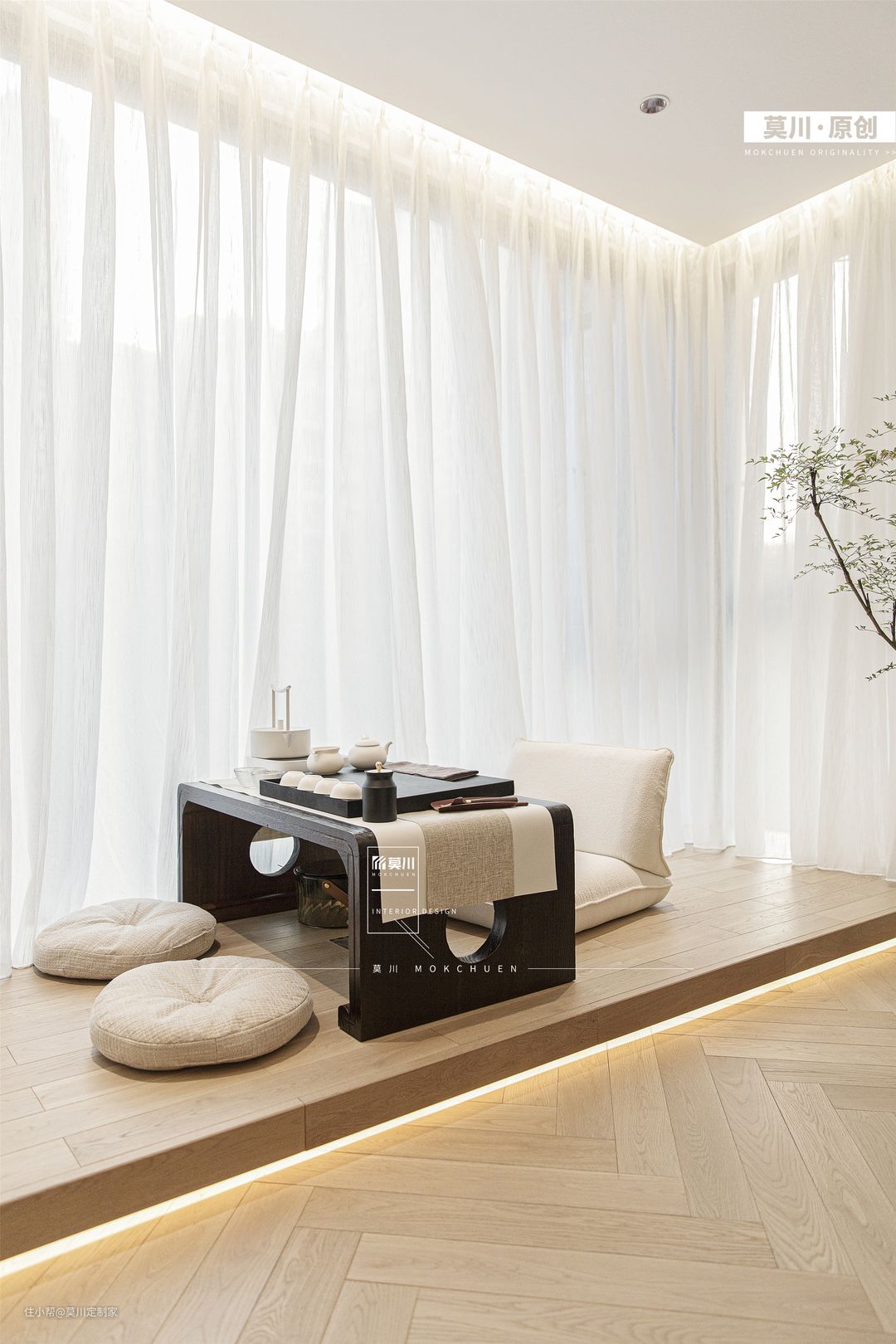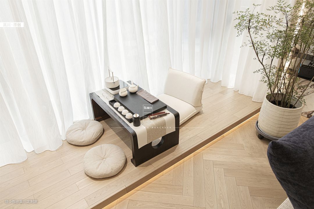 1.业主封阳台的想法得以实现,阳台区增高地台,可以看到客厅的一举一动,整个空间更加的通透,将其打造成开放性的休闲空间,可品茶可写作,功能性十足; 2.温润不失质感的地台搭配质感十足的茶几,奶白色的坐垫,纱帘点缀,温馨又惬意。