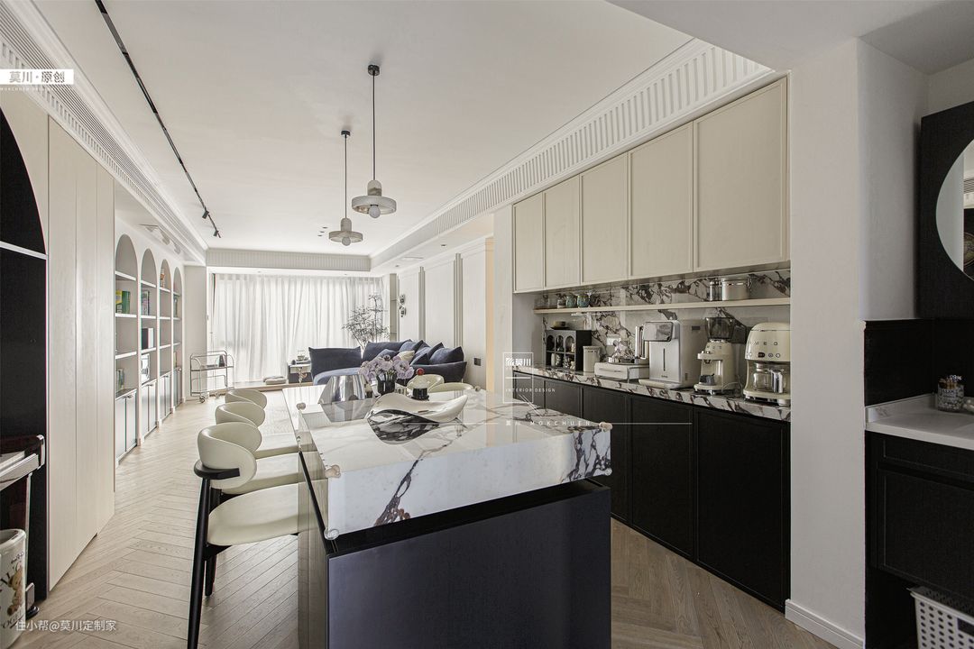 吧台采用宝格丽岩板的材质,高端大气中透露着沉稳的格调。连接餐桌,增强了与客餐厅的互动性,功能性十足。