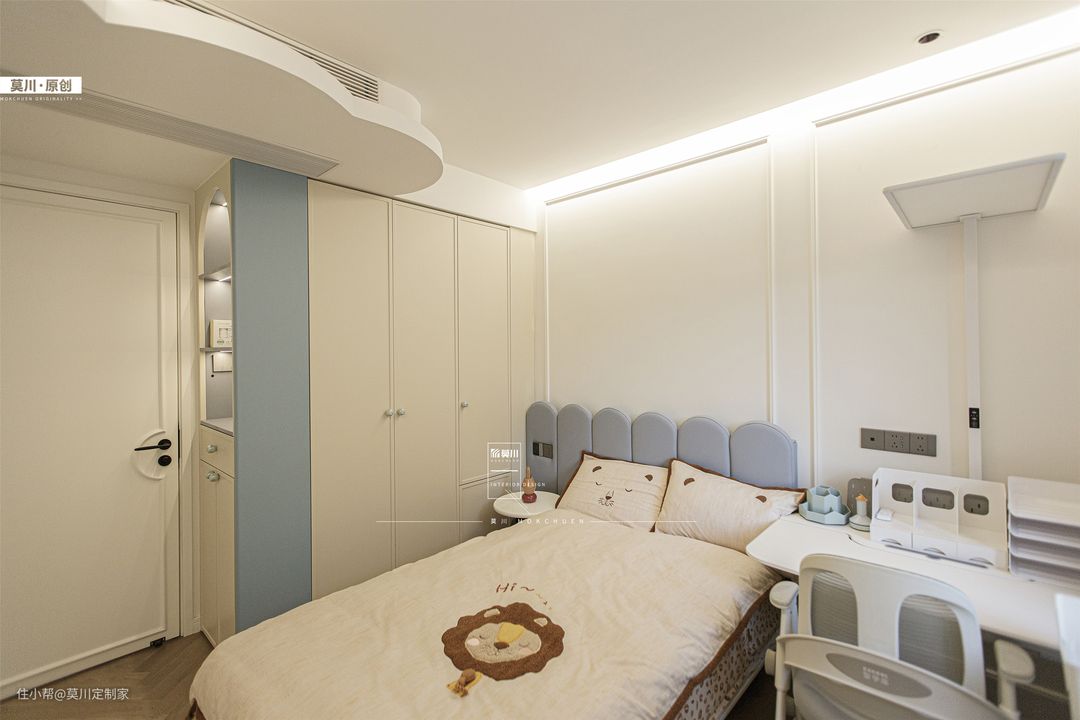 1.设计与女孩房同款弧形软包床头,自带灯带为睡前故事提供余裕照明; 2.右侧学习区将大面积的蓝色洞洞板上墙,增加了灵活的储物空间,随着孩子的成长,可做调整; 3.洞洞板对侧整面书柜,满足储物,同时为未来提供无限可能。