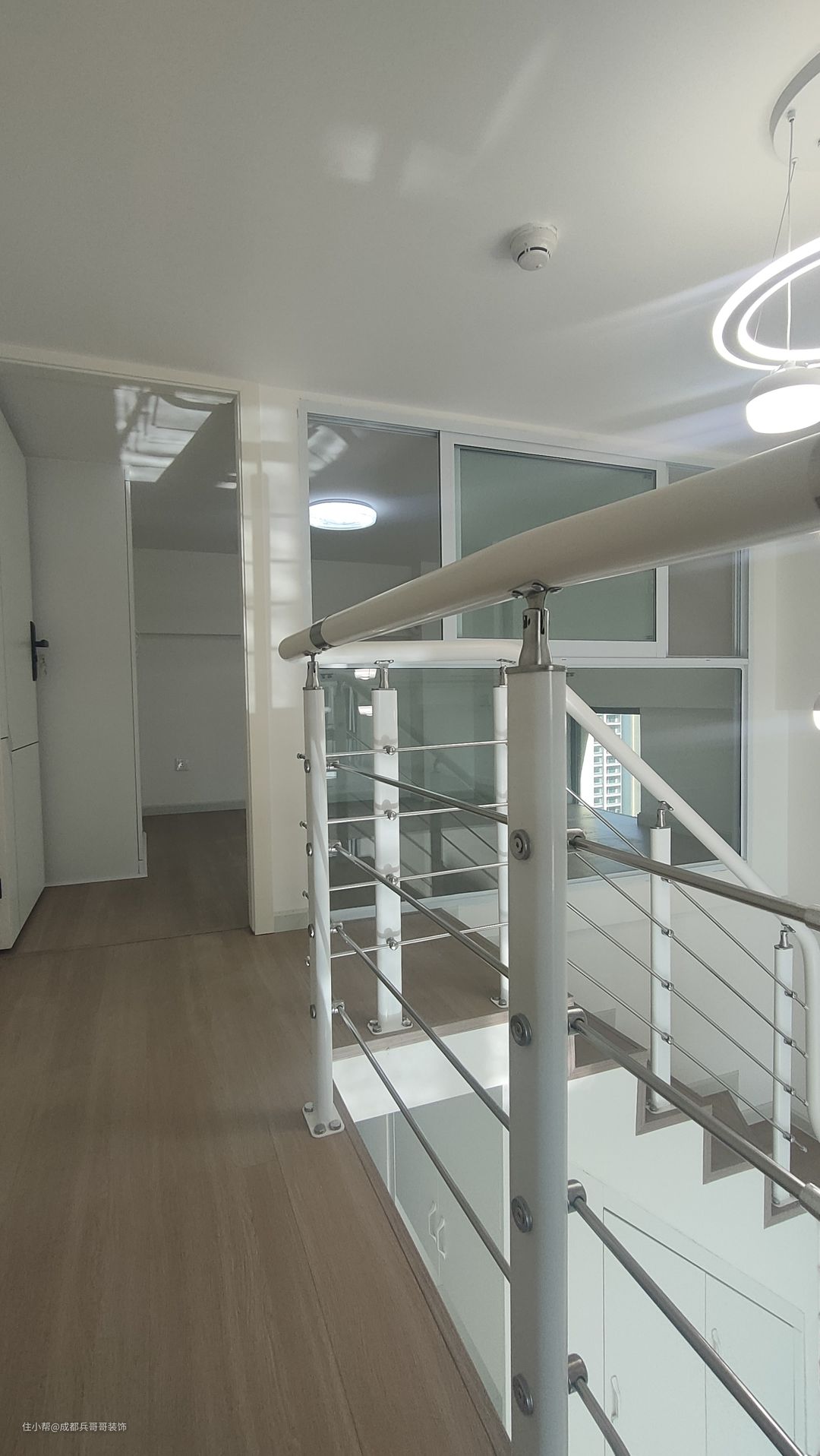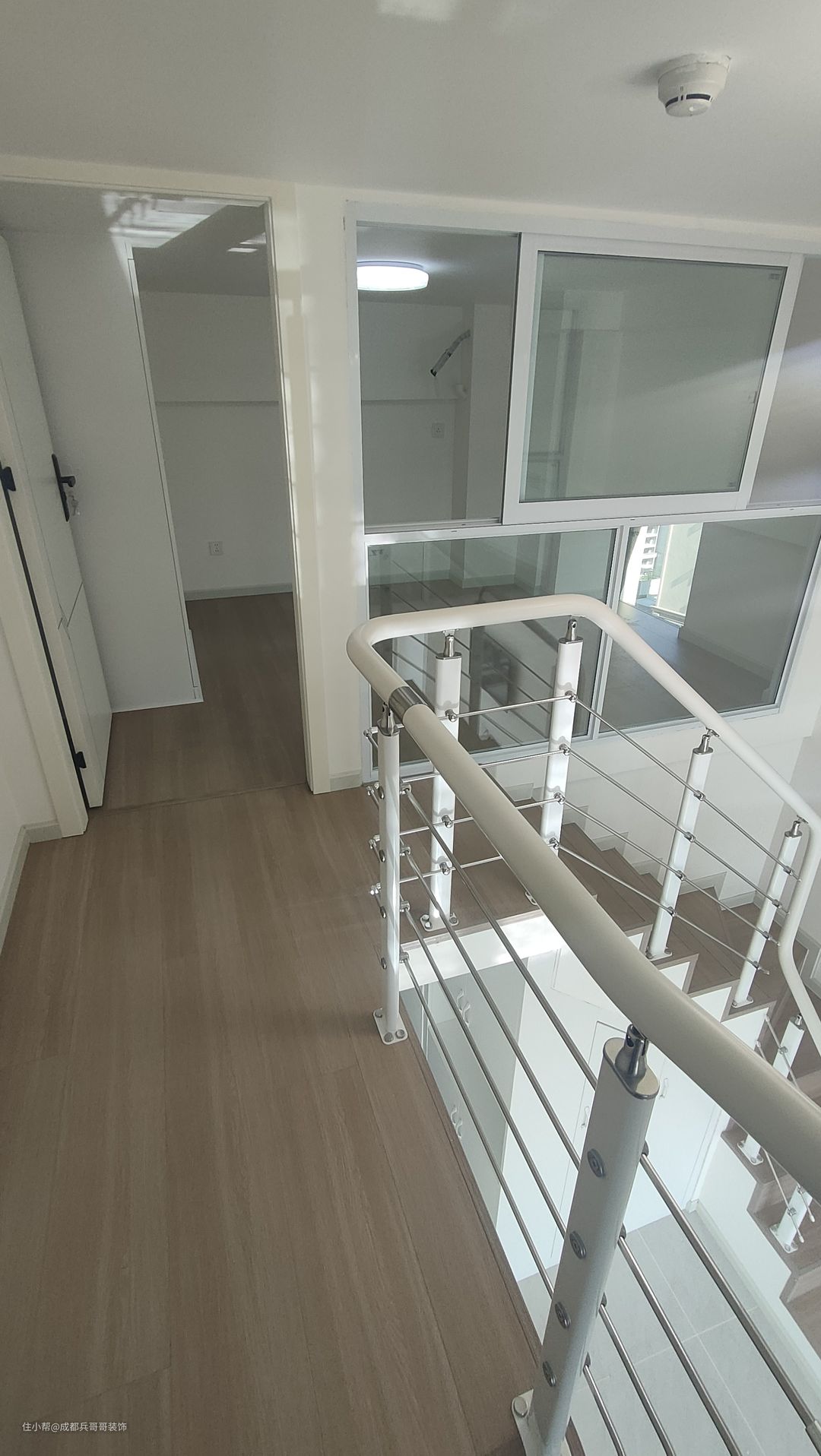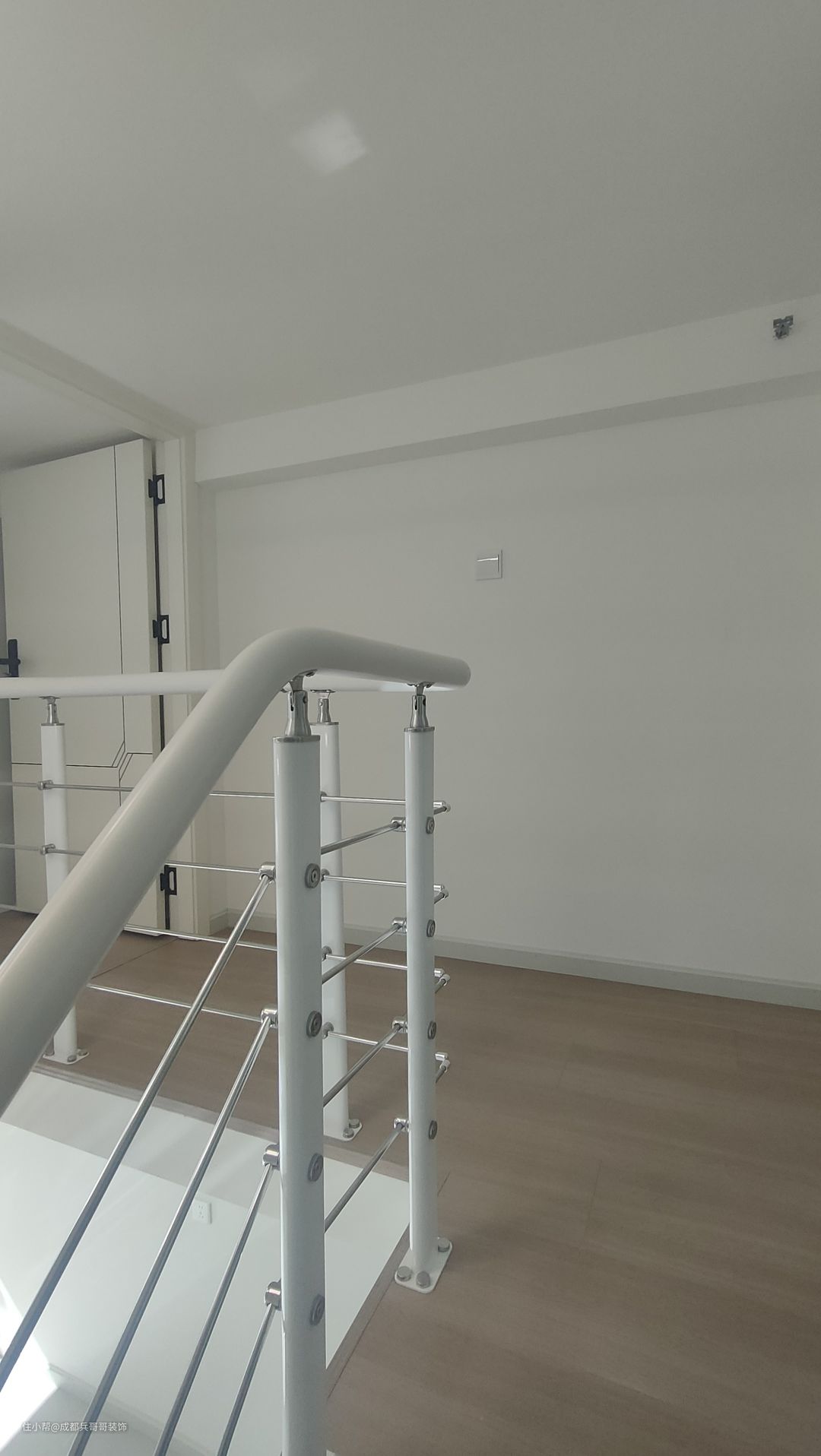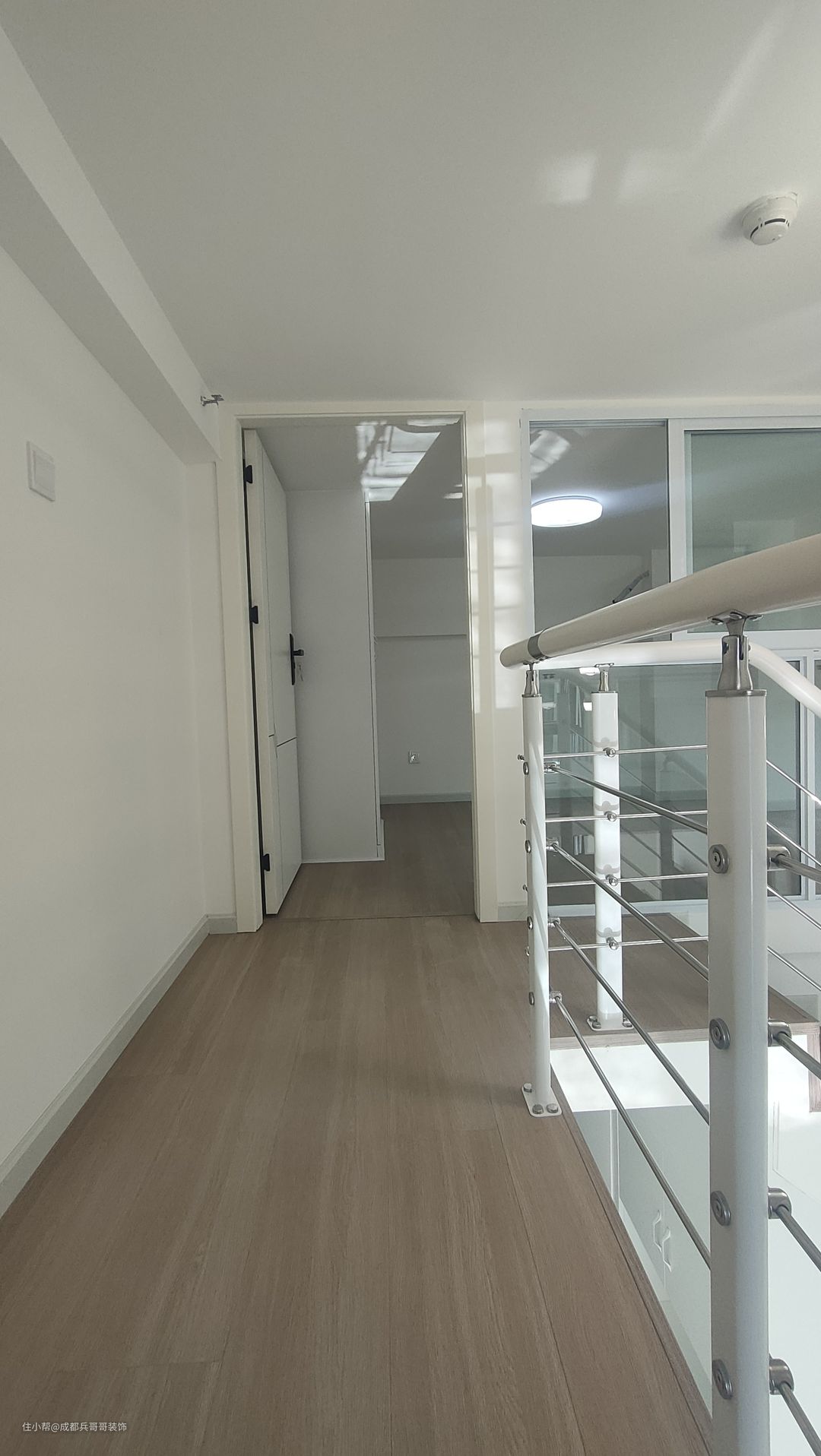 二楼过道,保留一米的宽度,侧边扶手和楼梯扶手一致,高分子扶手设计,经济实惠又耐看。二楼整体木地板铺贴,自然干净,舒适感更好。