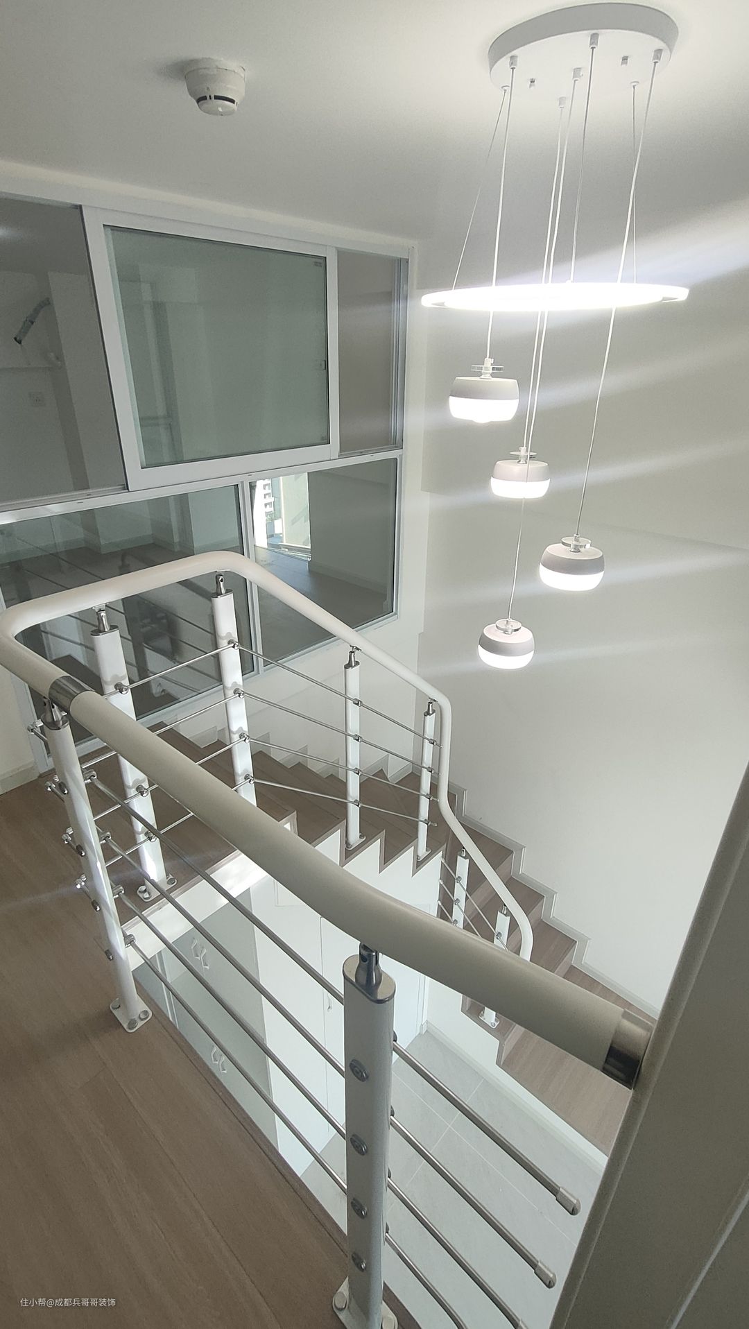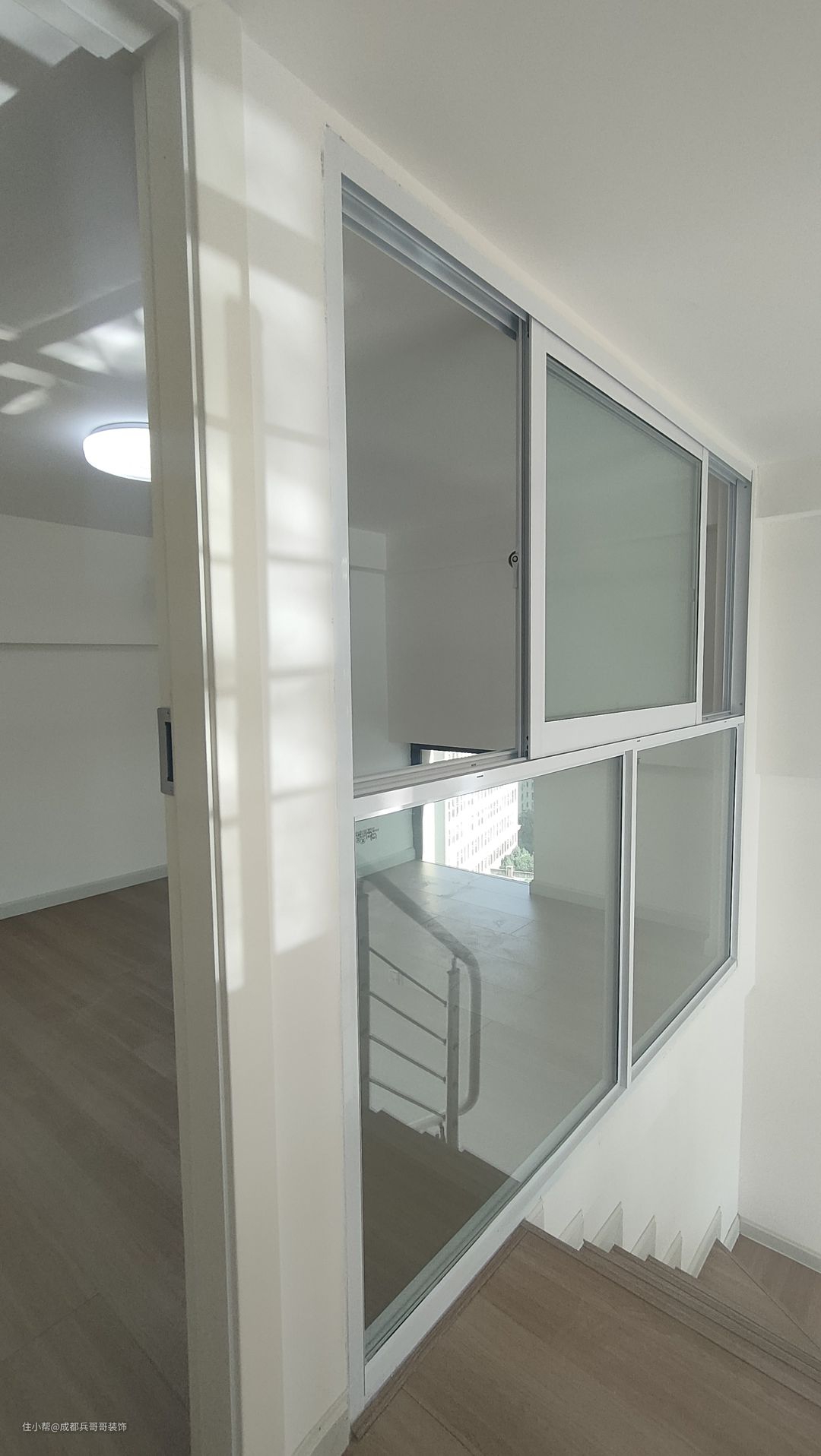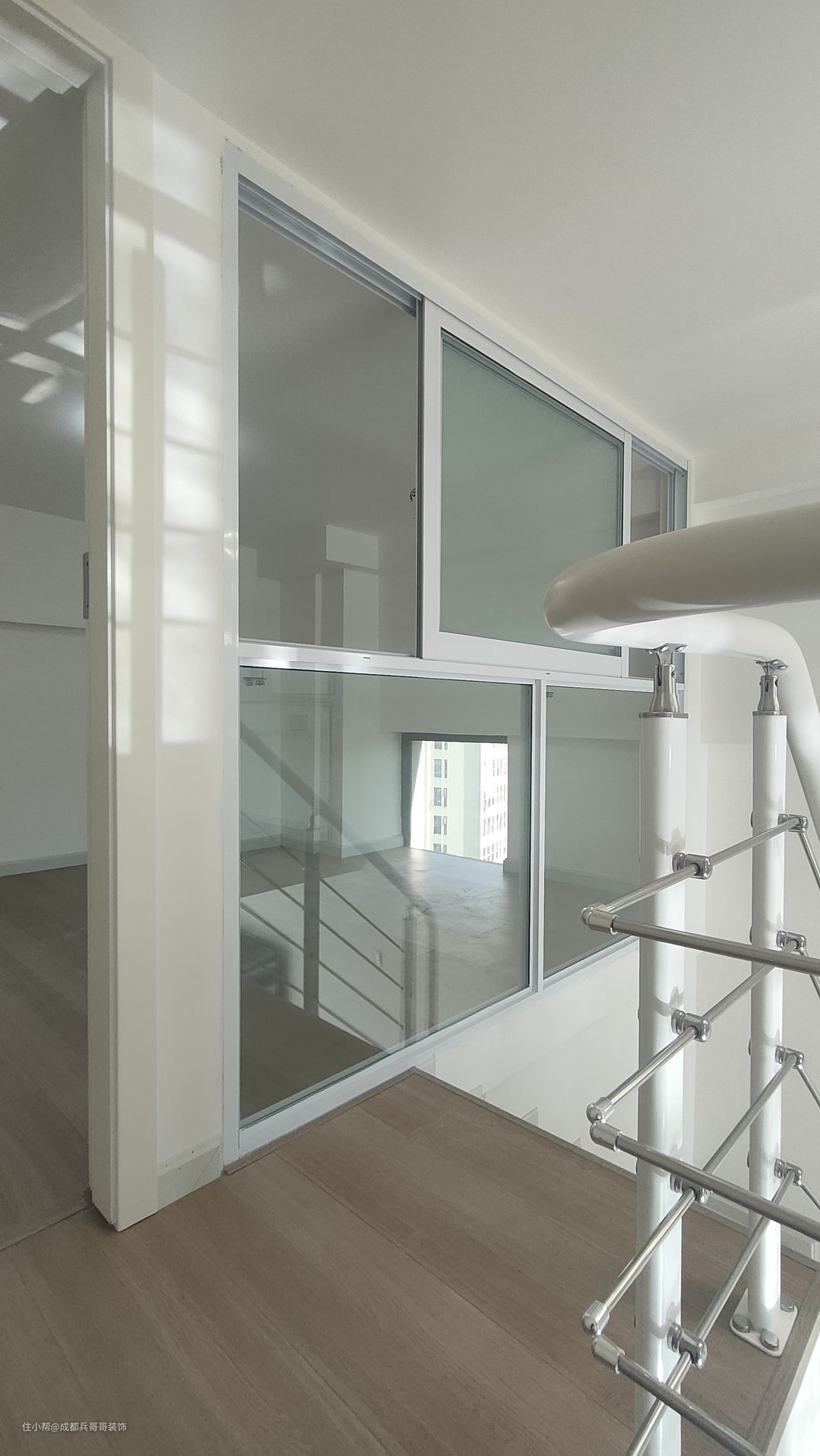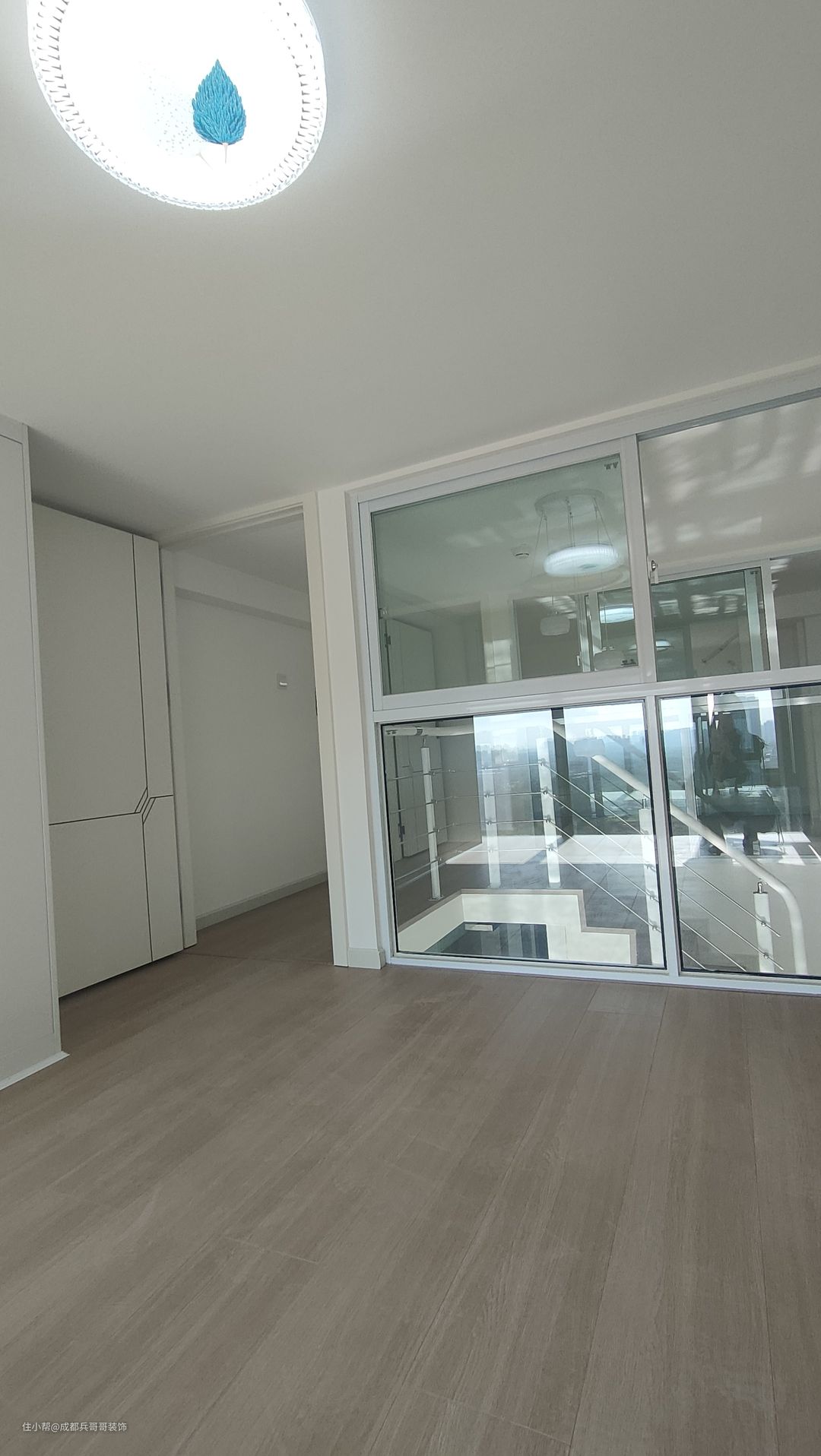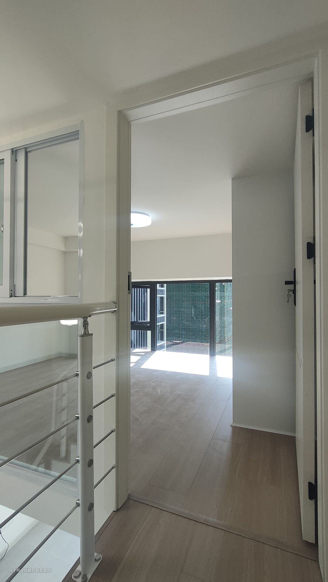 二楼过道,保留一米的宽度,侧边扶手和楼梯扶手一致,高分子扶手设计,经济实惠又耐看。二楼整体木地板铺贴,自然干净,舒适感更好。