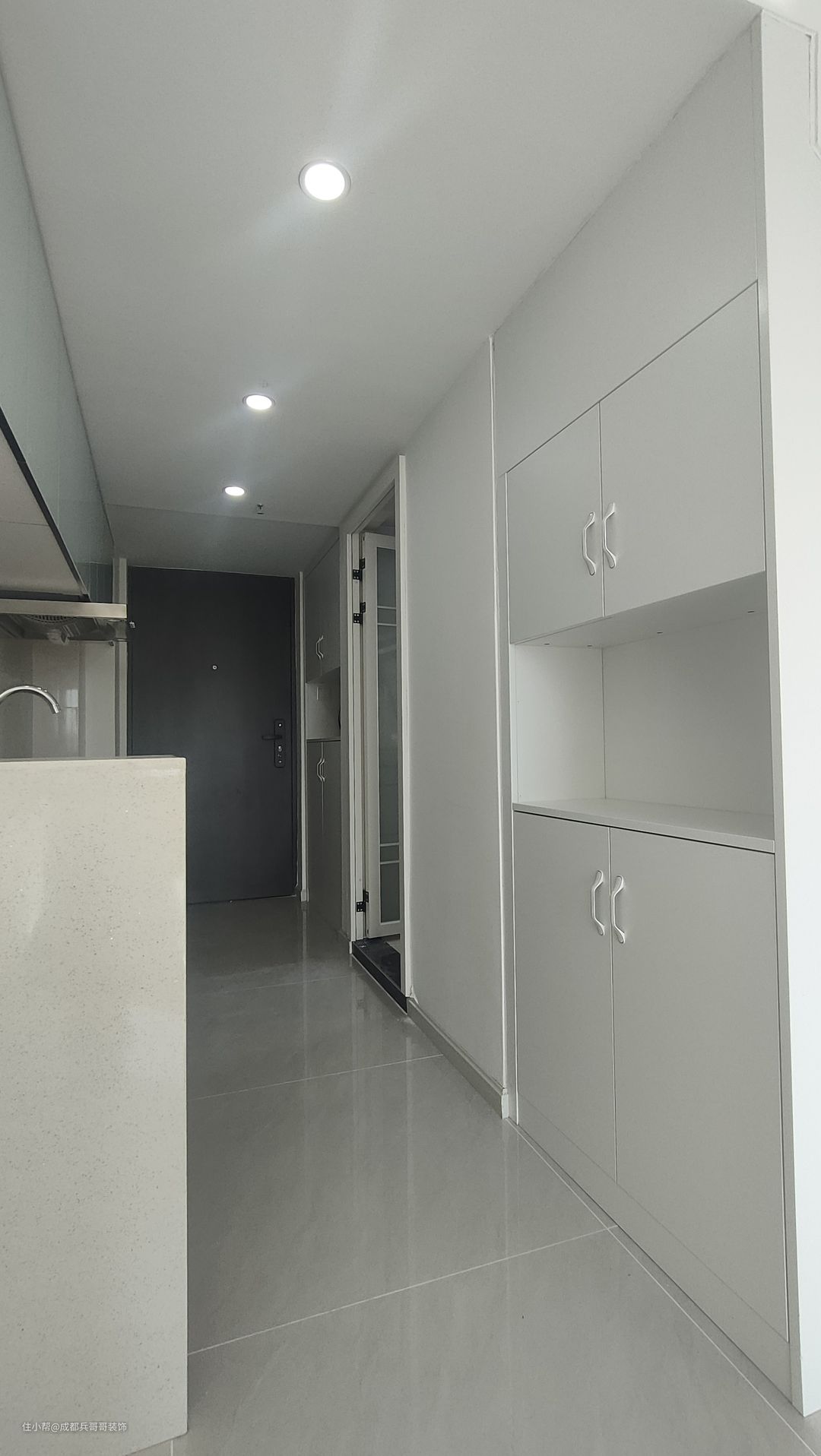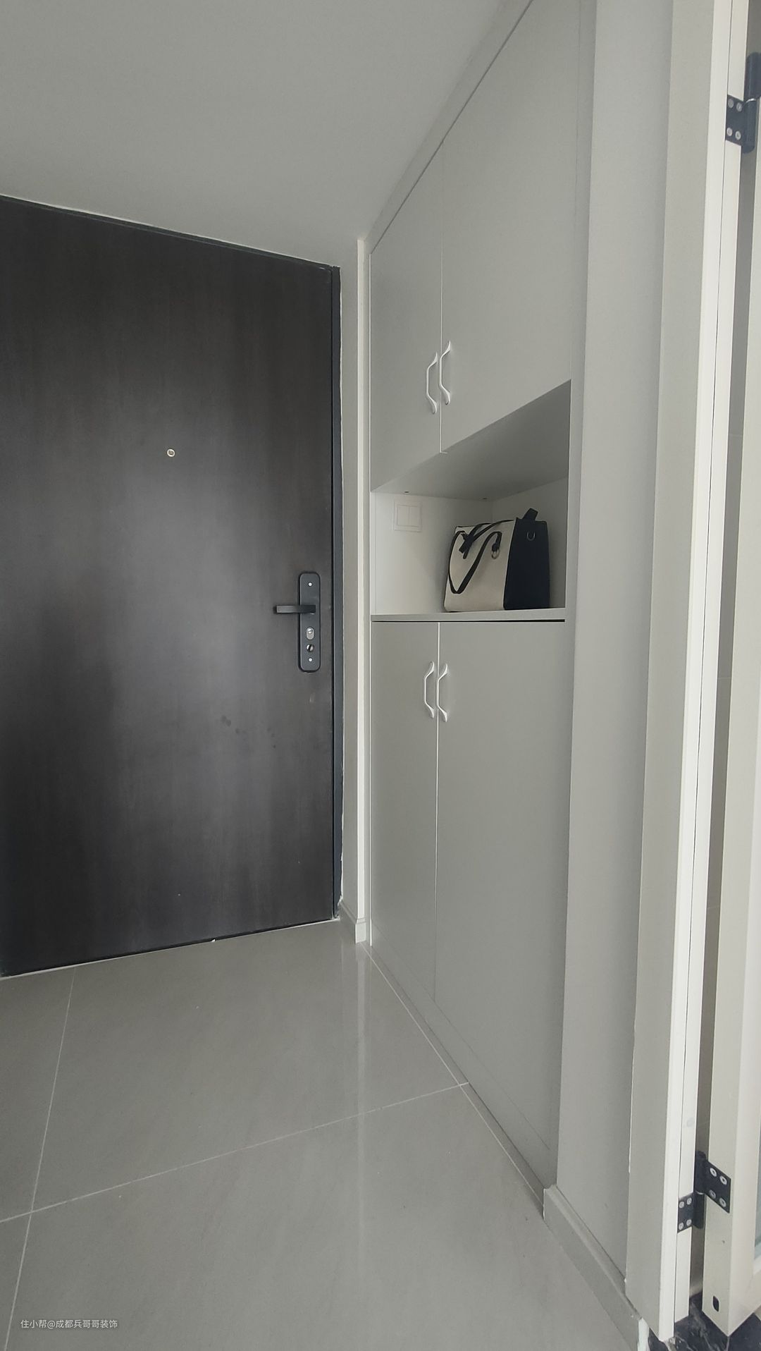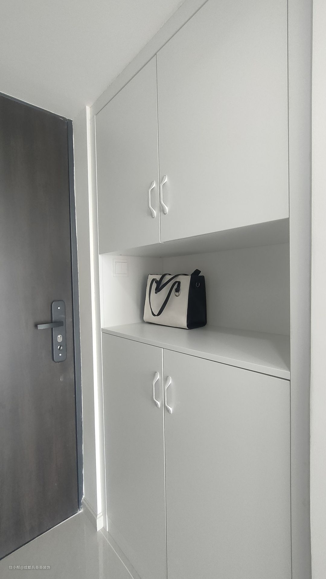 首先,一楼入户玄关,安装了通顶式的鞋柜,中间镂空35公分,方便放置包包、钥匙等物品。上方和底部多格化的储物可以满足日常收纳。颜色选用简约白,与整体风格相得益彰。 另一边柜子是楼梯侧边空间,为室内增加了不少储物空间。