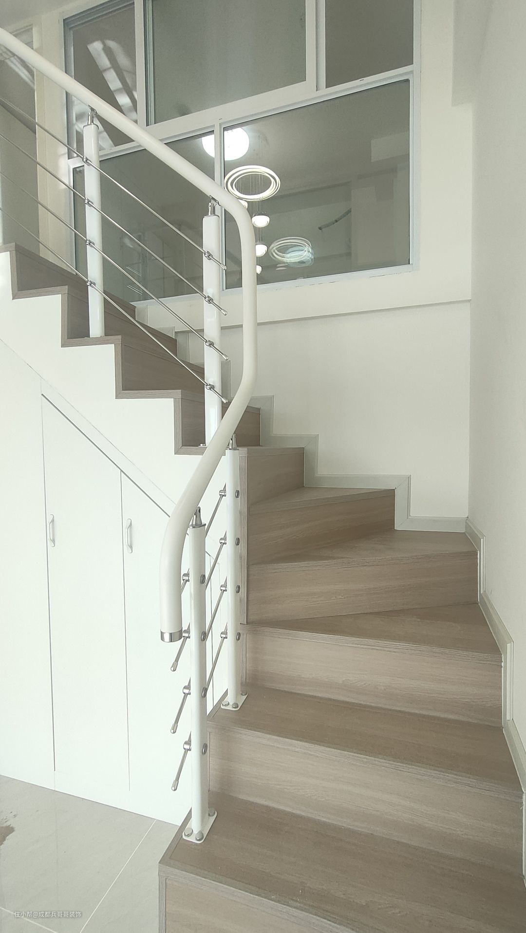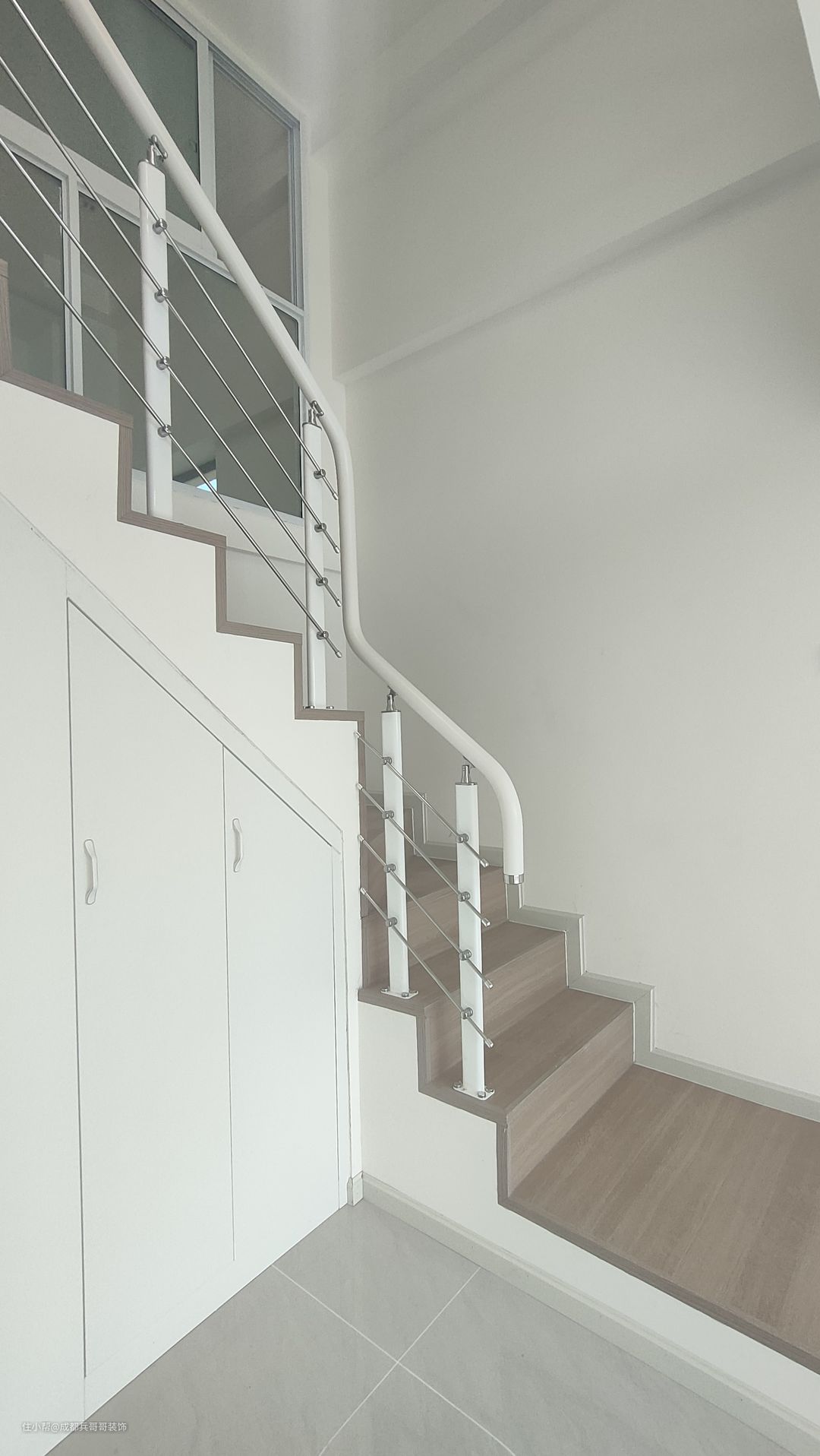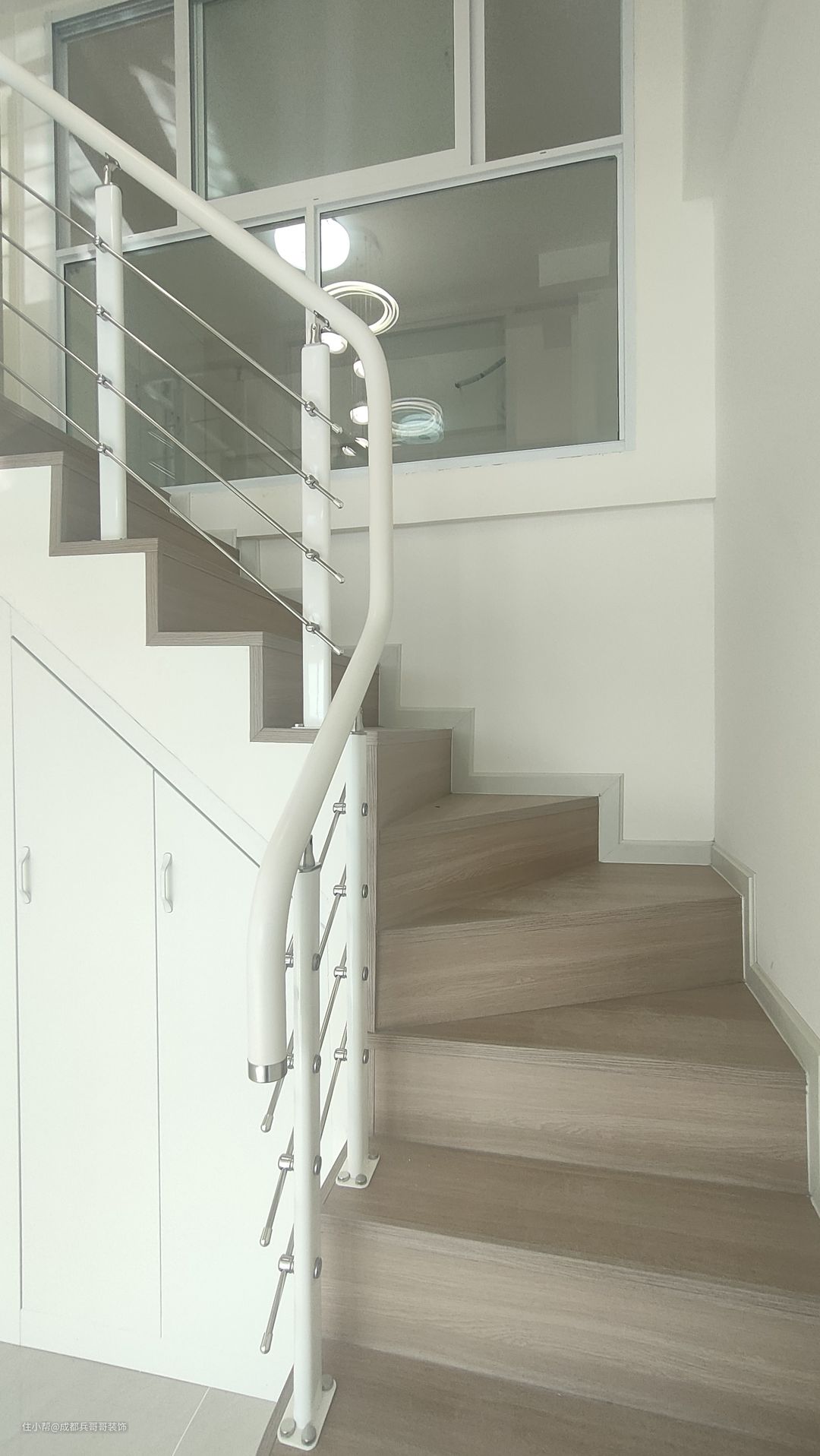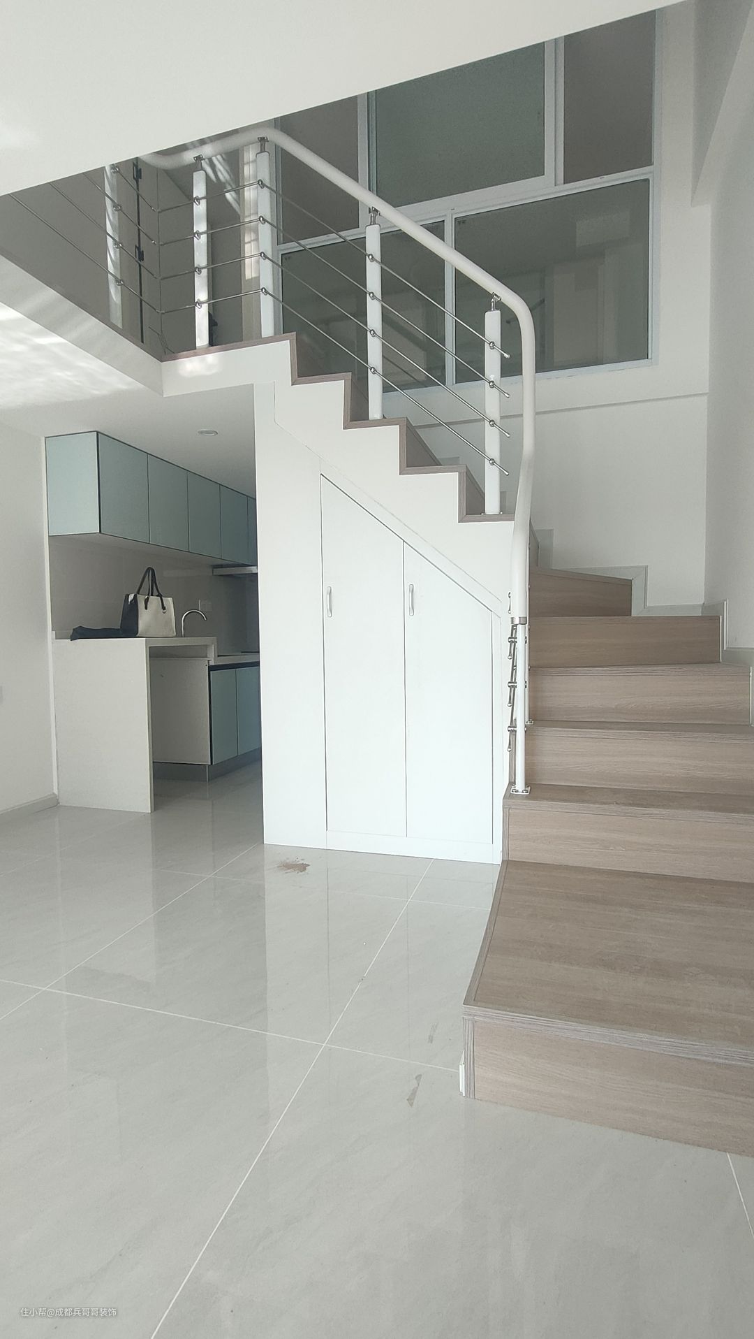 这套公寓楼梯最终选用L形楼梯连接一二楼,楼梯下方两侧都做了储物柜,将有限空间有效利用起来,整个房间也会更加整洁干净。 楼梯:木地板踏步+高分子扶手 楼梯踏步材质多样化,比较普遍的是木地板、瓷砖、大理石 公寓楼梯扶手常见的是:高分子扶手、实木玻璃扶手,当然也有橡木扶手、欧式风格扶手等等。 楼梯是钢结构楼梯搭建,花纹钢板+槽钢的搭配,后期做木基层再铺贴木地板,侧边呢石膏板封平,再刷腻子乳胶漆。 楼梯下方空间使用方法:空着什么都不做、做满满的储物柜、安装门做储物间、造景等等。