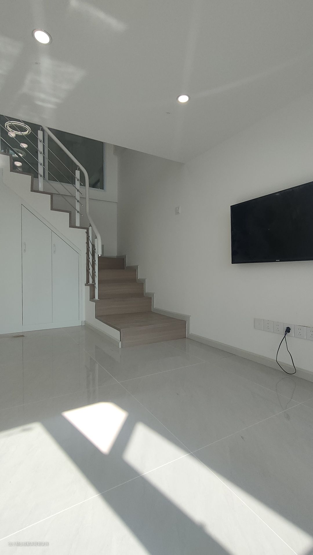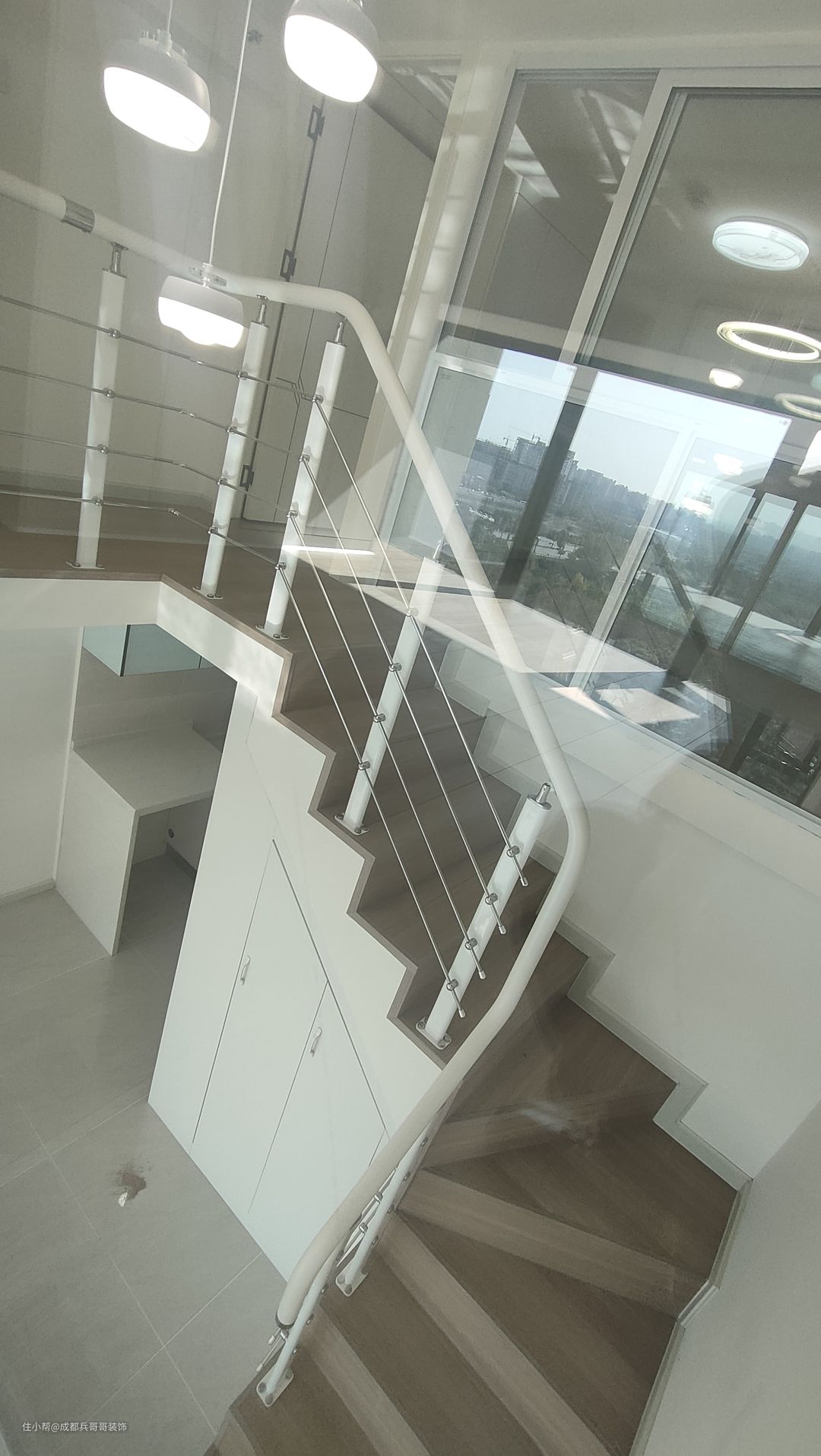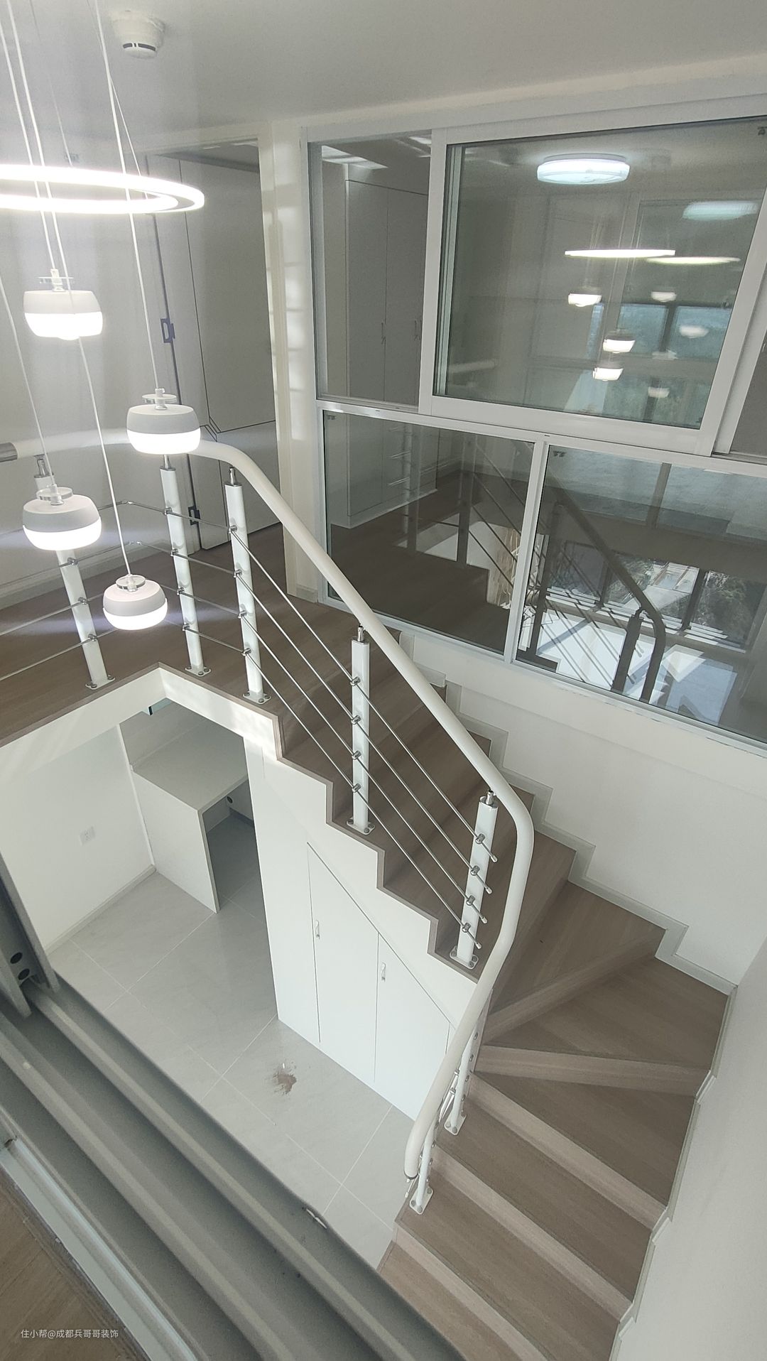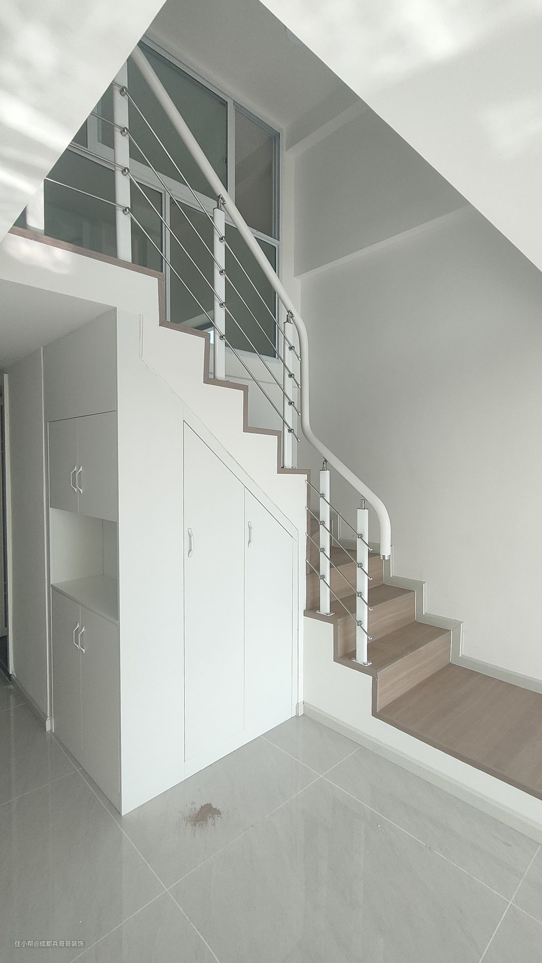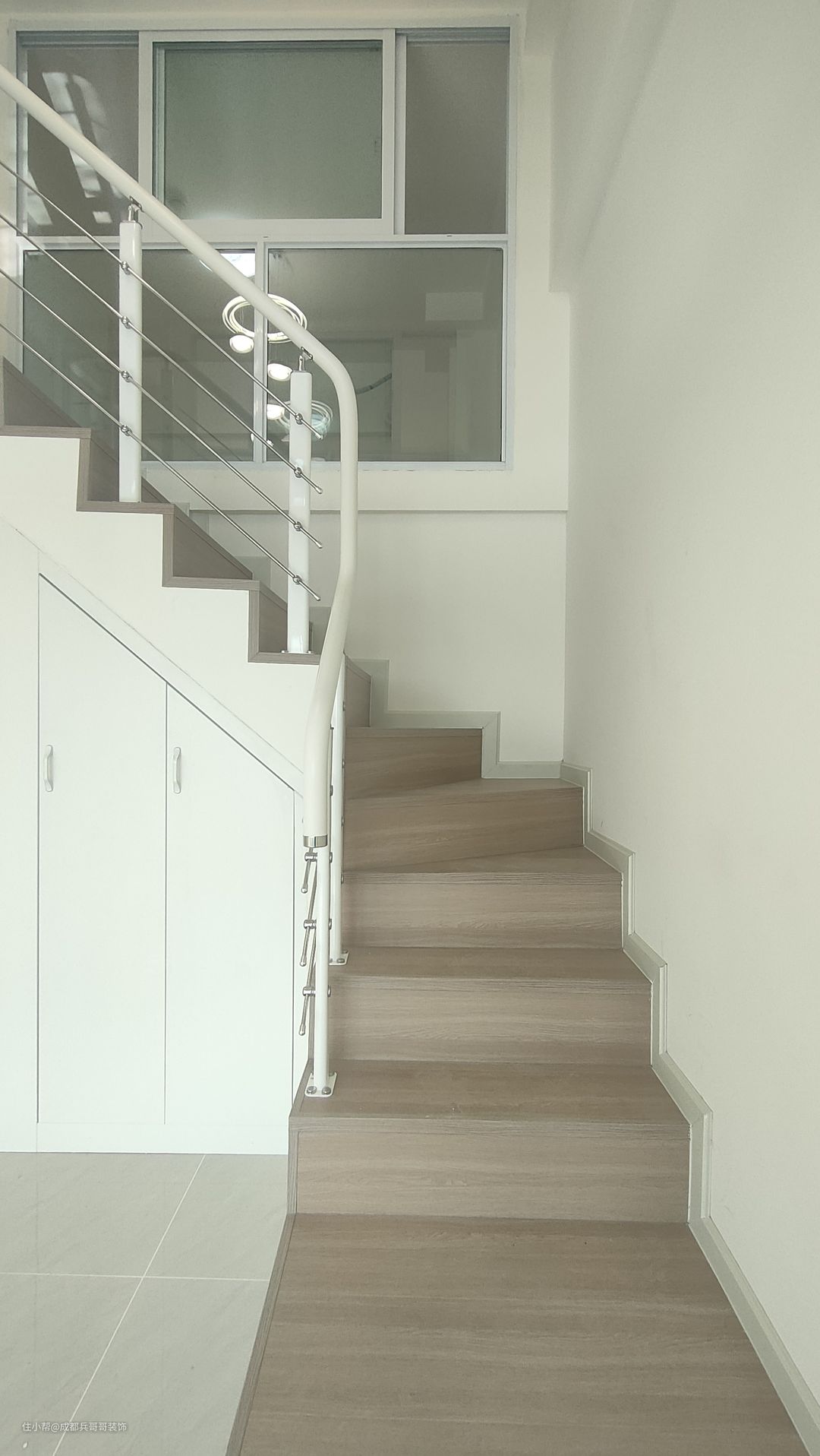 这套公寓楼梯最终选用L形楼梯连接一二楼,楼梯下方两侧都做了储物柜,将有限空间有效利用起来,整个房间也会更加整洁干净。 楼梯:木地板踏步+高分子扶手 楼梯踏步材质多样化,比较普遍的是木地板、瓷砖、大理石 公寓楼梯扶手常见的是:高分子扶手、实木玻璃扶手,当然也有橡木扶手、欧式风格扶手等等。 楼梯是钢结构楼梯搭建,花纹钢板+槽钢的搭配,后期做木基层再铺贴木地板,侧边呢石膏板封平,再刷腻子乳胶漆。 楼梯下方空间使用方法:空着什么都不做、做满满的储物柜、安装门做储物间、造景等等。