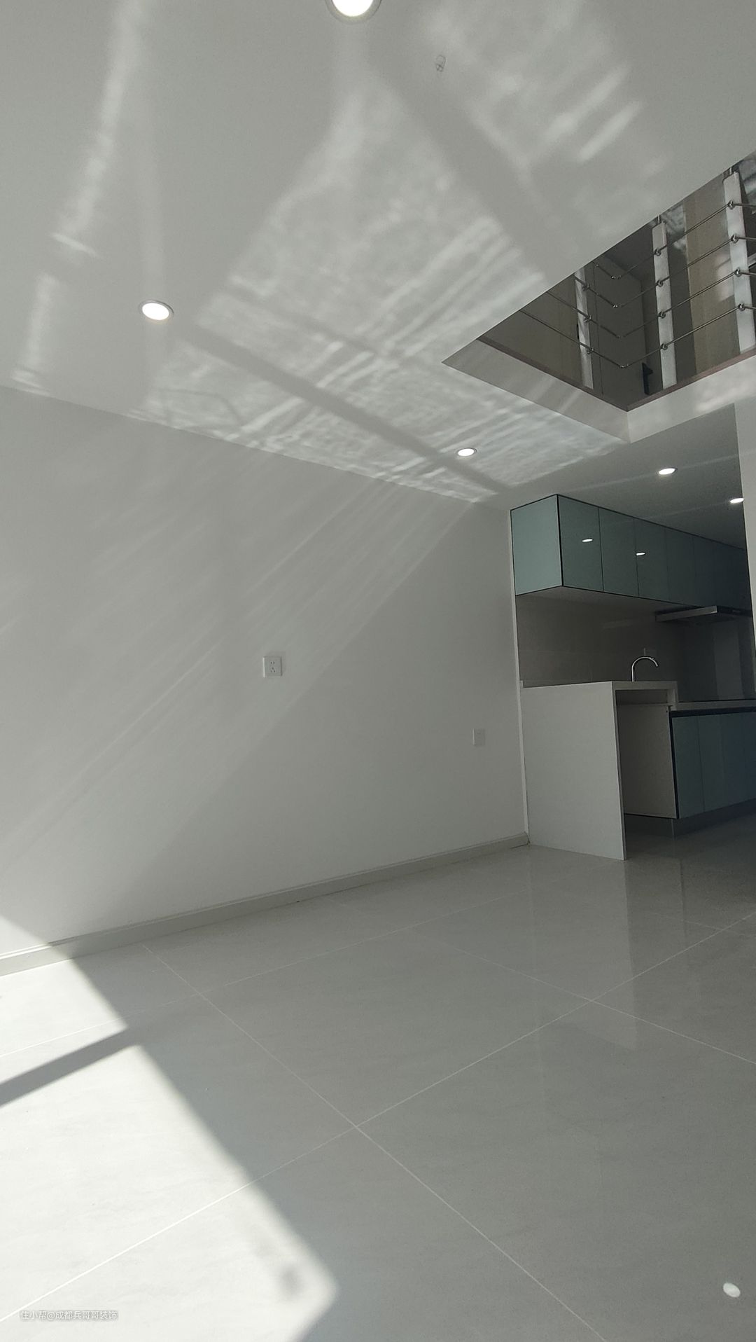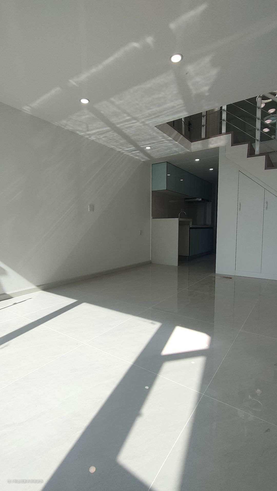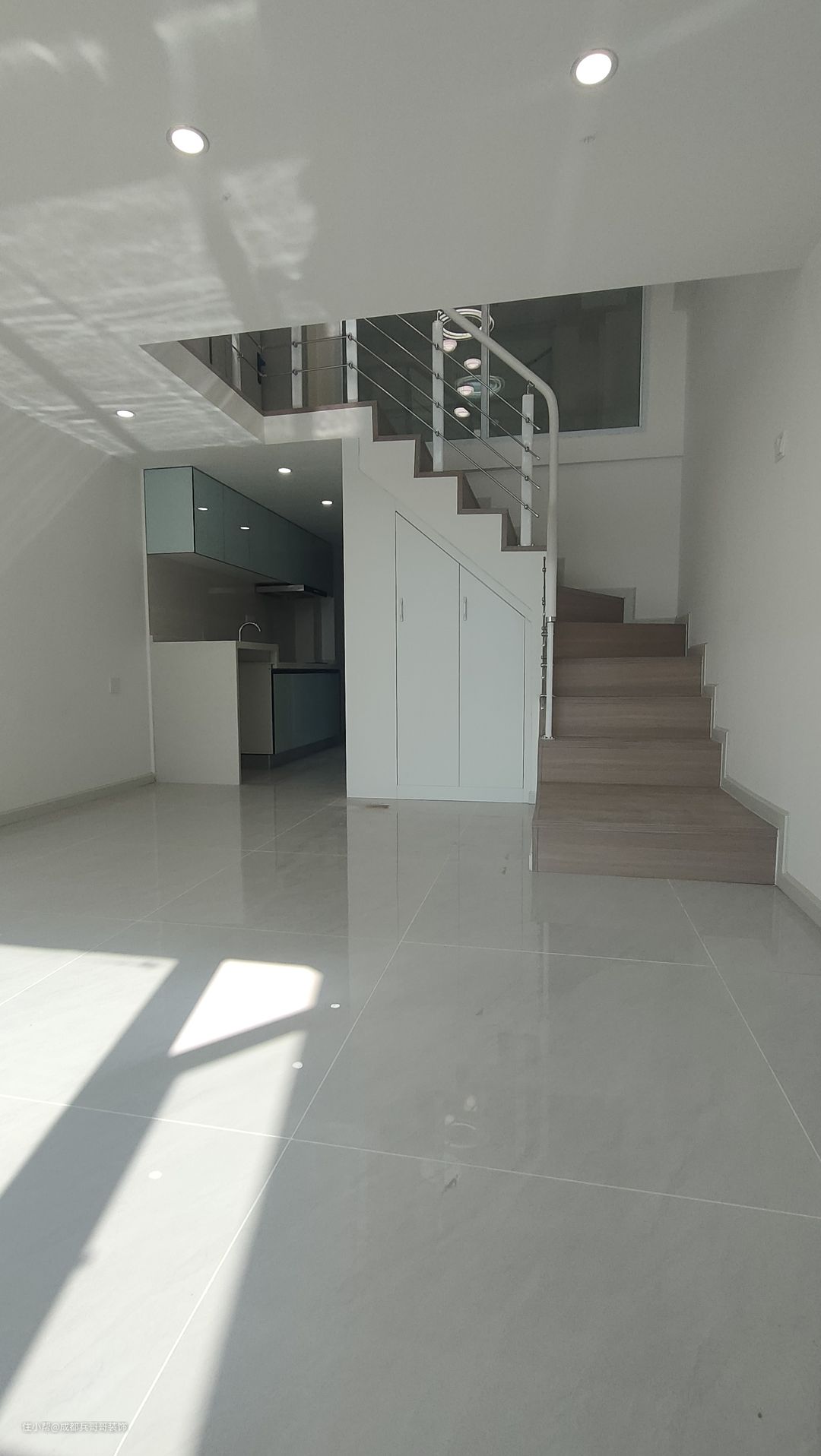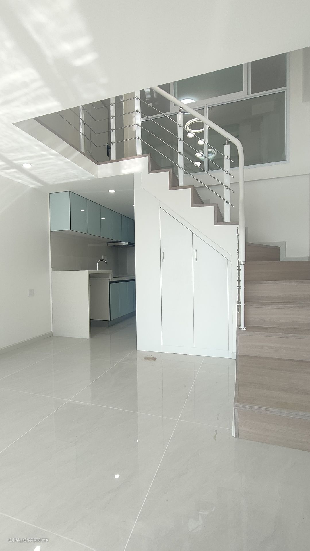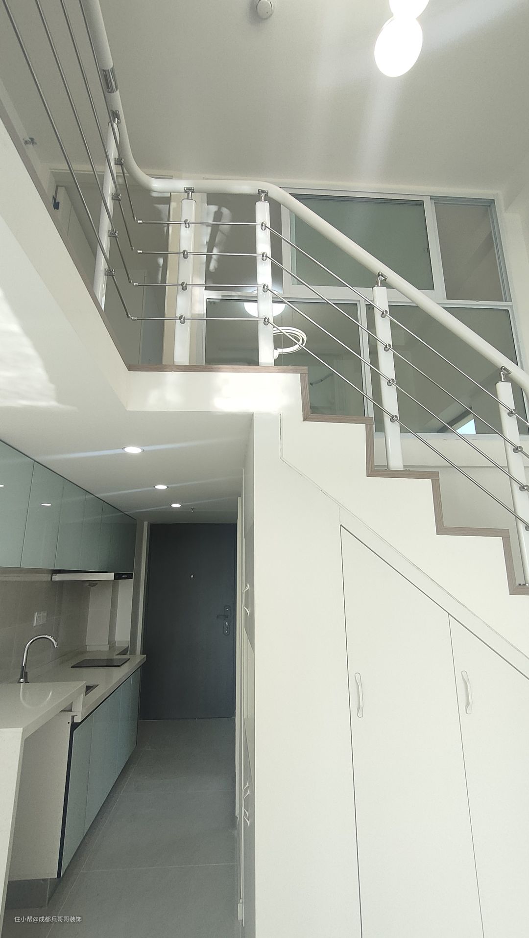 一楼入户空间,是镂空搭建的其中一边,阁楼下方布局是:左厨房+右鞋柜+卫生间+楼梯,功能布局合理齐全。
