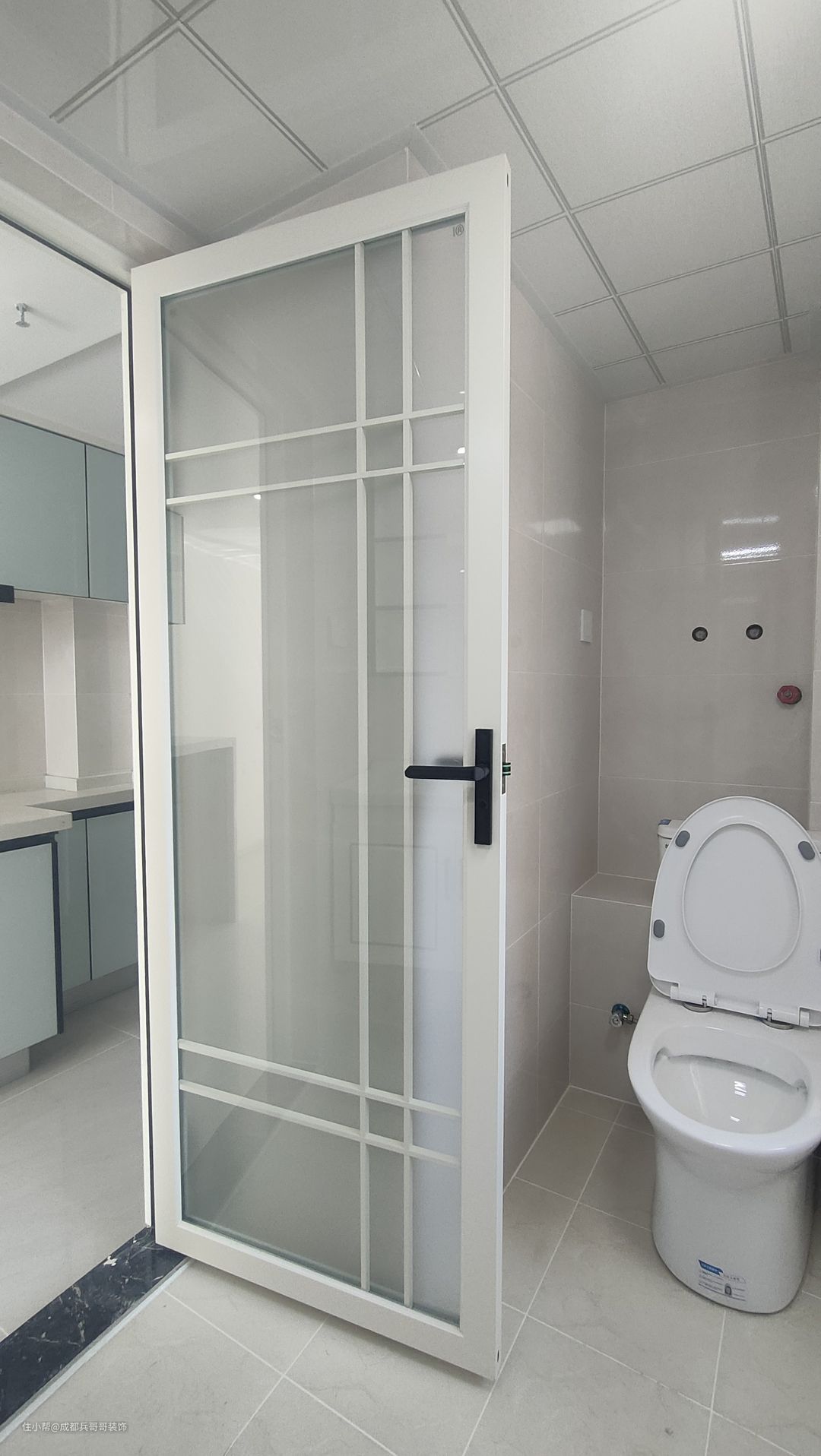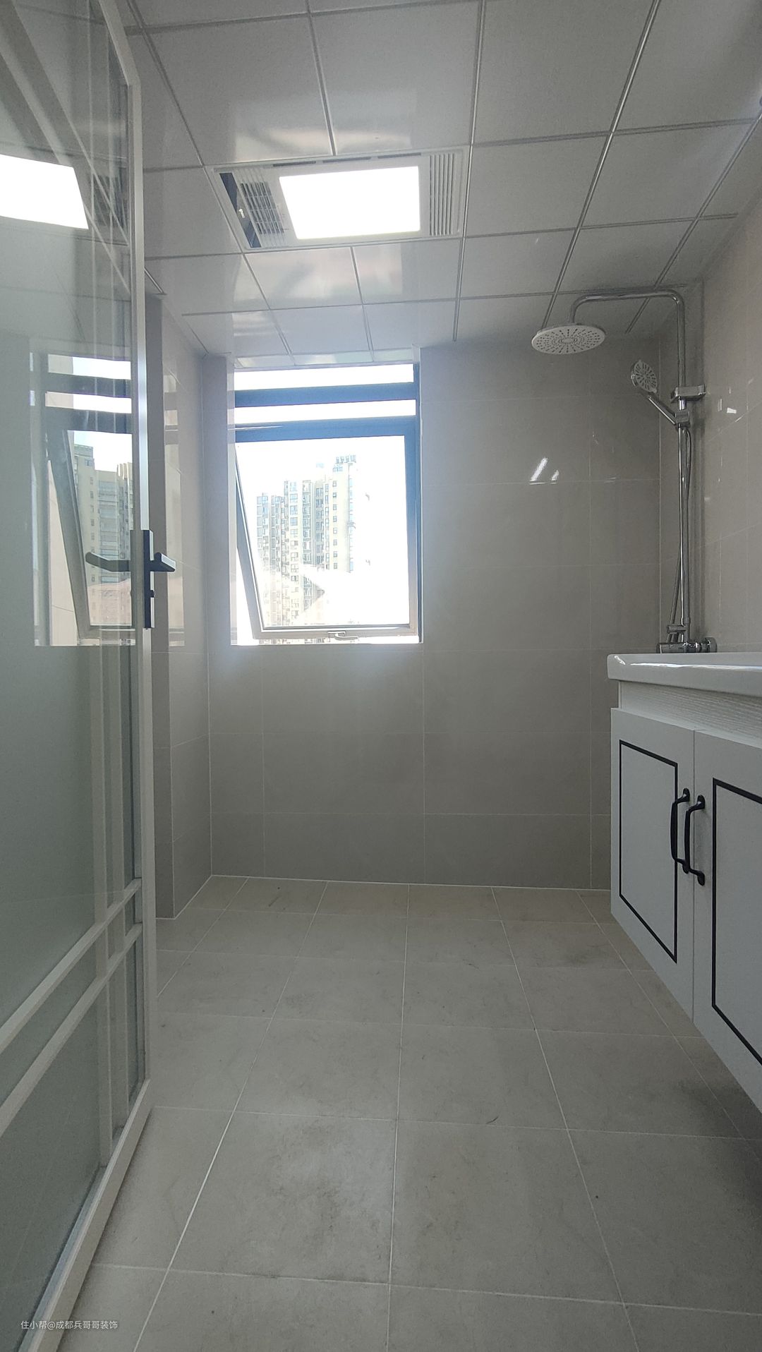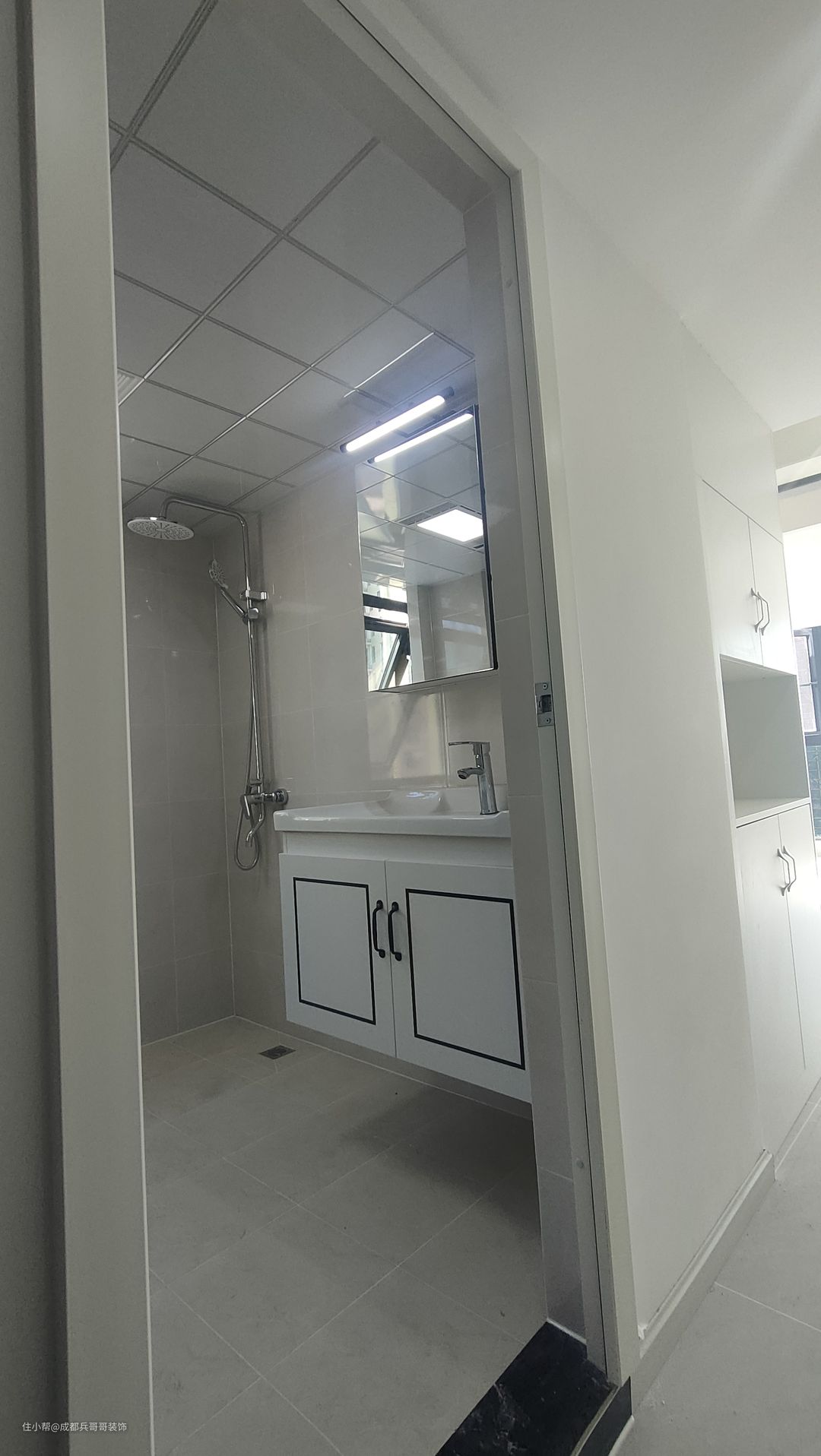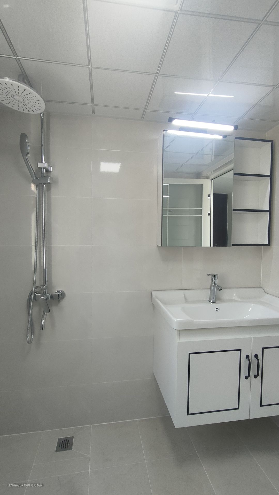 卫生间在一楼,里面空间:悬空浴室柜+淋浴区+马桶区,墙砖、地砖铺满,防水做了两遍,整体防水防潮效果很好。