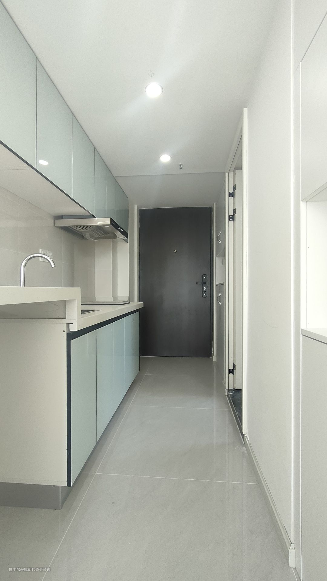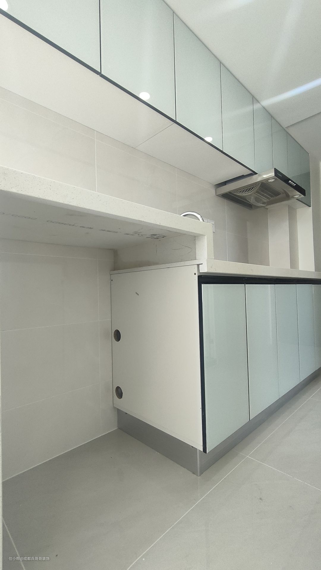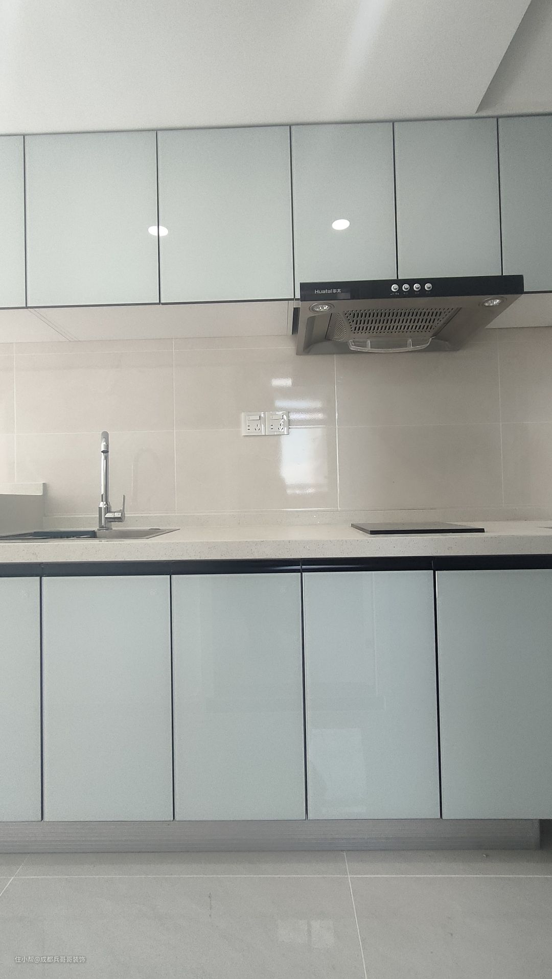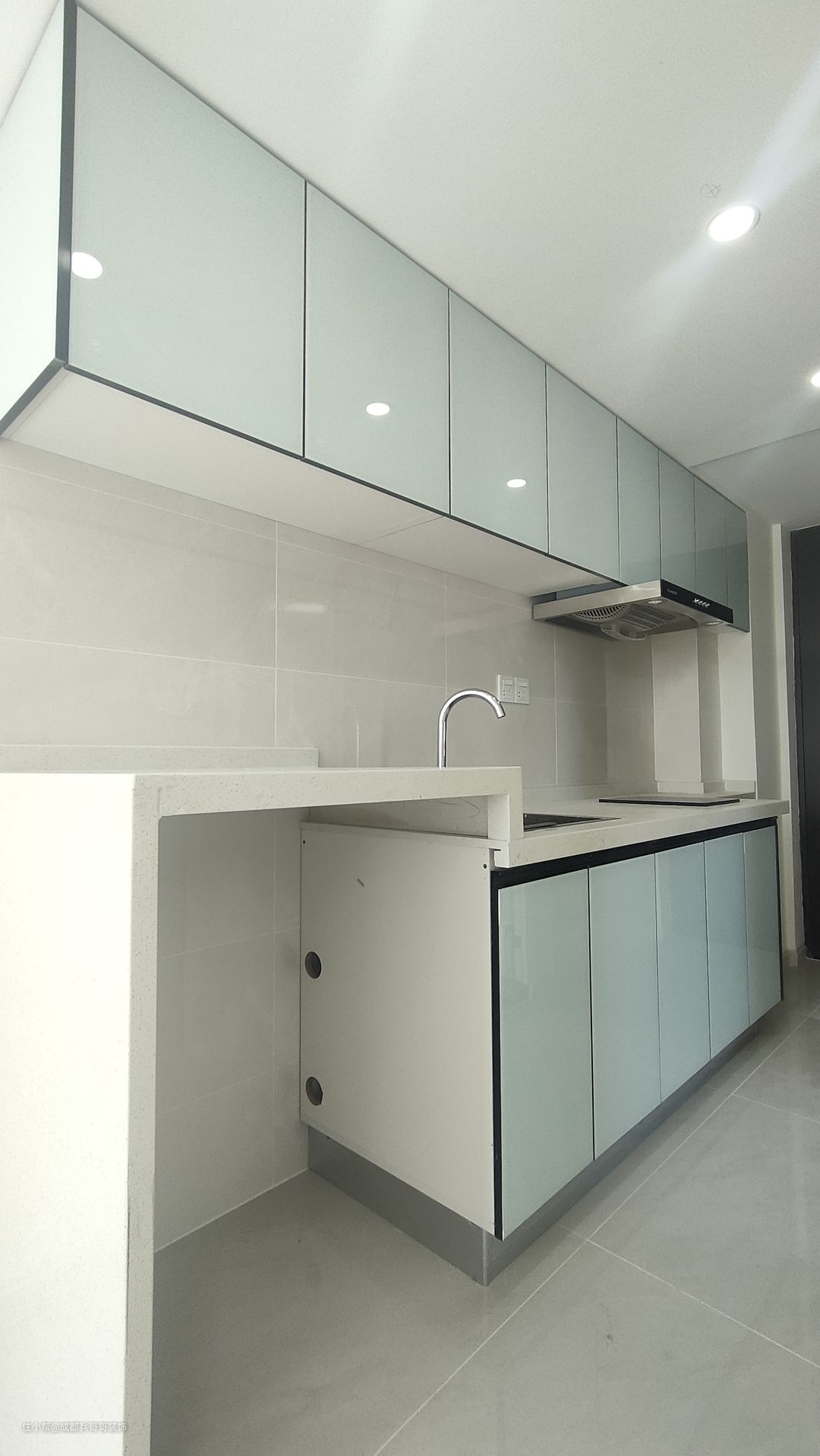 厨房,在一楼,整体一字形布局,一整排吊柜+地柜+嵌入式洗衣机,门板天蓝色高光板,色调简约干净,很舒适~~