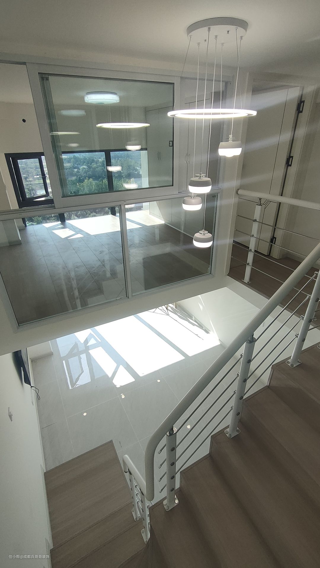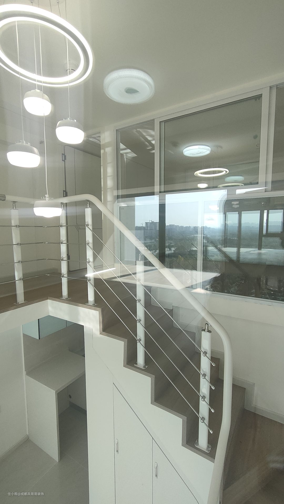 本套loft公寓采用中间部分挑空的设计,没有满搭建,那样会显得压抑,生活舒适性也会差很多。所以对于4米左右层高的公寓来说,挑空设计往往是较好的选择。而对于部分loft屋主来说,二楼既要保留两个卧室,又要挑空,这需要满足前提条件:公寓长宽尺寸至少是3米*8米,这要才能拥有不大不小的挑空区域,室内空间设计才有意义。 另外,设计挑空区域,会搭配各式各样的灯饰,有经济实惠的吸顶灯、有浪漫温馨的水晶灯、还有各类造型万千、个性化十足的其他灯饰。