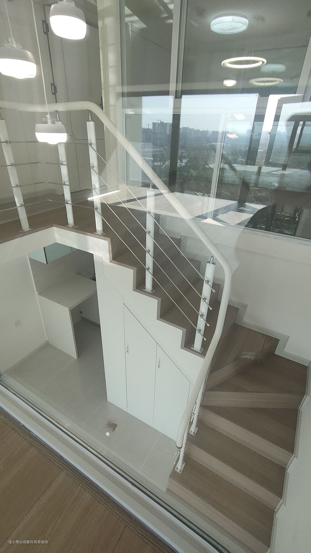 这套公寓楼梯最终选用L形楼梯连接一二楼,楼梯下方两侧都做了储物柜,将有限空间有效利用起来,整个房间也会更加整洁干净。 楼梯:木地板踏步+高分子扶手 楼梯踏步材质多样化,比较普遍的是木地板、瓷砖、大理石 公寓楼梯扶手常见的是:高分子扶手、实木玻璃扶手,当然也有橡木扶手、欧式风格扶手等等。 楼梯是钢结构楼梯搭建,花纹钢板+槽钢的搭配,后期做木基层再铺贴木地板,侧边呢石膏板封平,再刷腻子乳胶漆。 楼梯下方空间使用方法:空着什么都不做、做满满的储物柜、安装门做储物间、造景等等。