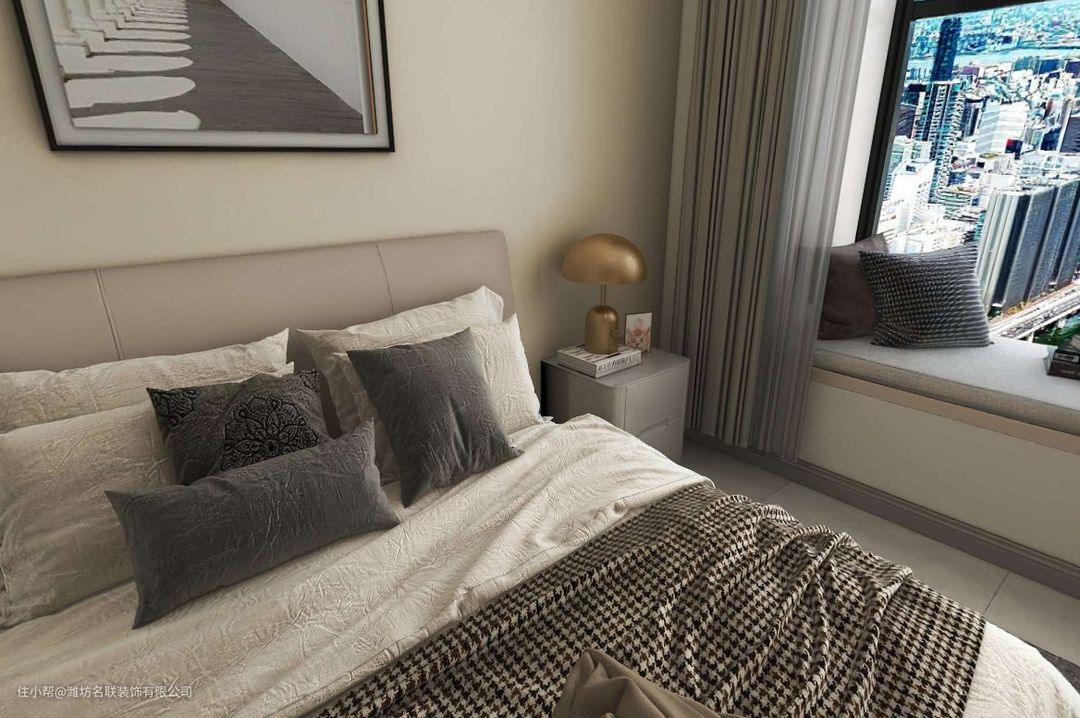 卧室整体设计连贯有序,不产生过多的复杂感,让舒适弥漫在每个角落,成为释放疲惫与治愈灵魂的休憩之所。阳光透过飘窗洒进室内,透出自然舒适的感觉,尽享慵懒时光。床尾定制一整墙的衣柜,左侧临飘窗打造出化妆台,定制了前后错落的柜体,这种设计打破了线性规则,形成逐层递进的视觉美感,也让空间更加灵活有趣。