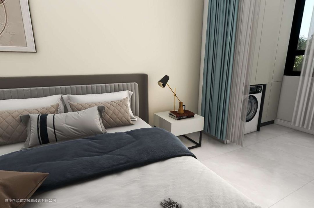 收纳橱柜+阳台懒人沙发,落座即刻观景。阳台与南次卧之间加装纱帘,拉上纱帘可遮挡阳台的衣服杂物,让整体更加整洁得体。阳台柜不仅预留了洗衣机烘衣机的位置,还打造了一个洗盥盆,方便小件衣服的清洗,也能够直接取水浇养家中种植的植物。