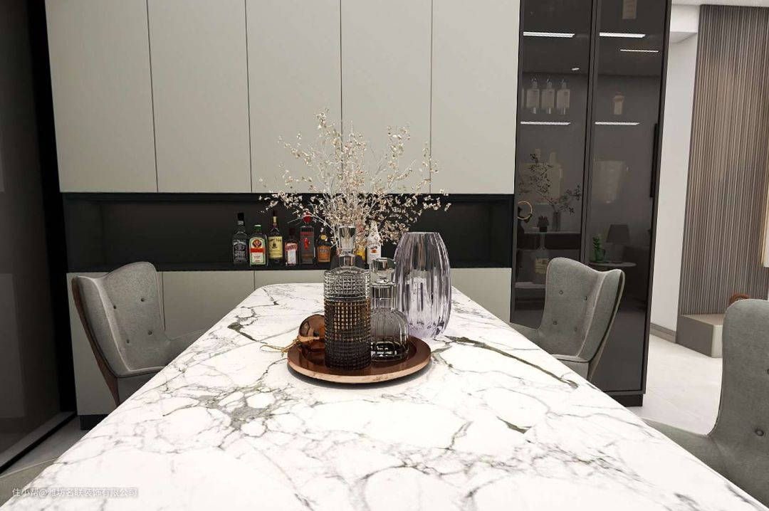 厚重感的餐桌搭配细腿的现代餐椅,完美中和,把空间衬托得灵活又大方;餐桌紧贴餐边柜,形成和谐统一的视觉,又能延伸餐桌台面。餐边柜开放与封闭空间分工合作,避免整面柜体带来的压抑感,也让餐厅有充足的呼吸空间。