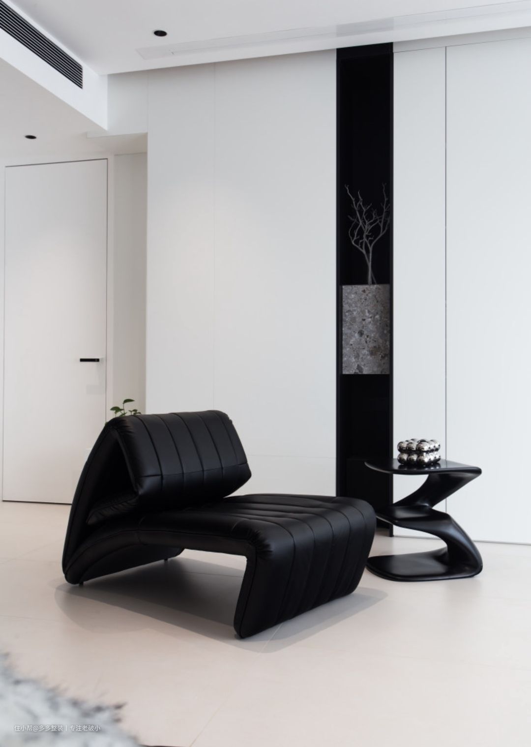 客厅整体以黑白灰配色为主,穿插水磨石纹理及铬色来点缀,给人极强的现代时尚感。 灯光采用无主灯的灯光搭配:顶面有射灯、线性灯、磁吸轨道灯以及暗藏于吊顶四周的反光灯带;柜子开放格暗藏氛围灯带,多组次的灯光搭配智能控制,营造丰富的居家场景。 两个造型特别的沙发成为空间的绝对主角。 灵活的客厅布局不限于沙发对着电视的摆放方式,在沙发对面做了丰富的收纳柜,顶面暗藏投影幕布;侧面黑色造型区域预留了电视机的位置,满足屋主不同的观影体验。 隐框涂料门融入整个墙体立面。空调预埋3D线型出风口和回风口,极简工艺的细节美在每一次。 储物柜的柜门用不对称的分缝方式处理,横向和竖向的开放格穿插其中,让立面的视觉体验更加丰富。 柜子高度做到原始顶,在平顶做反光灯槽修饰,让视觉有延伸感,让收纳更多,让层高更高。