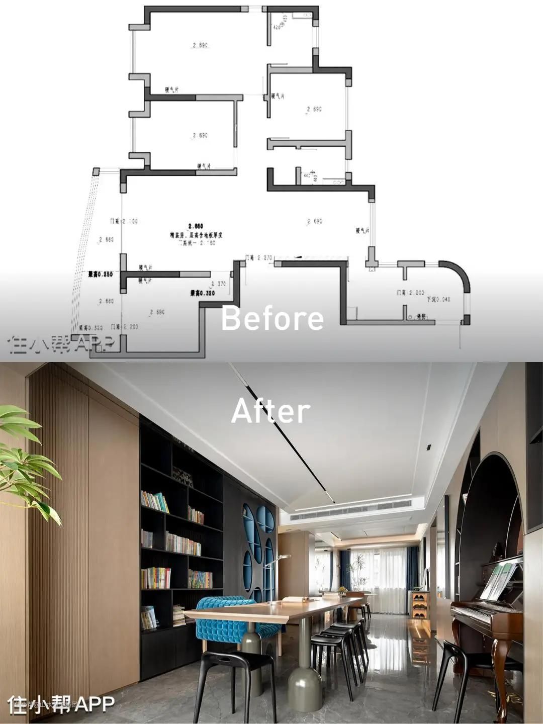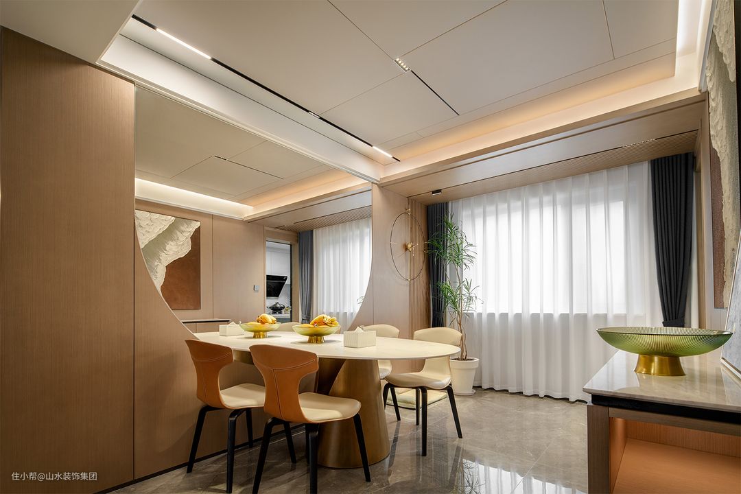 整体以现代简约风为基调,考虑到原本层高较低的限制,在客厅墙面采用曲面镜子来扩大视觉效果。 在布局上,摈弃传统,在客厅增加了书房和茶室的功能,满足日常需求的同时,让一家人有了更多的互动空间。
