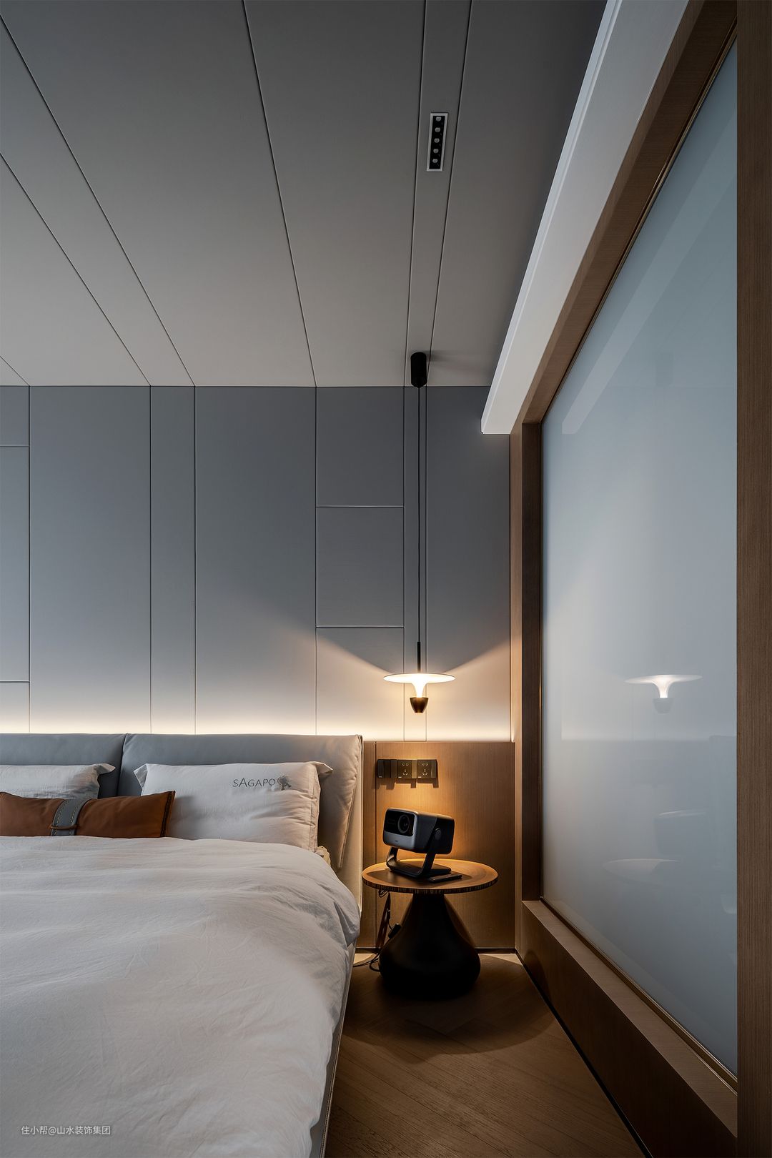 主卧私区,充满清新淡雅之感。空间整体以灰色与蓝色主,简单的线条与精致的软装,给人“少而精”的美感。