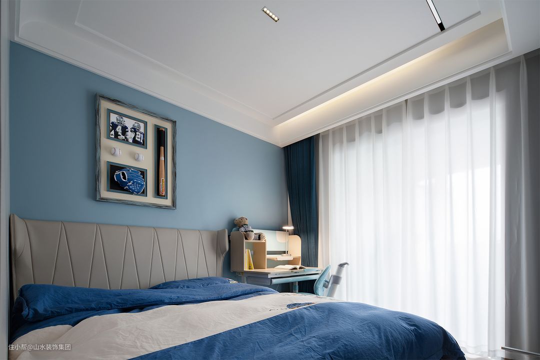 儿童房更追求简洁与舒适性,整体选用色调偏低的天蓝色,配合家具软装营造空间的灵动感,给孩子打造了一个心仪的快乐成长空间,童趣满满! 白蓝相间,收纳充足的同时张弛有度,呈现出自由随性的气质,温润、优雅气息扑面而来。