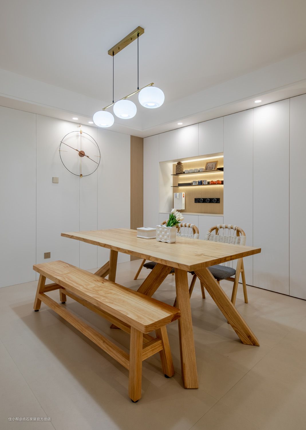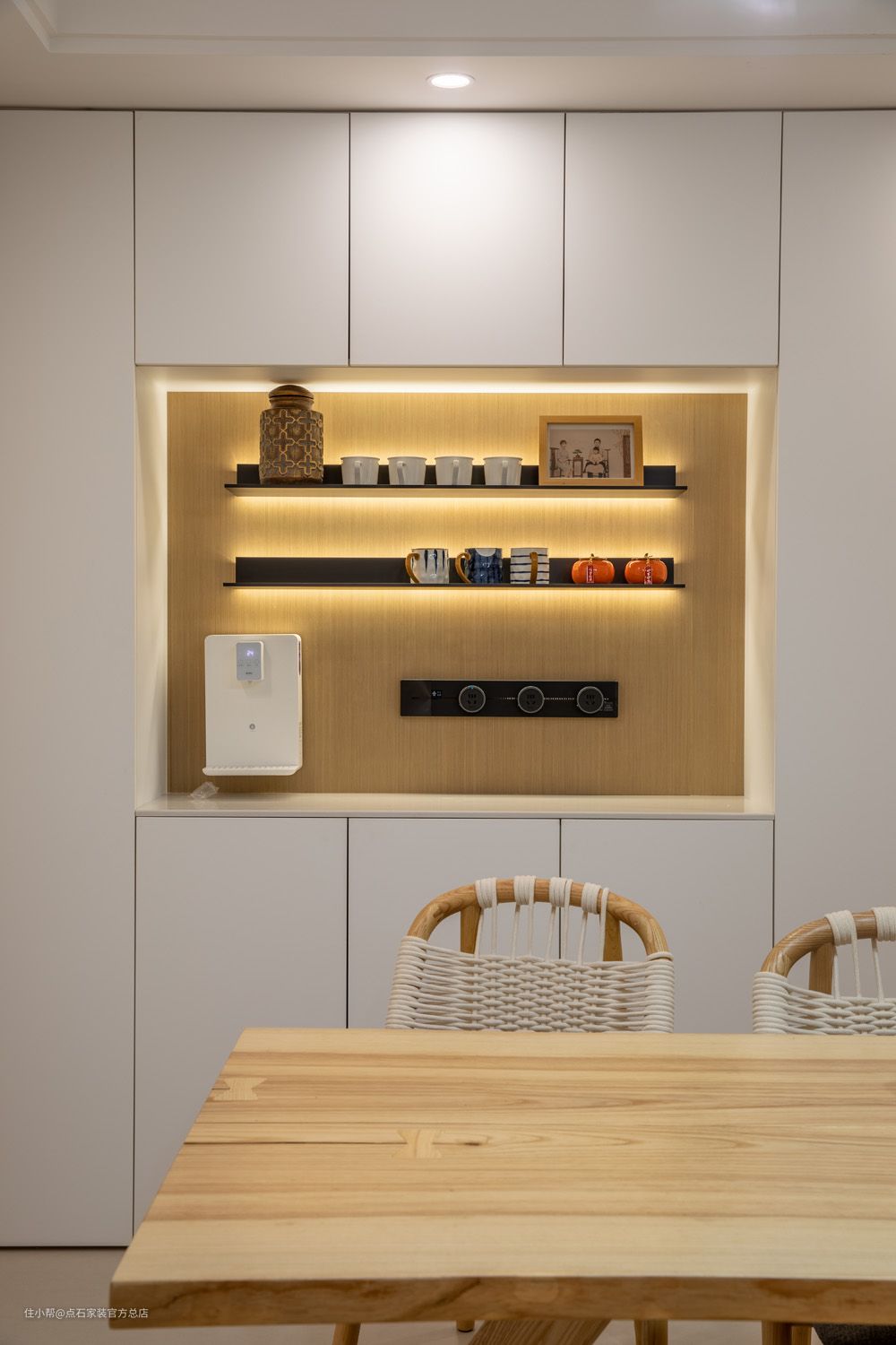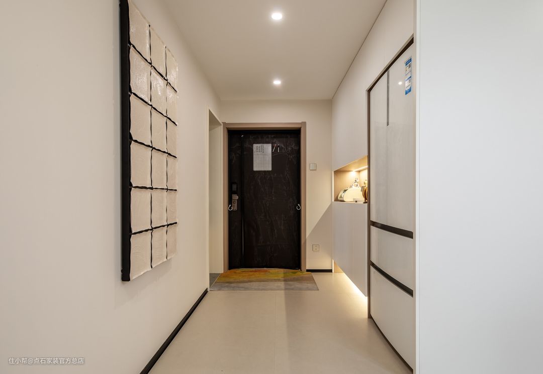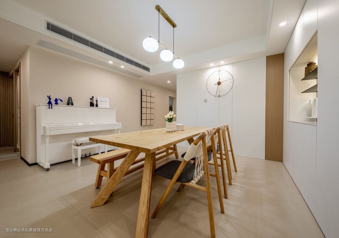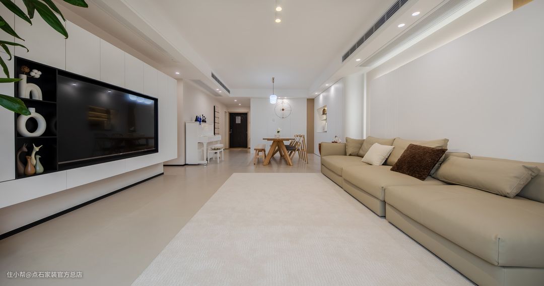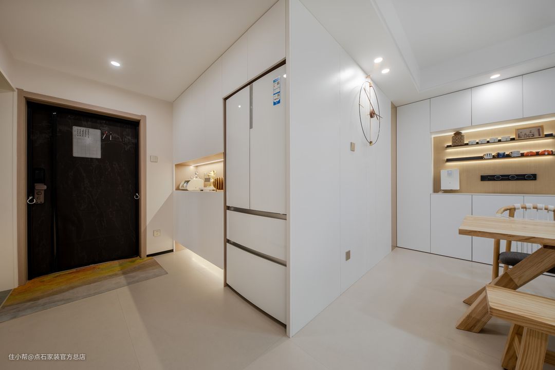 餐厅家具简洁的材质、纹理、触感的细节,无不表达出对生活品质的追求。大面积白色的运用,形成强烈的视觉符号,餐厅玄关鞋柜与客厅电视柜 一体化的设计,既增加了空间的收纳属性也将其设计成电视背景的其中一部分,白色亮光烤漆本身材质的镜面属性也有延伸空间的效果