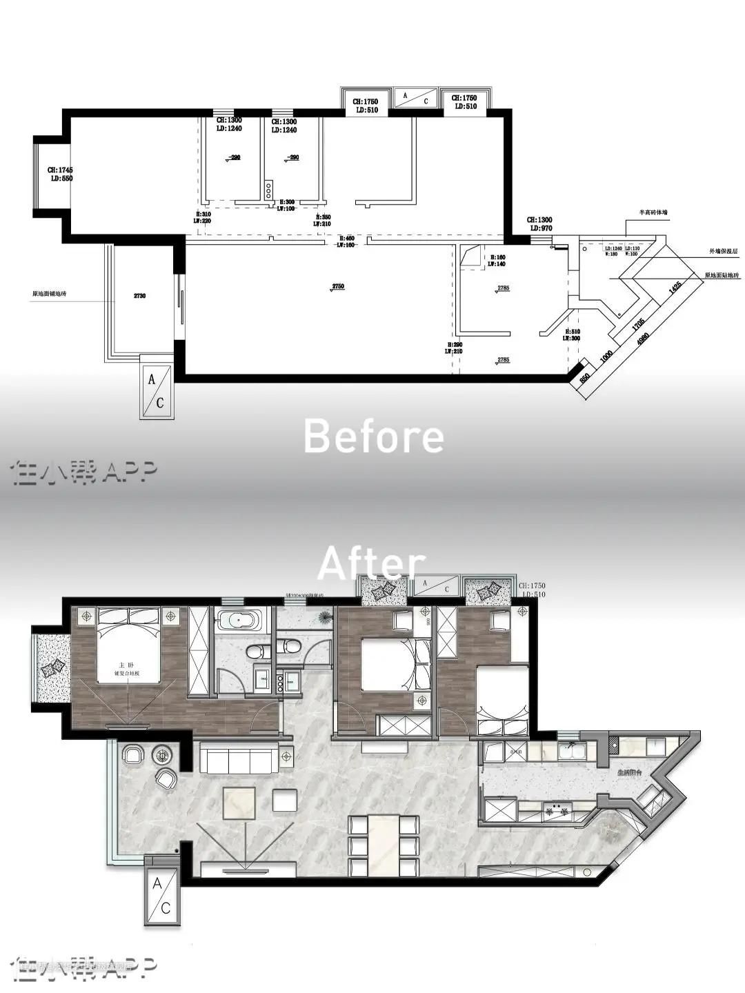 本案属于一个异形房型,屋主为一对年轻夫妻,有两个可爱的女儿,独具浪漫情怀,希望 房子温馨实用,不要有太多尖角。 户型解析 1、玄关、厨房外阳台空间不规整,操作受限 2、中部次卧较小,空间利用率不高 优化改造: 1、进门右侧定制鞋柜与弧形造型墙自然衔接,隐藏空间尖角,再以灯带装饰,设计感十足 。 2、厨房外阳台改为独立洗衣区,根据墙体结果定制洗衣台,洗衣机嵌入角落,让空间结构 更规整。 3、将走道空间纳入次卧,同时改变两间次卧开门方向,使空间分配更合理。