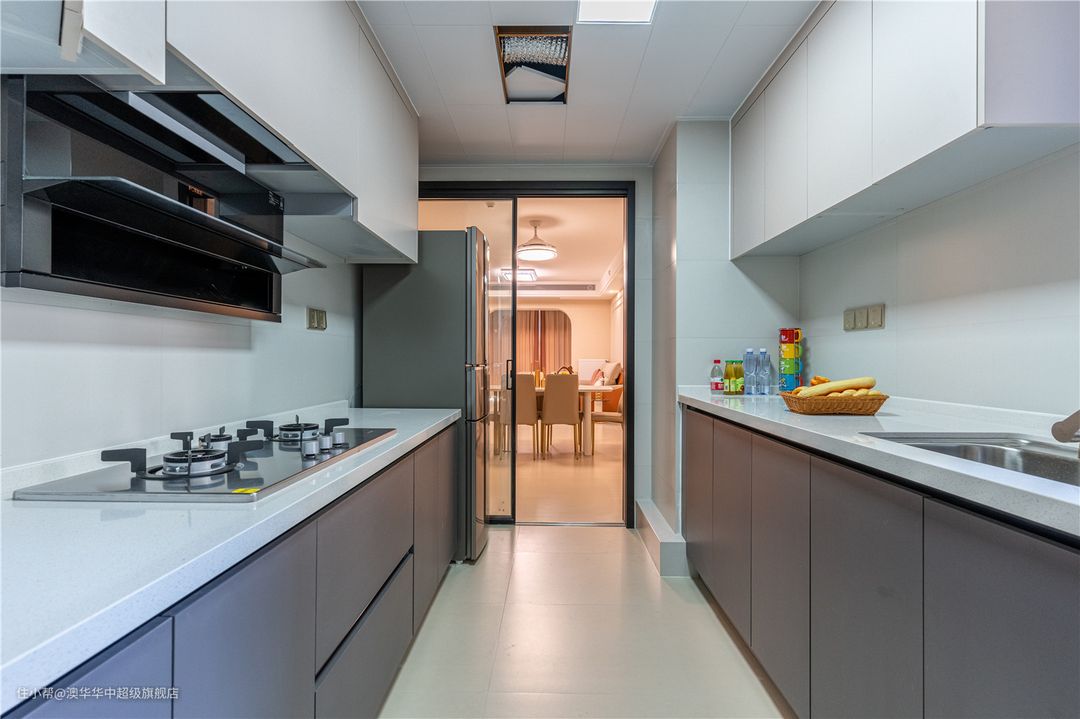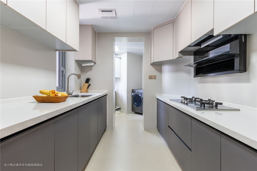 1、厨房与生活阳台打通,采用经典灰白配色,营造出简洁、通透、干净、纯粹的生活感受。 2、定制橱柜形成有序的功能排列与一字型动线,一站式满足烹饪及收纳的需求。