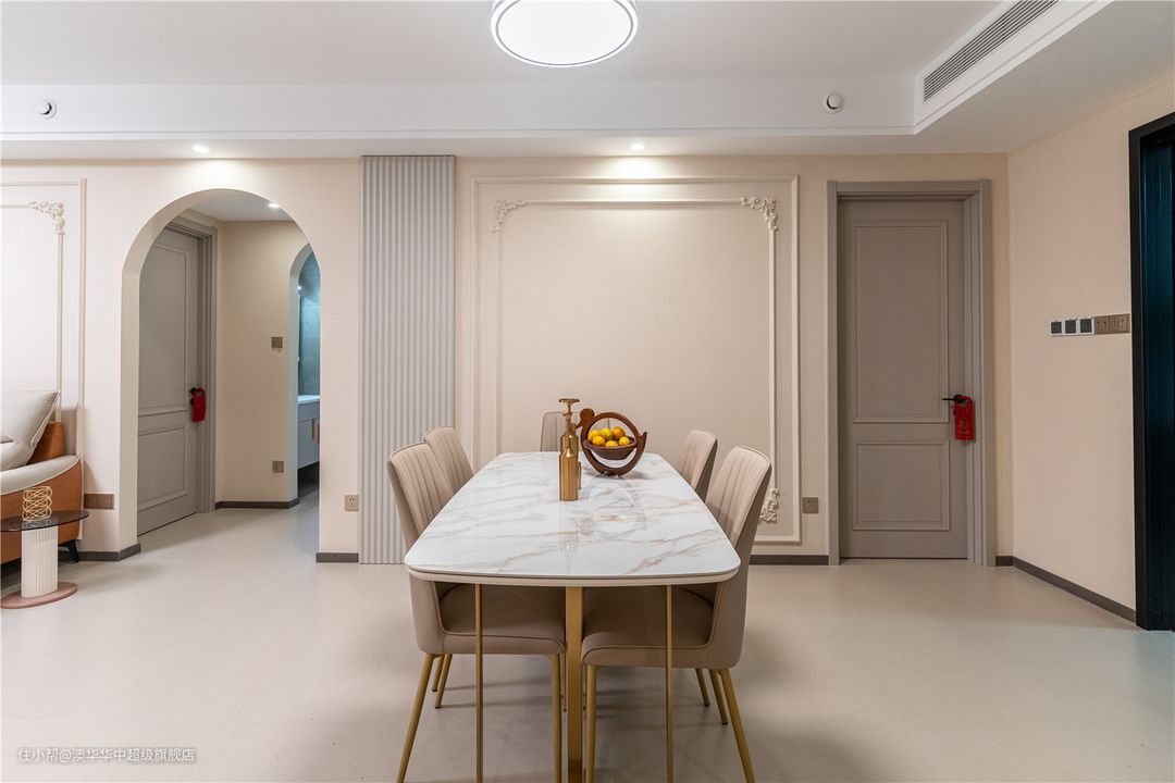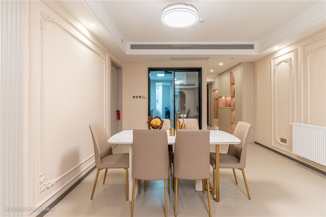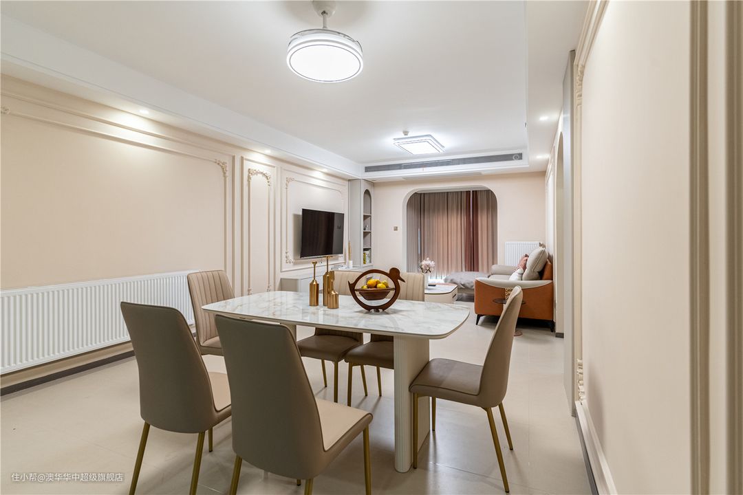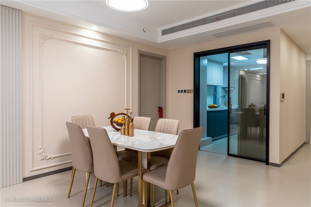 奶油色皮质餐椅、大理石餐桌,简约又精致。金色桌椅腿与客厅茶几呼应,更美观和谐。