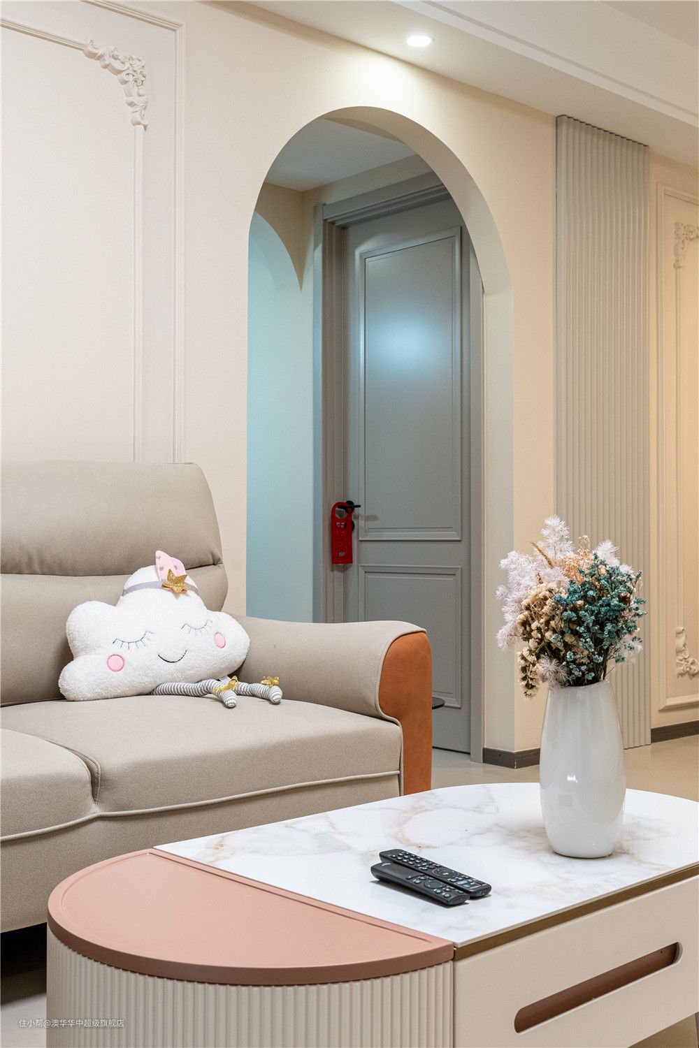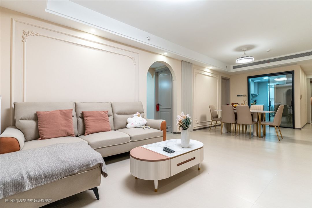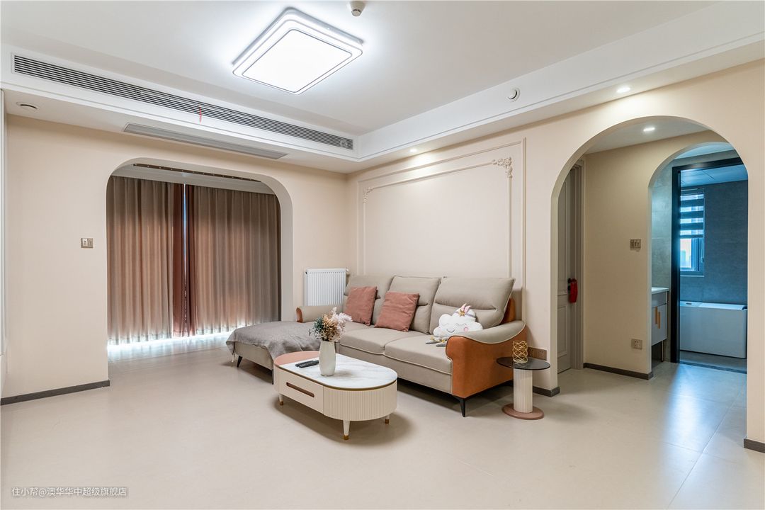1、选用高脚布艺沙发与茶几,底部留空较多,平时扫地机器人可以自由出入。 2、茶几局部粉色点缀,与抱枕、窗帘色彩一致,丰富色彩感官的同时也让居室氛围更柔和。