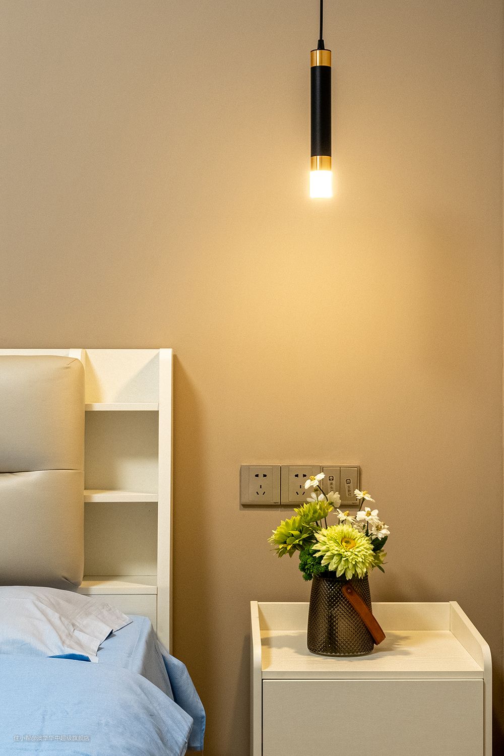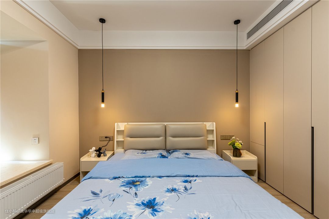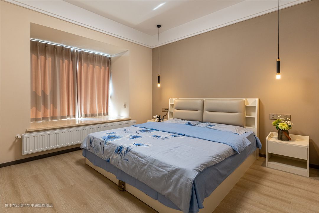 奶白色的大床自带温馨氛围,搭配蓝色系柔软床品,使居室氛围更趋于静谧、安宁。窗帘与客厅保持一致选用粉色系,契合女主人温柔细腻的内心。