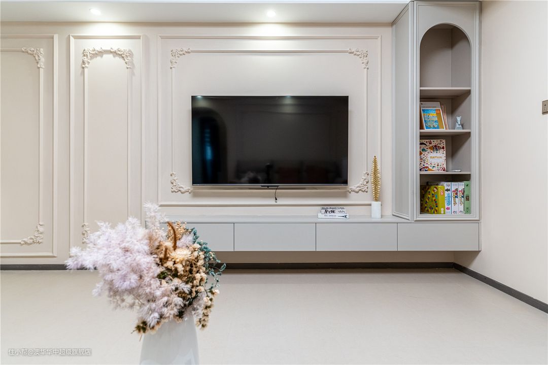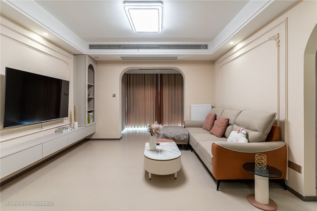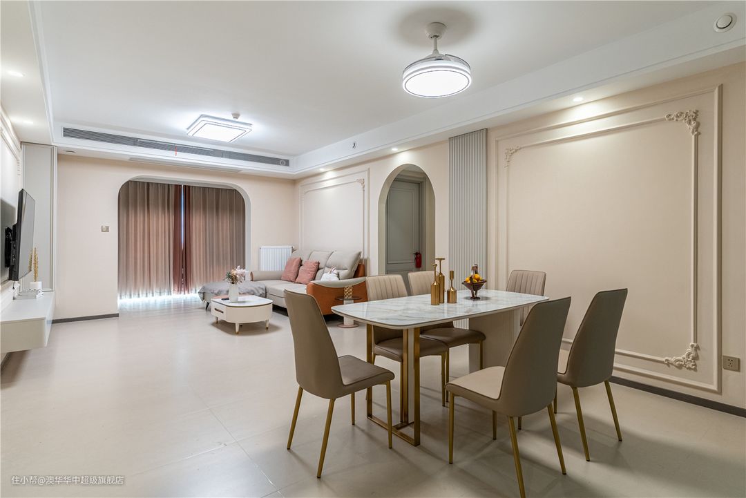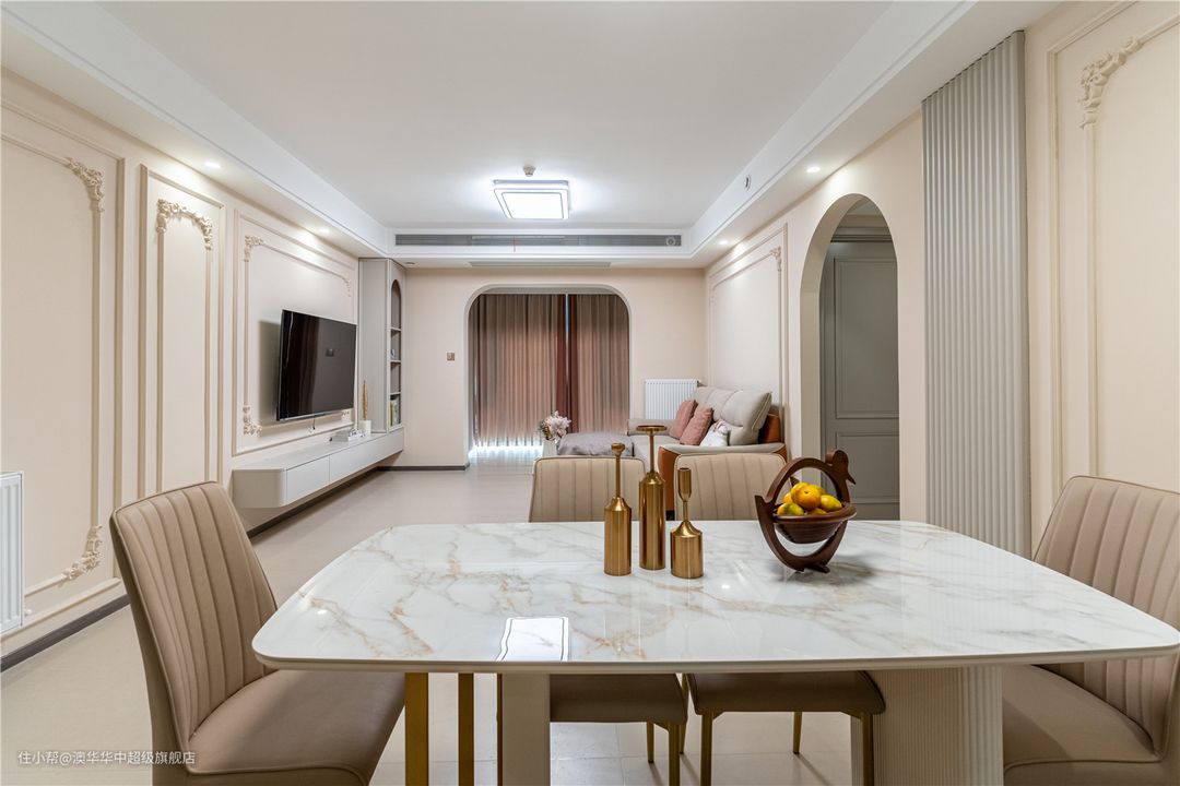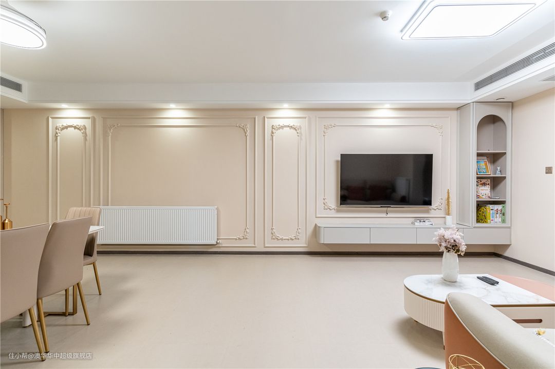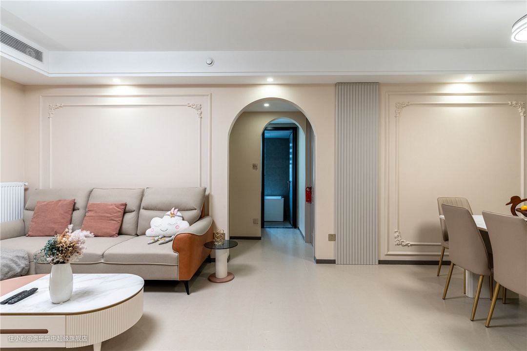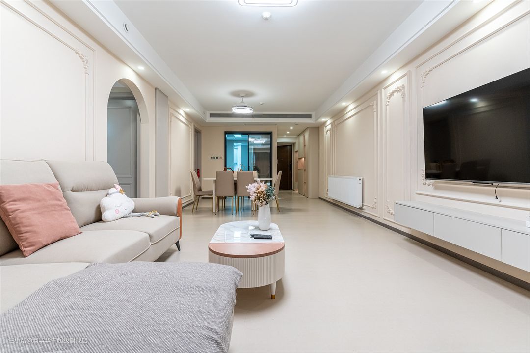 1、拆除客厅与阳台之间的推拉门,采用地砖通铺,扩充公区面积,有效提升室内采光。 2、电视背景墙以石膏线、雕花装饰,且延续至餐厅背景墙,进一步延展了视觉。同时定制L型悬浮电视柜,补充了收纳也增添了层次感。 3、沙发背景墙与餐厅背景墙以弧形门洞自然衔接,墙面设计与电视背景墙呼应,和谐又美观。