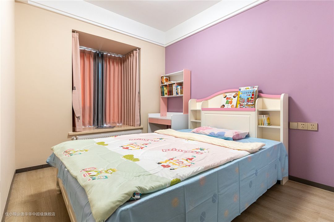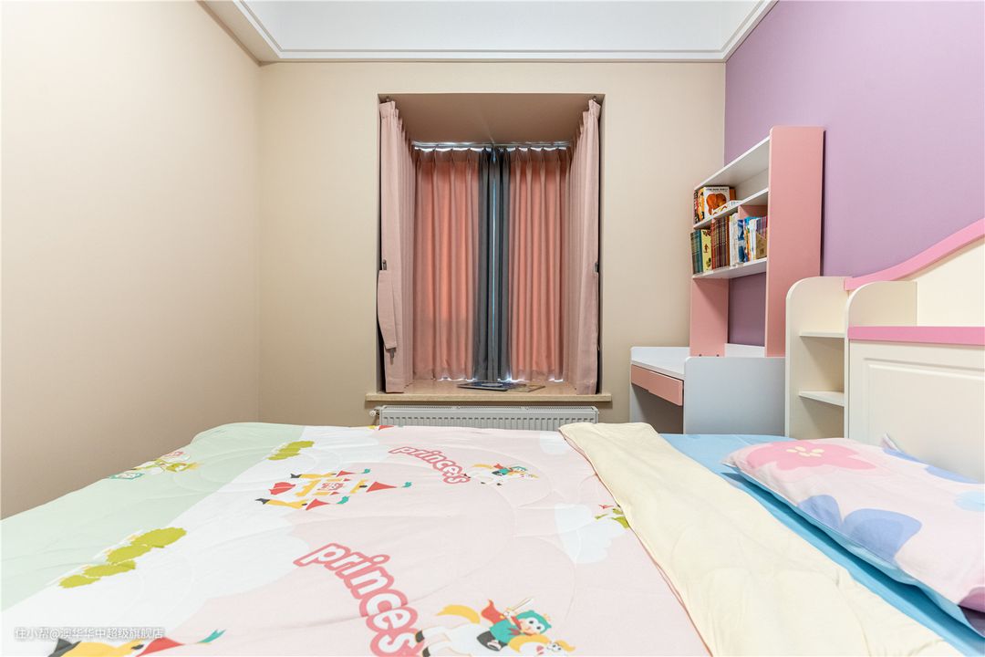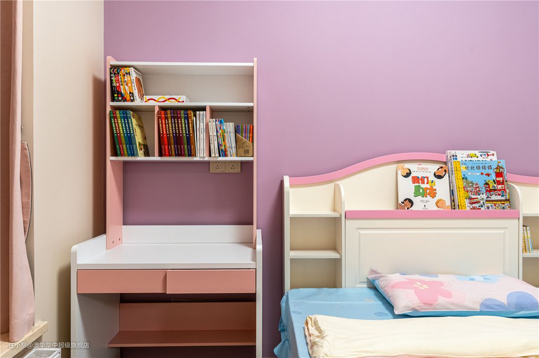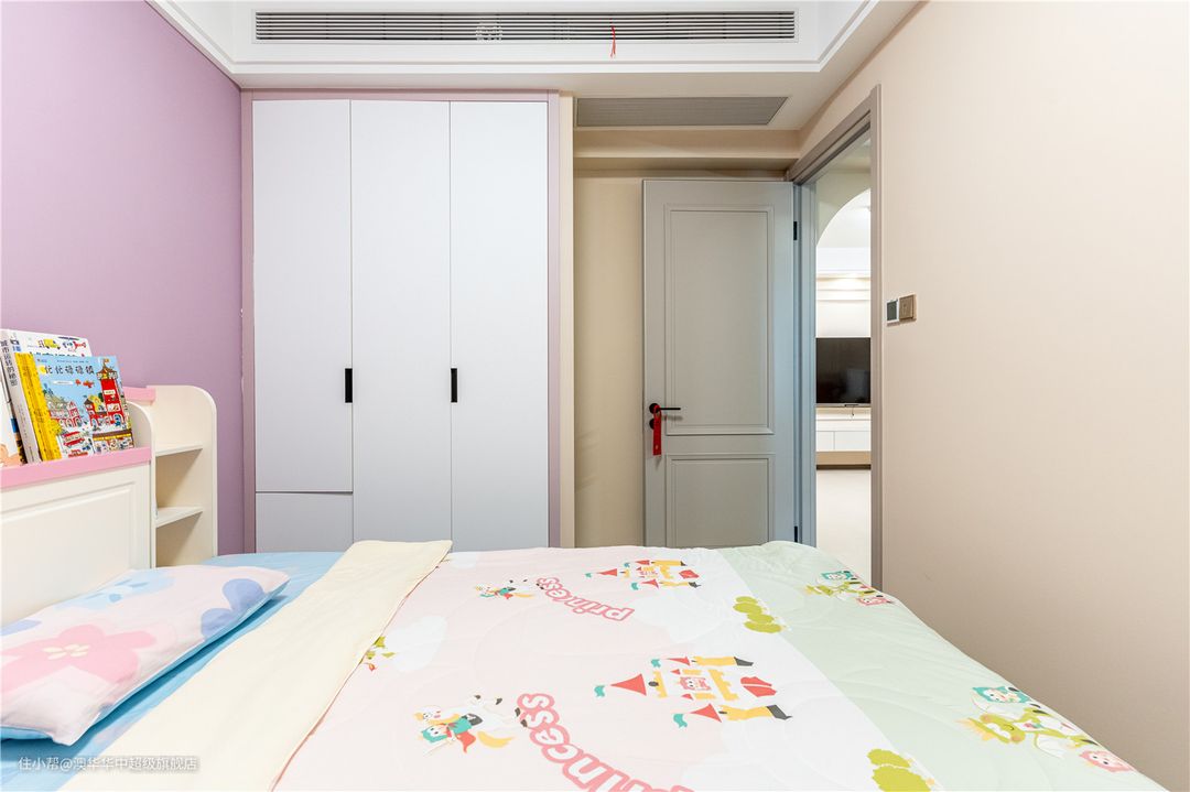 1、墙面主要以奶油色为主,床头墙面选用粉色系,满足小女孩的喜好。 2、定制白色系衣柜,以粉色包边,视觉上更显清透,同时不失温柔质感。