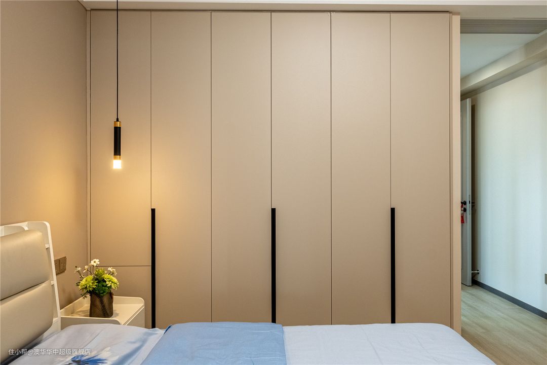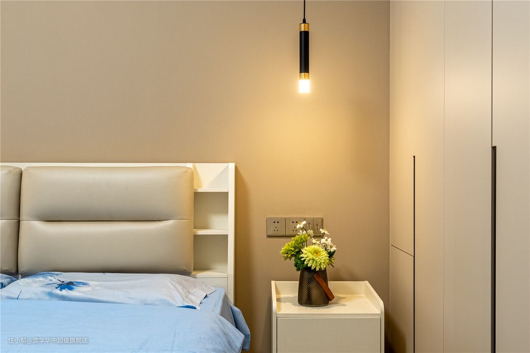 1、以低饱和度奶油色渲染整体空间,营造一种被细腻奶油包裹的温柔氛围,搭配原木色地板,让空间愈发静谧舒缓。 2、床头背景没有多余的装饰,以纯净底色给人清透的呼吸感;线性吊灯呈对称方式展开,简约不失精致。