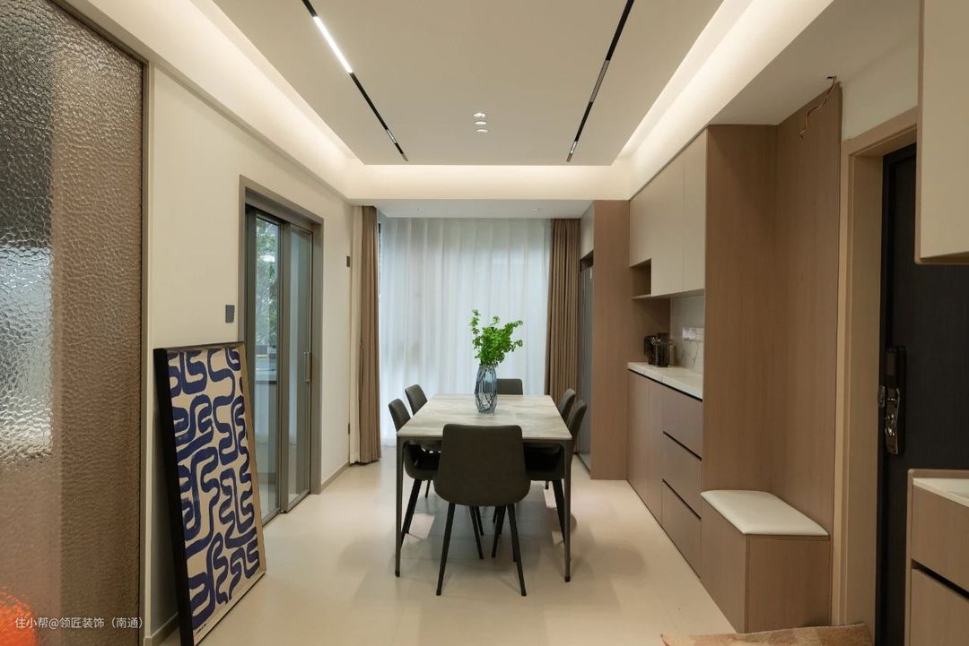 02 餐厅:呈现生活的多重美好 餐厅没有做过多的繁杂的装饰,通过玻璃玄关实现空间分隔。 既能保证居室的通透性,又起到了保护隐私的作用,给空间增添了别致的氛围感。