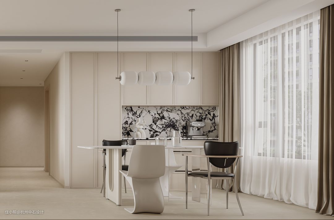 客厅边上是餐厅,设计客餐厅一体,空间更显通透,同时动线上更加灵活。餐边柜的设计增加了客厅和餐厅的储物空间,一眼被餐台的宝格丽大理石吸引,让整个餐厅瞬间提升了格调。再加上厨房移门采用了长虹玻璃移门,若隐若现的太精致啦~